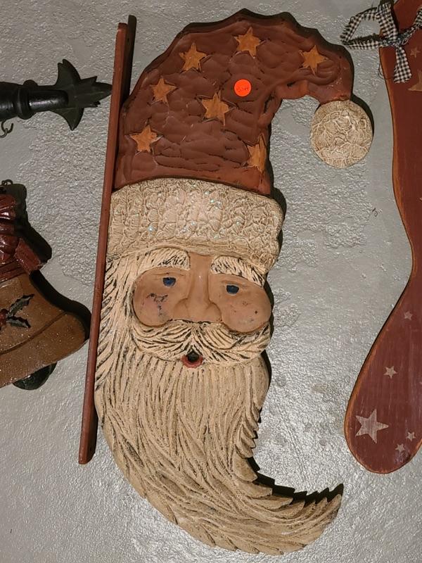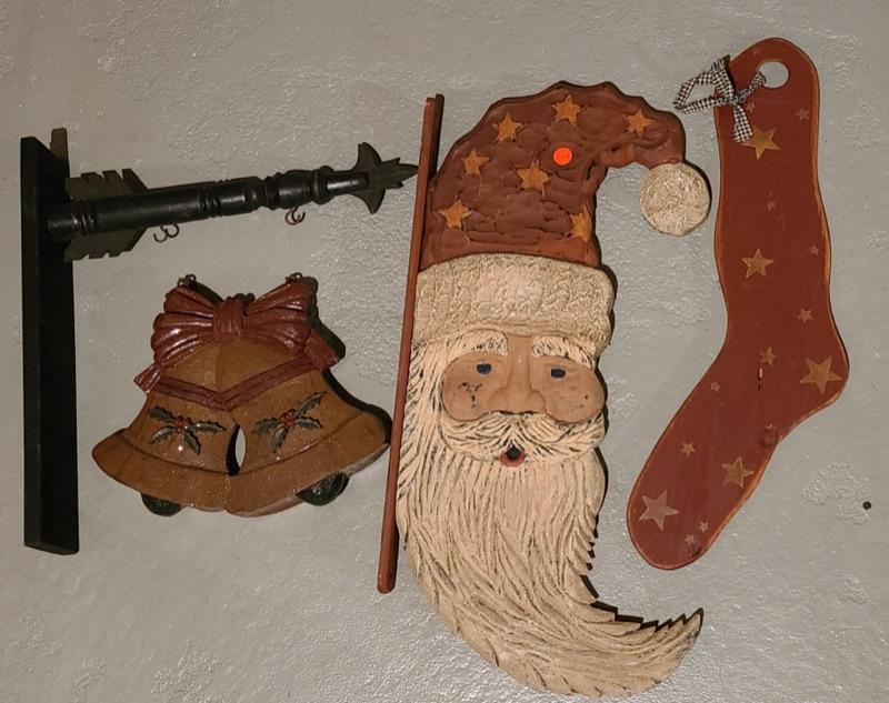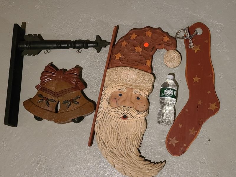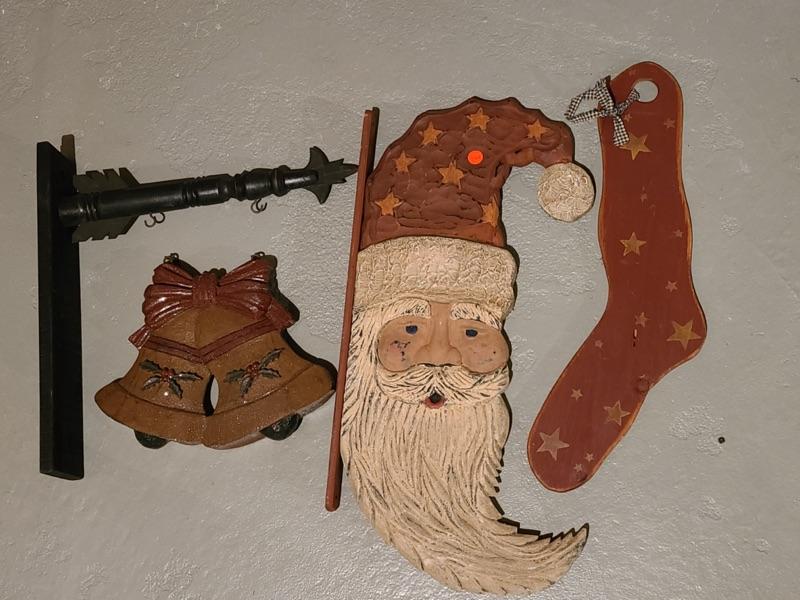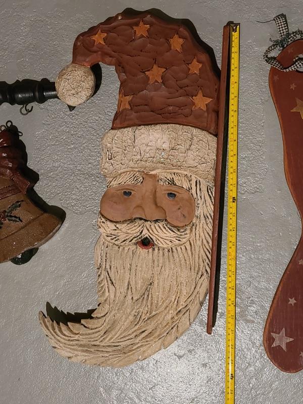 Very nice lot of Holiday hangings, you can post on porch, or inside! Not sure if these are wood or resin. Santa is around 2 feet long! Please see pics for condition and sizing.