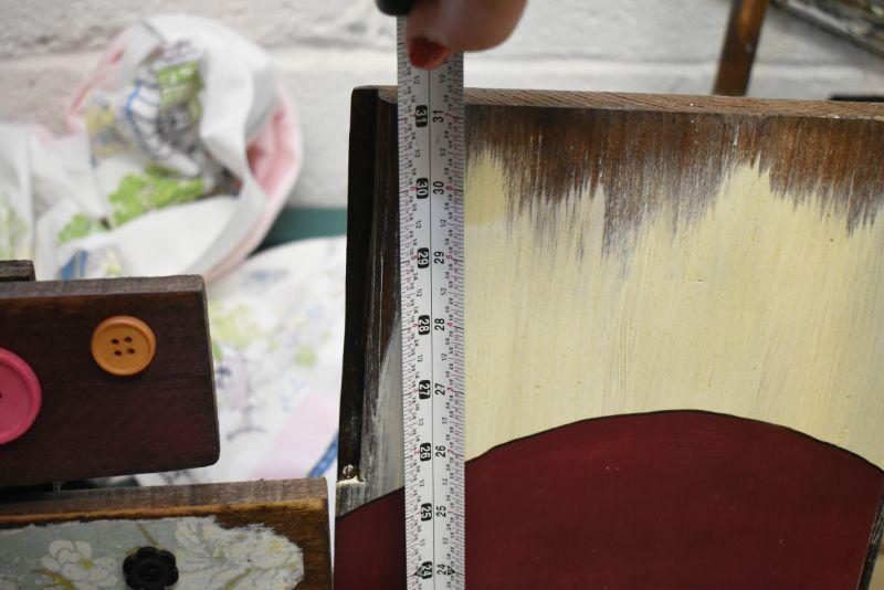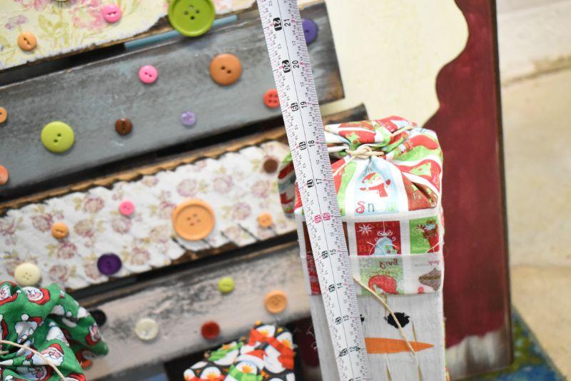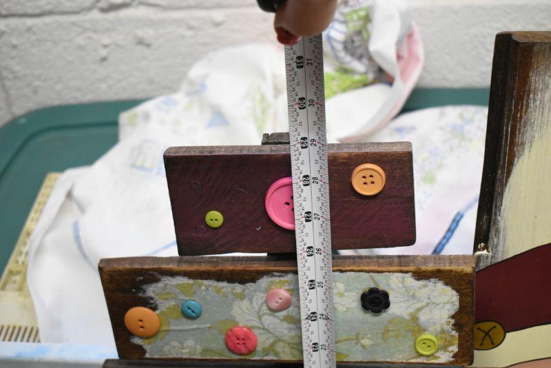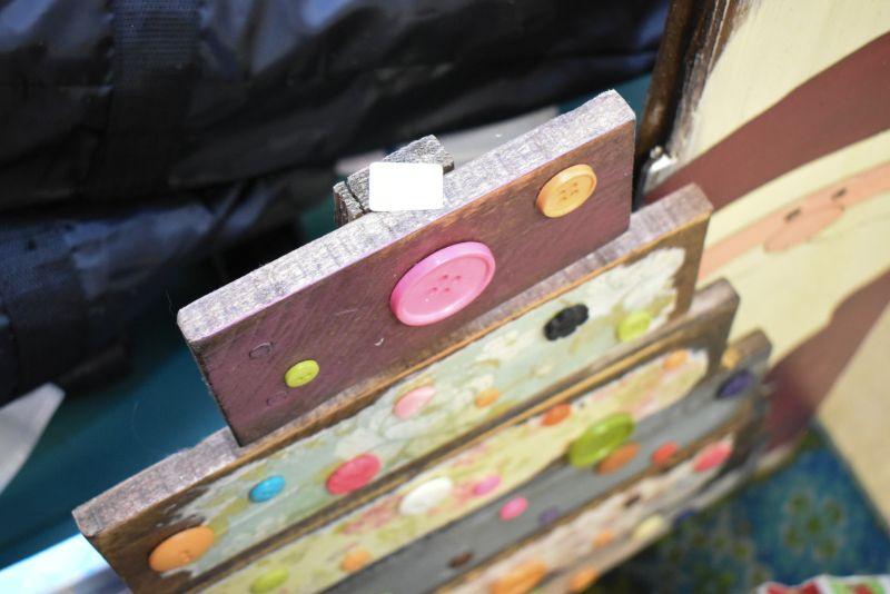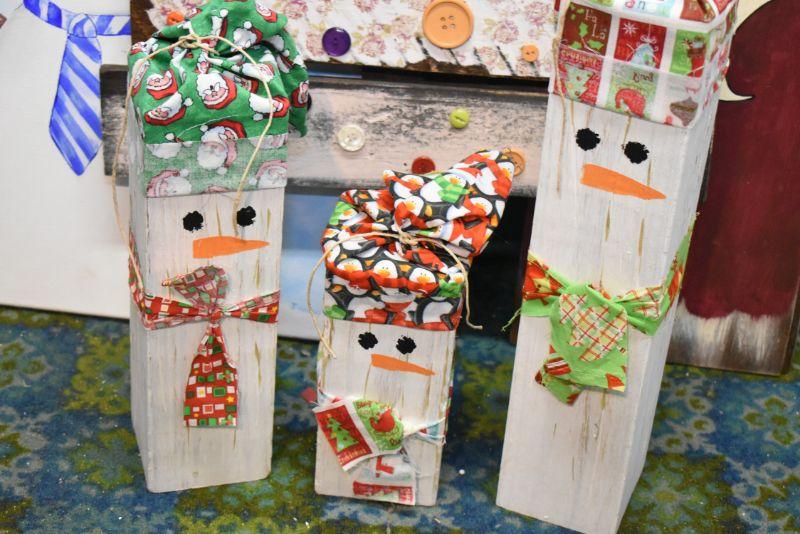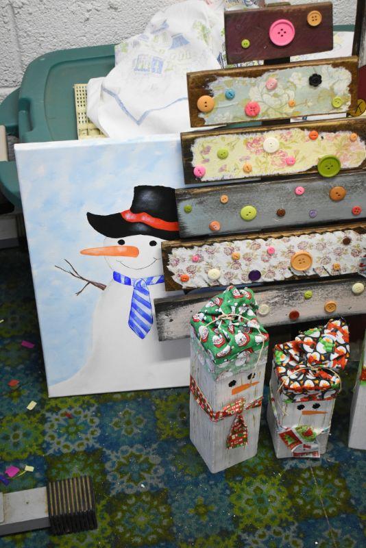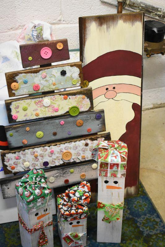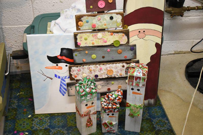 Handcrafted tree with buttons, snowman painting on canvas, Santa painted on wood, and 3 snowman made of wood. Bring help to move. Located in basement that has narrow, steep, cement steps, and a sharp turn to right at bottom.
