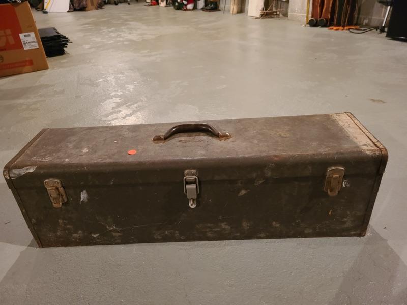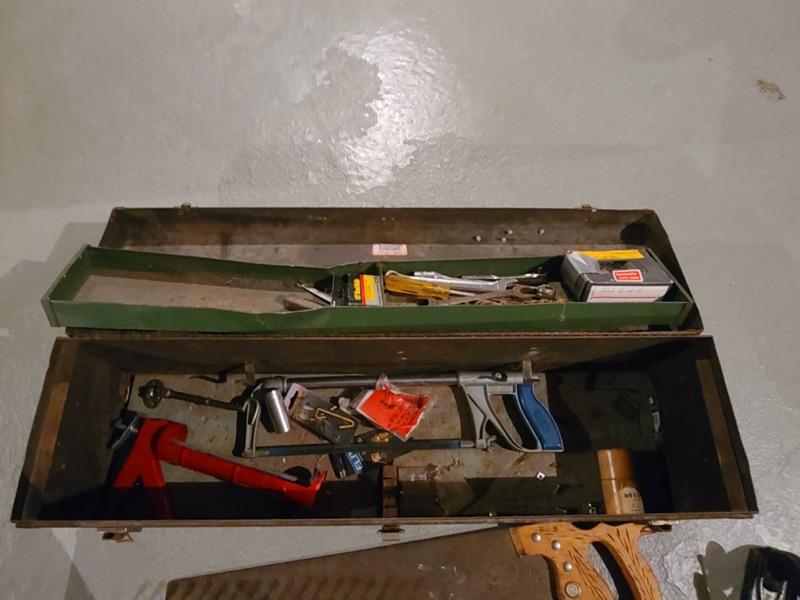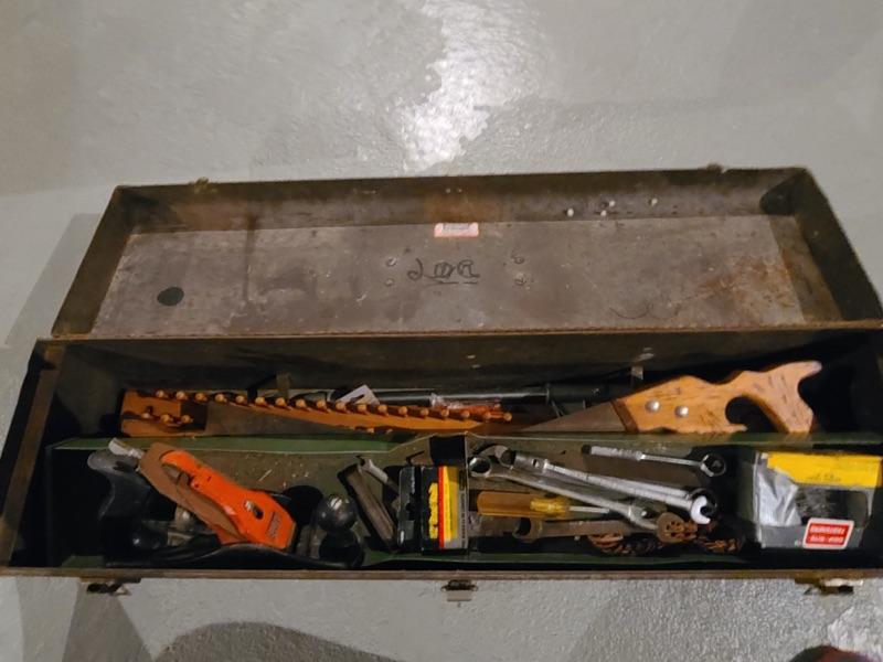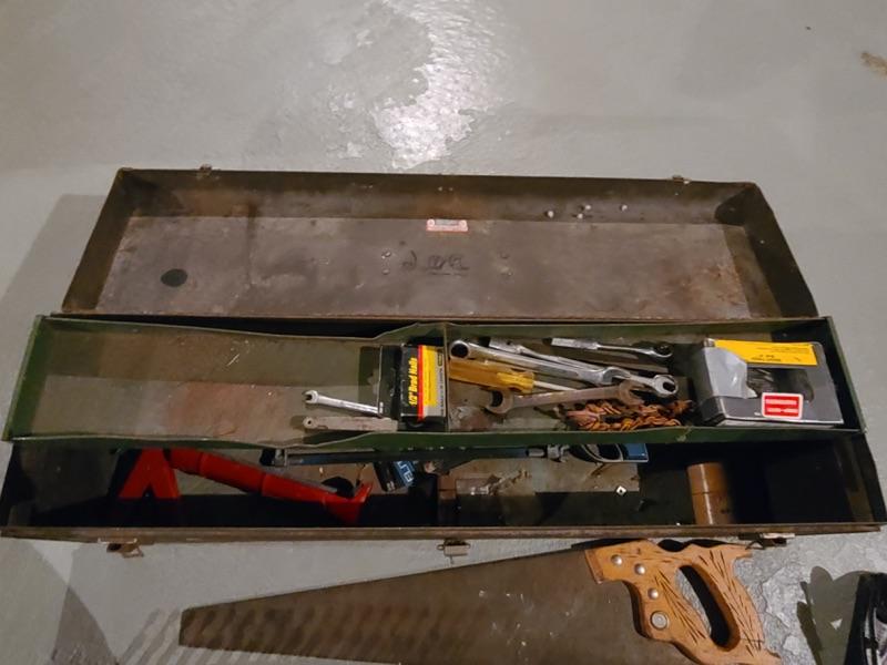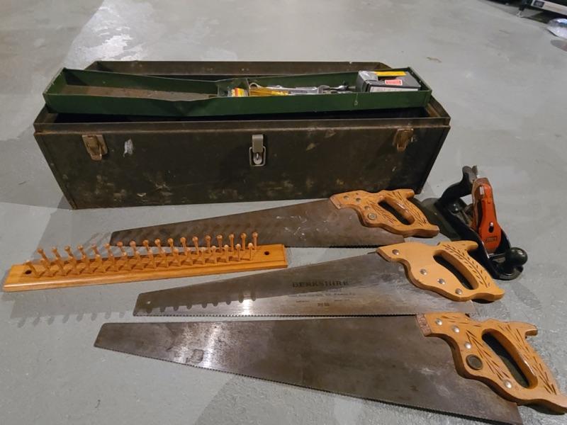 This is a miscellaneous lot of small tools and saws in an old toolbox. Please see pics for actual condition and sizing.