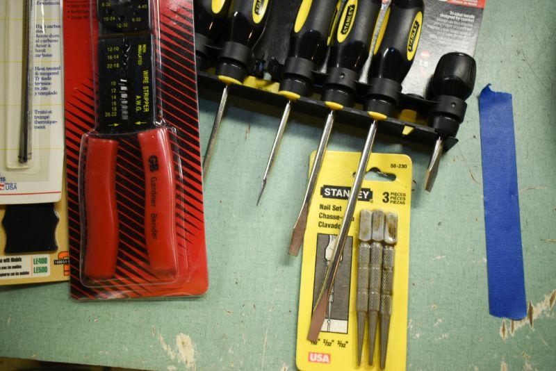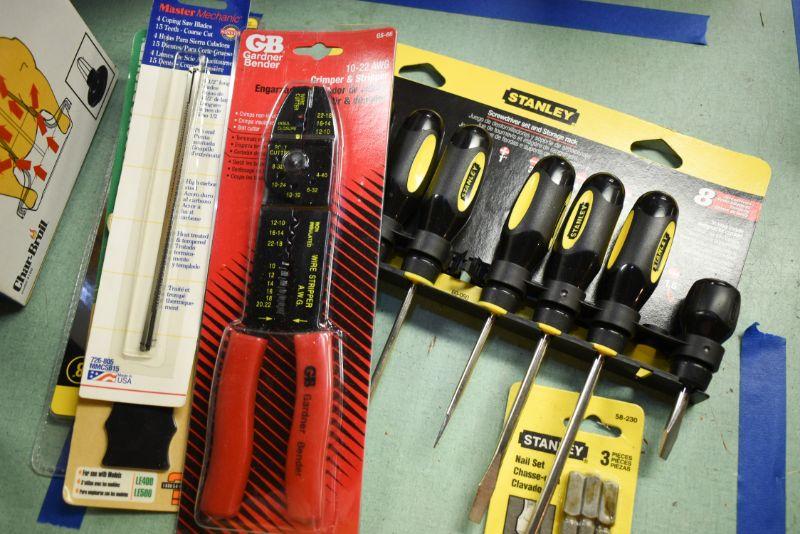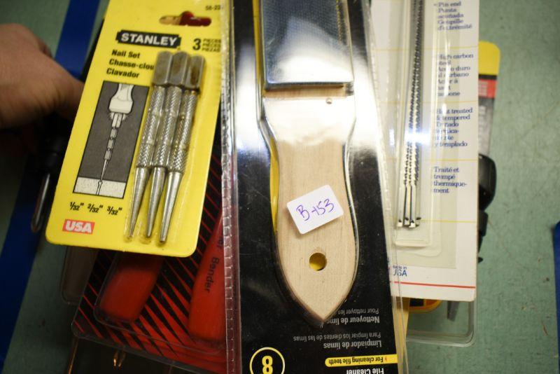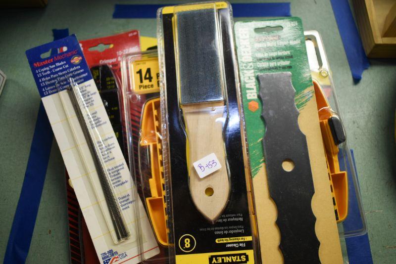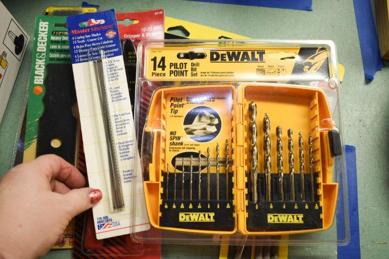 New in packaging, DeWalt, Black and Decker, Stanley and more. Bring bag to remove. Located in basement that has narrow, steep, cement steps, and a sharp turn to right at bottom.