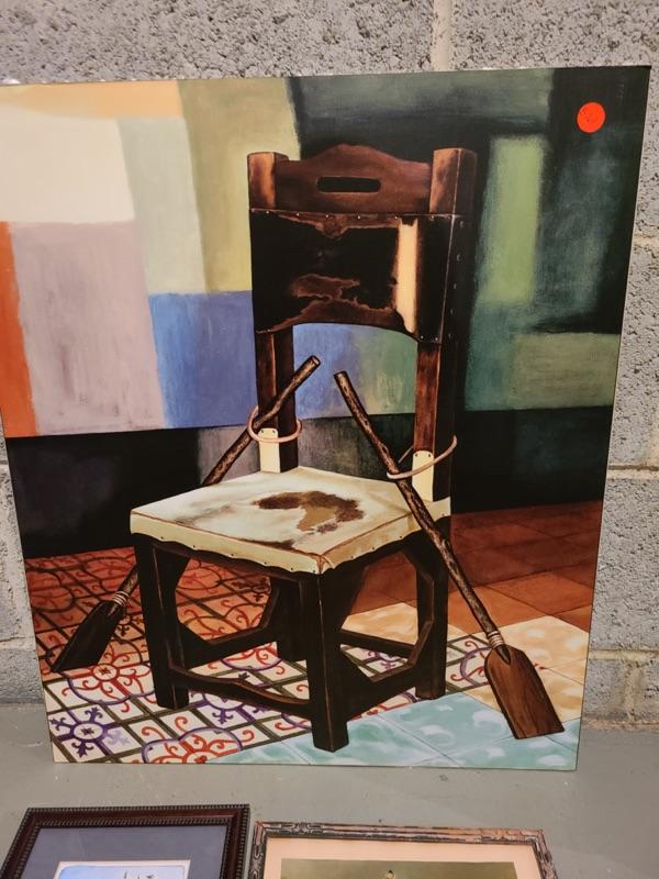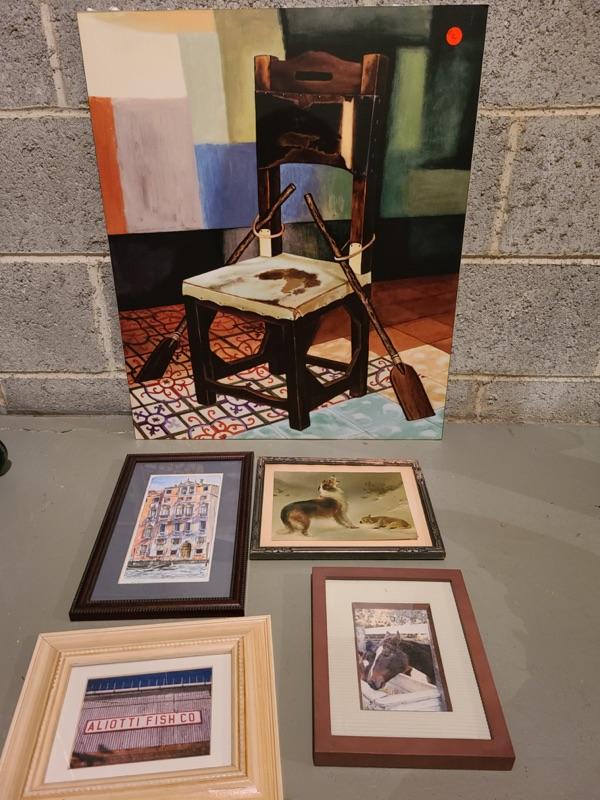 Please see pics for each piece condition. Chair pic is on foam board. Nice lot of art work.