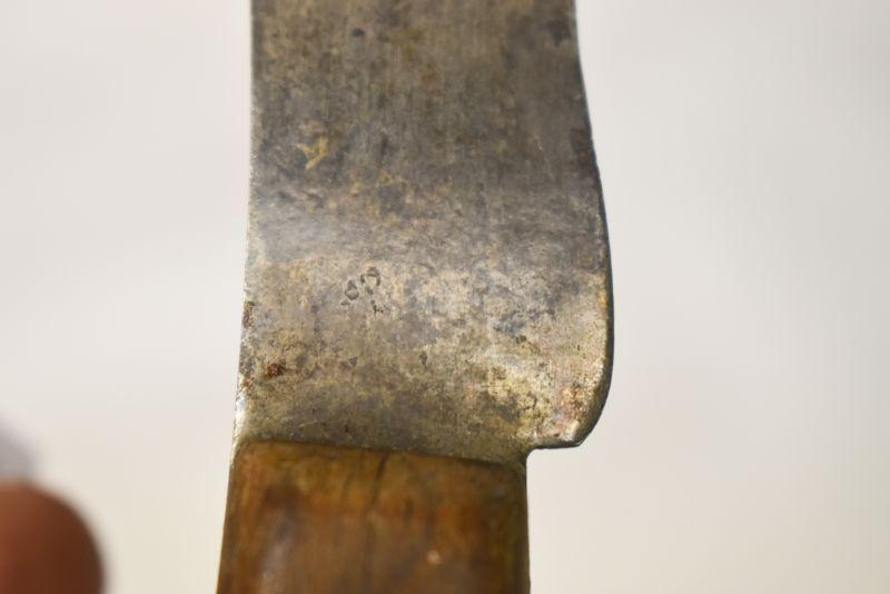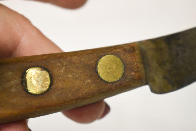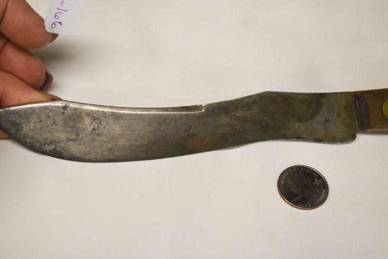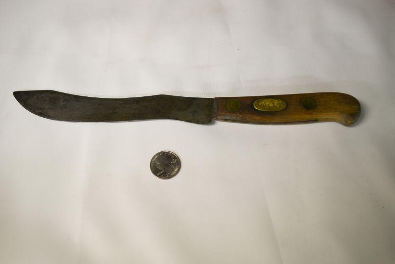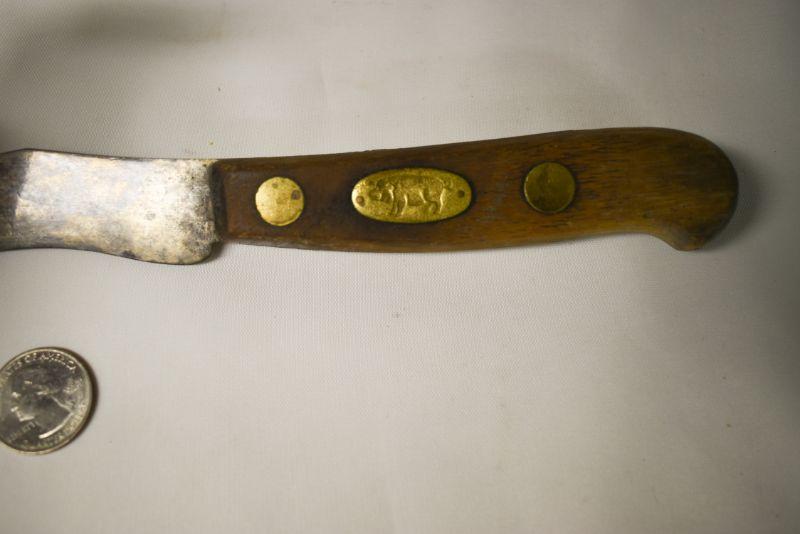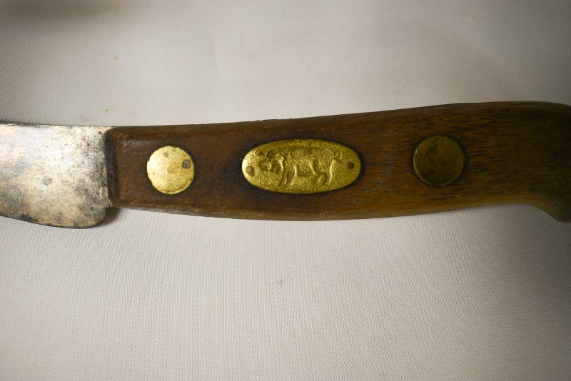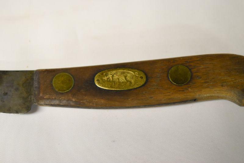 Unusual knife with a brass pig on handle. Well used, was in a tackle box. Located in basement that has narrow, steep, cement steps, and a sharp turn to right at bottom.