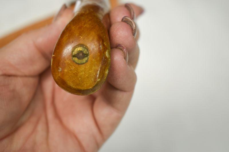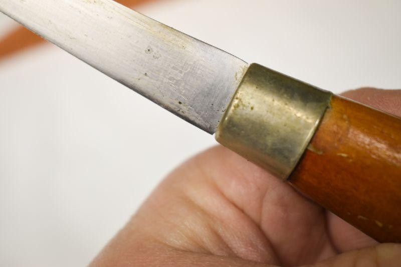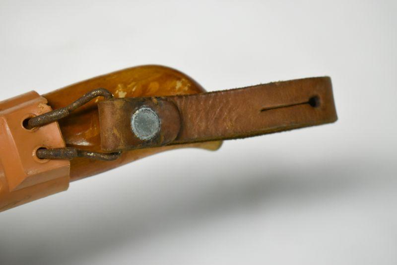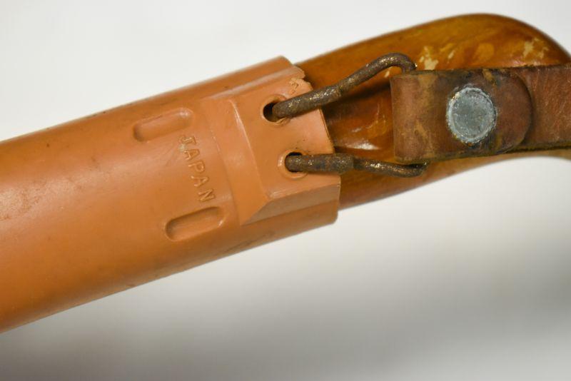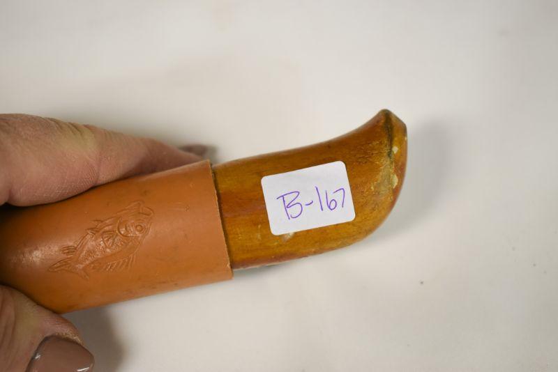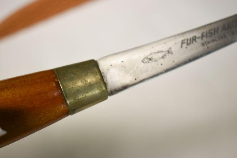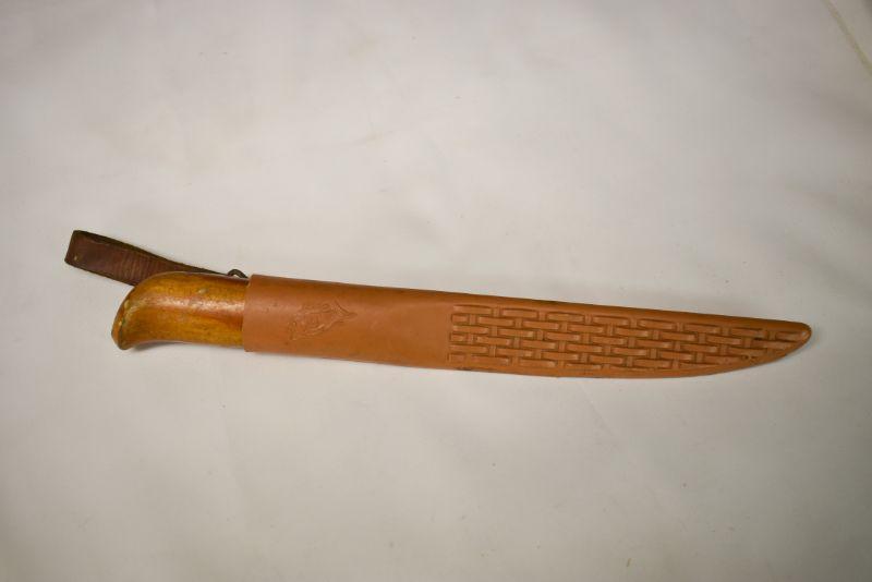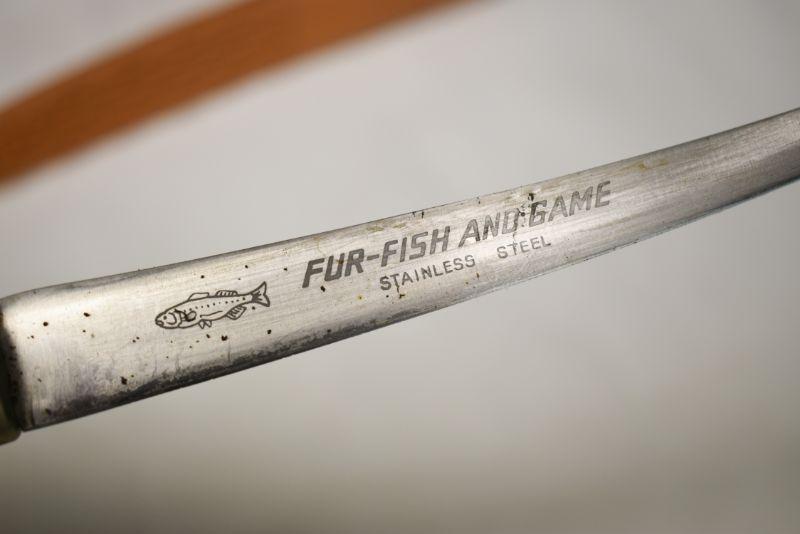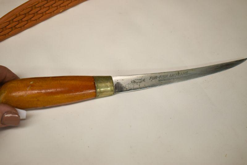 Fur-Fish And Game knife with case. Used condition. Located in basement that has narrow, steep, cement steps, and a sharp turn to right at bottom.
