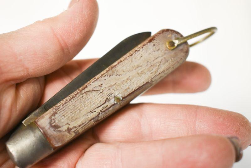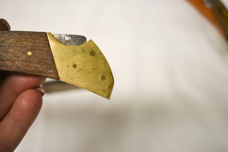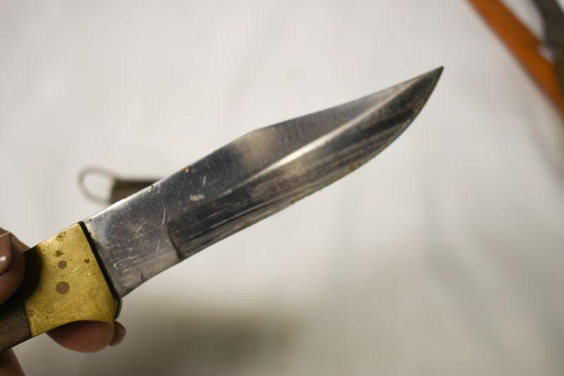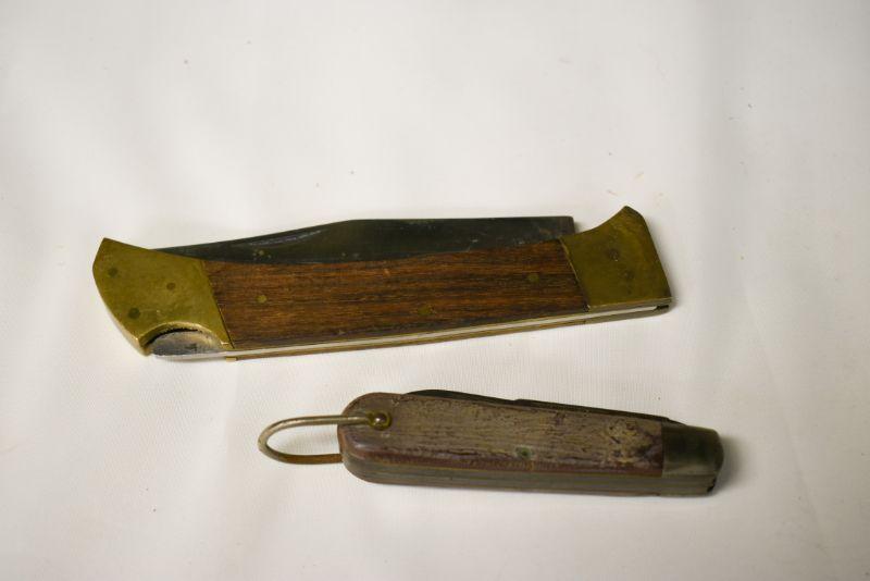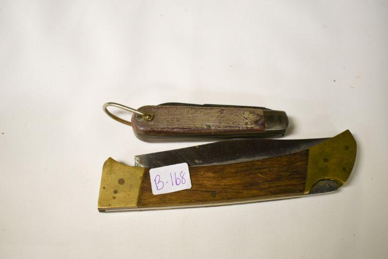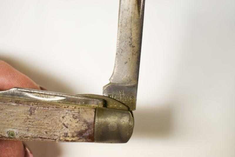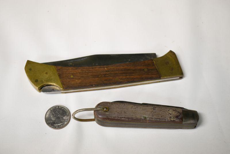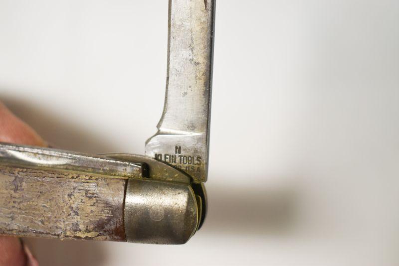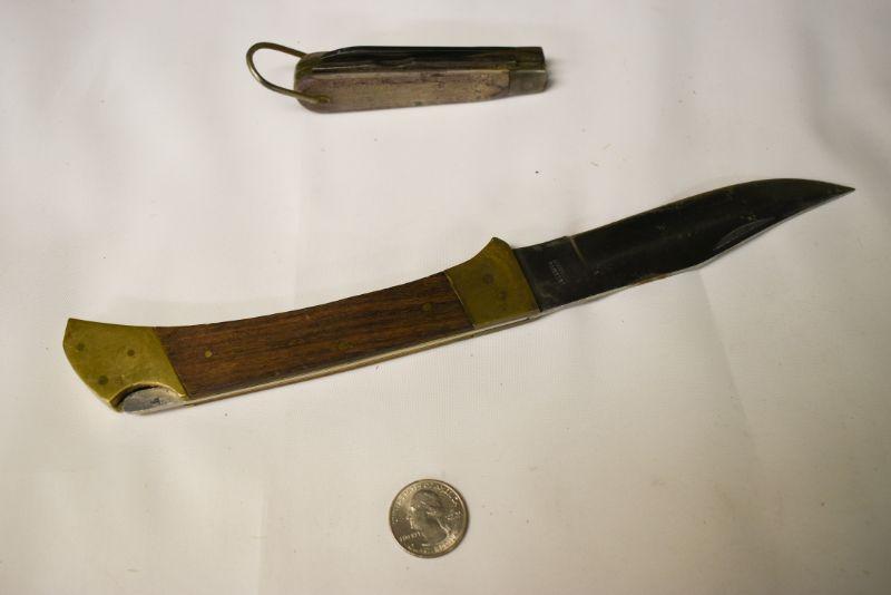 Pocket knife by Klein Tools, and a knife made in Pakistan. Both well used. Located in basement that has narrow, steep, cement steps, and a sharp turn to right at bottom.