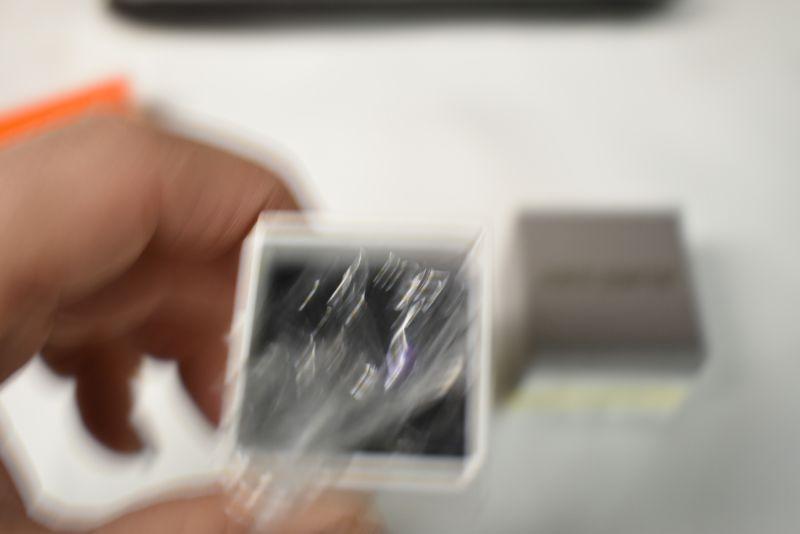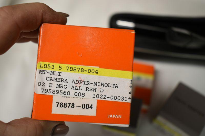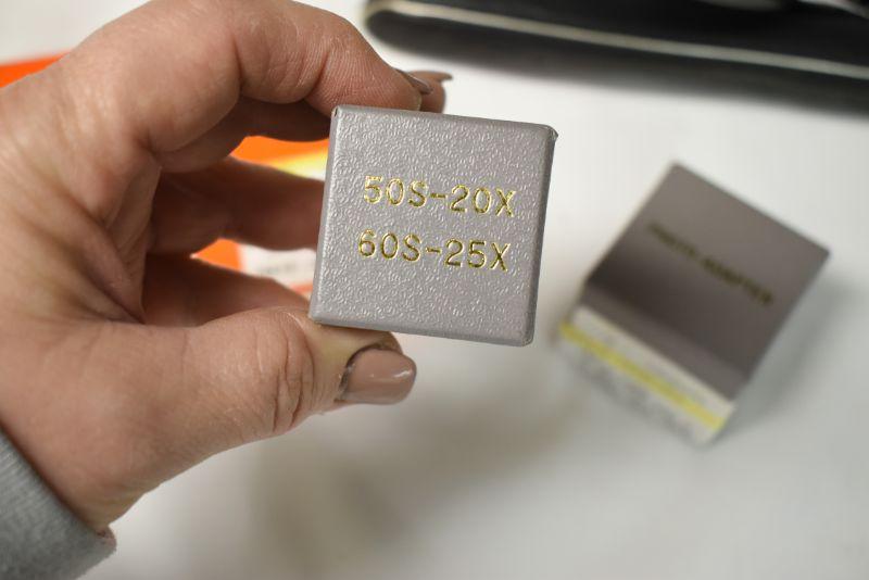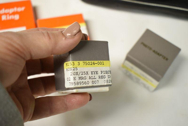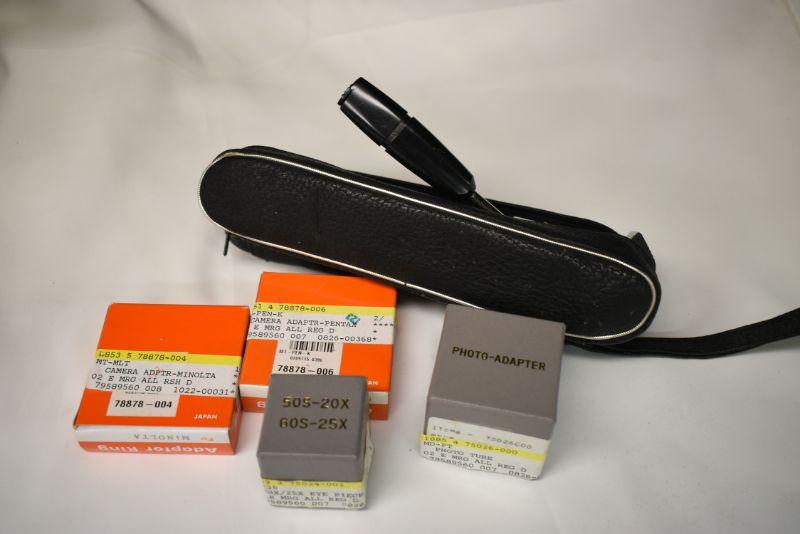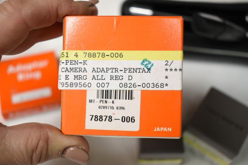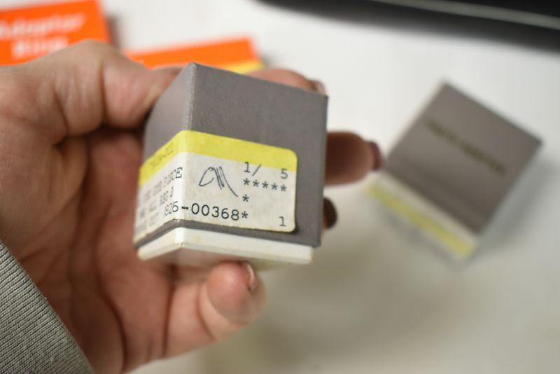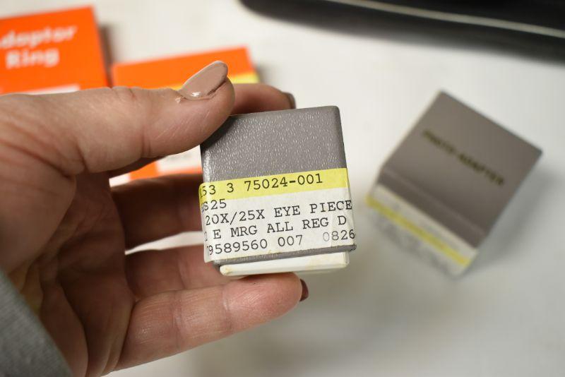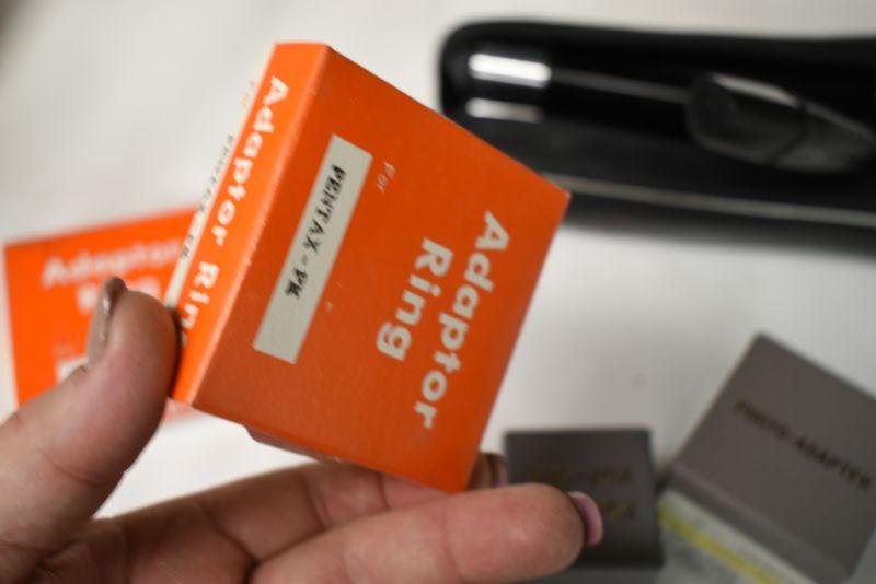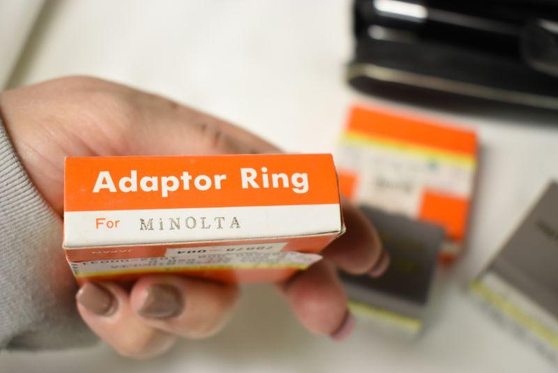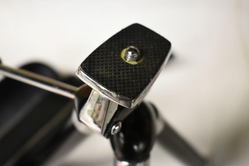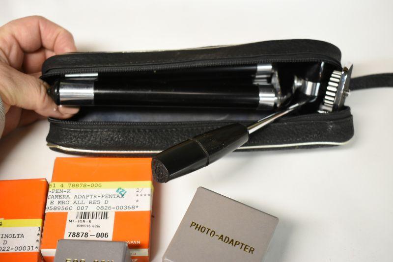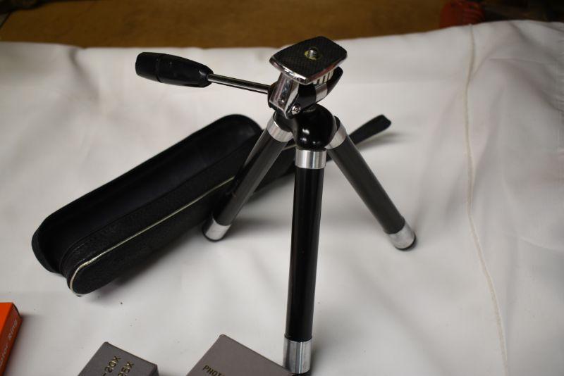 Table top tripod, adapter rings, and lenses. Located in basement that has narrow, steep, cement steps, and a sharp turn to right at bottom.