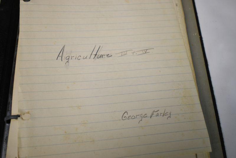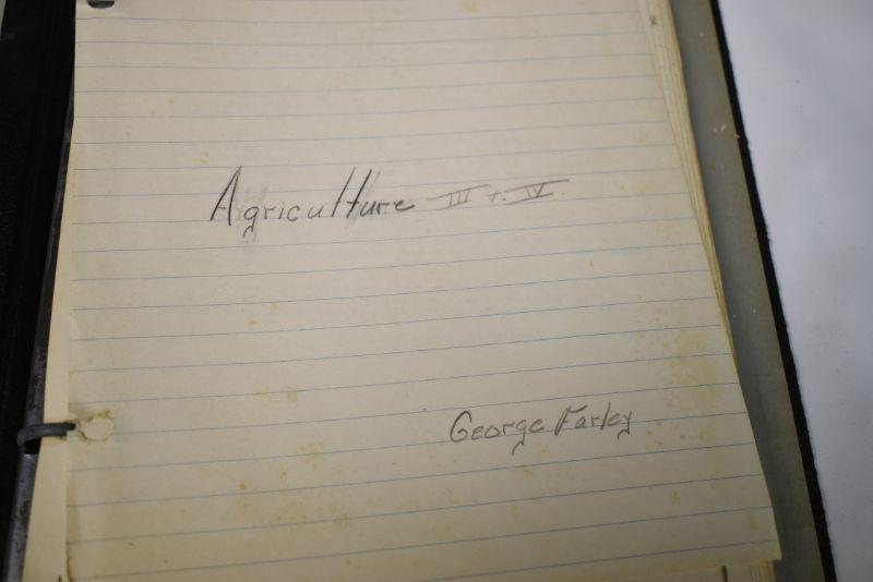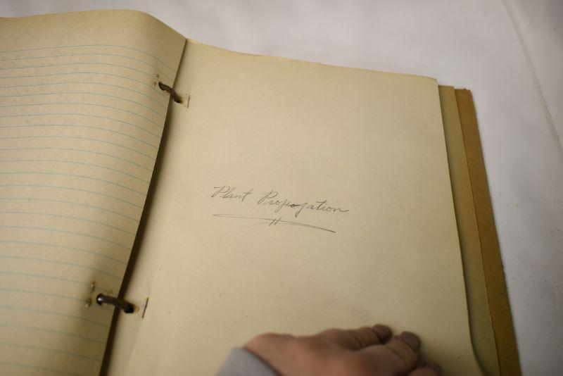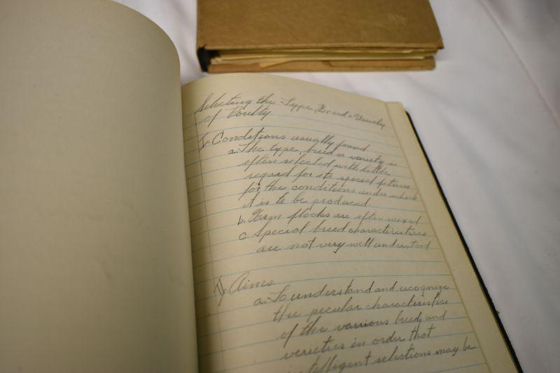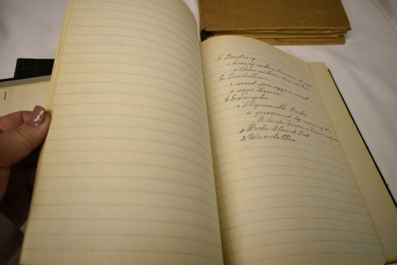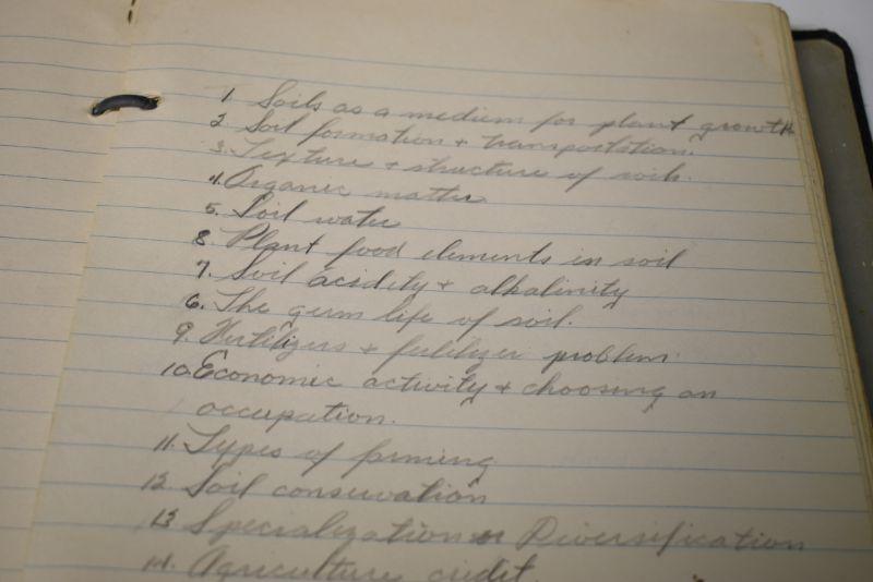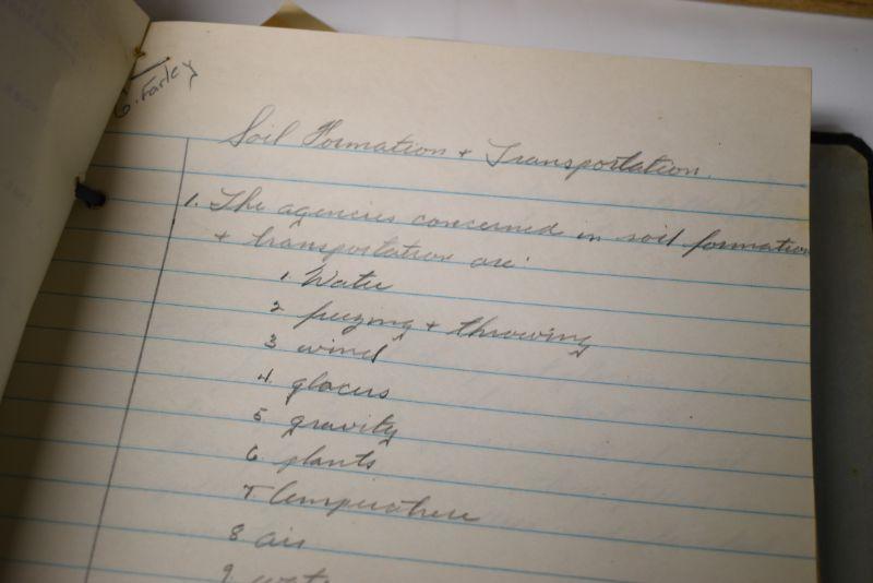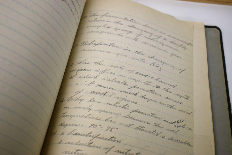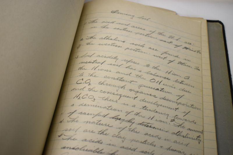 Hand written notebooks on the study of agriculture. Located in basement that has narrow, steep, cement steps, and a sharp turn to right at bottom.