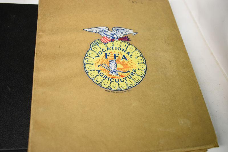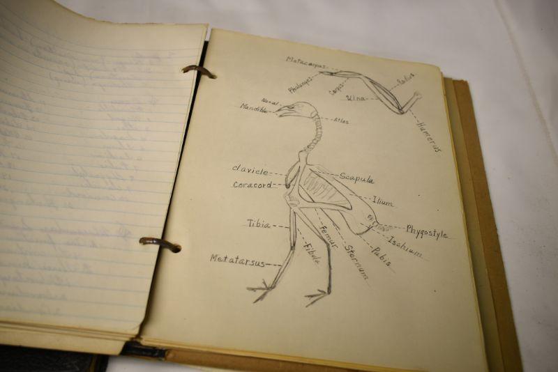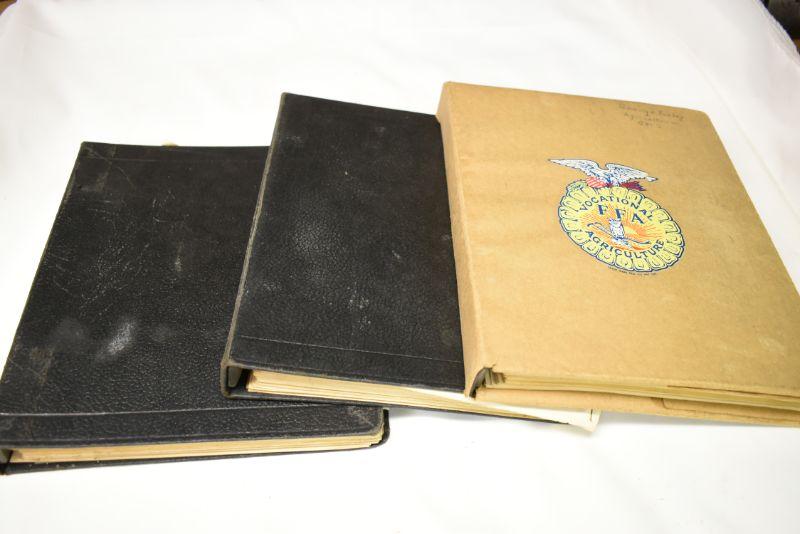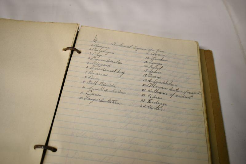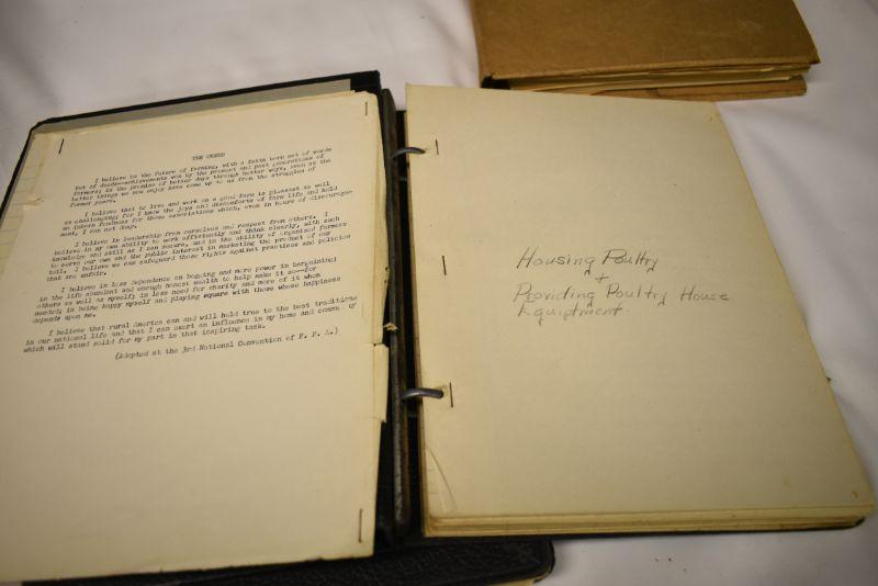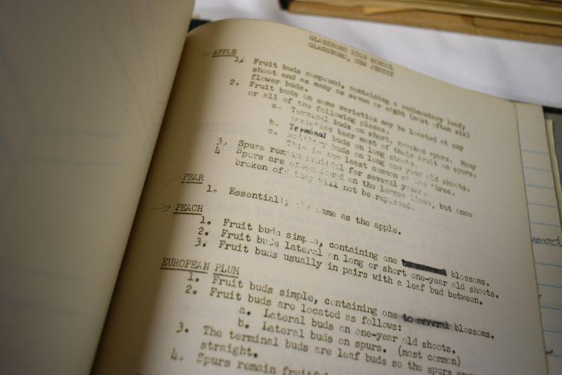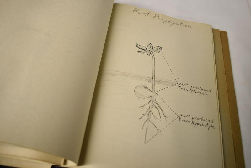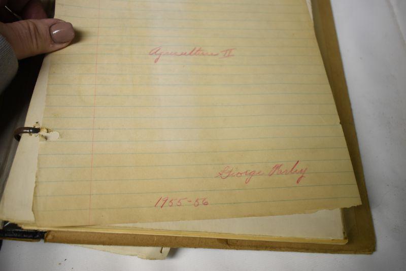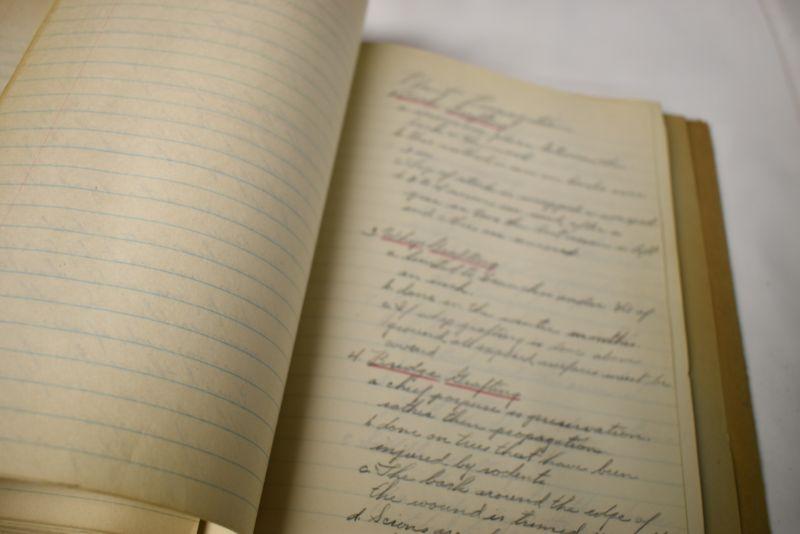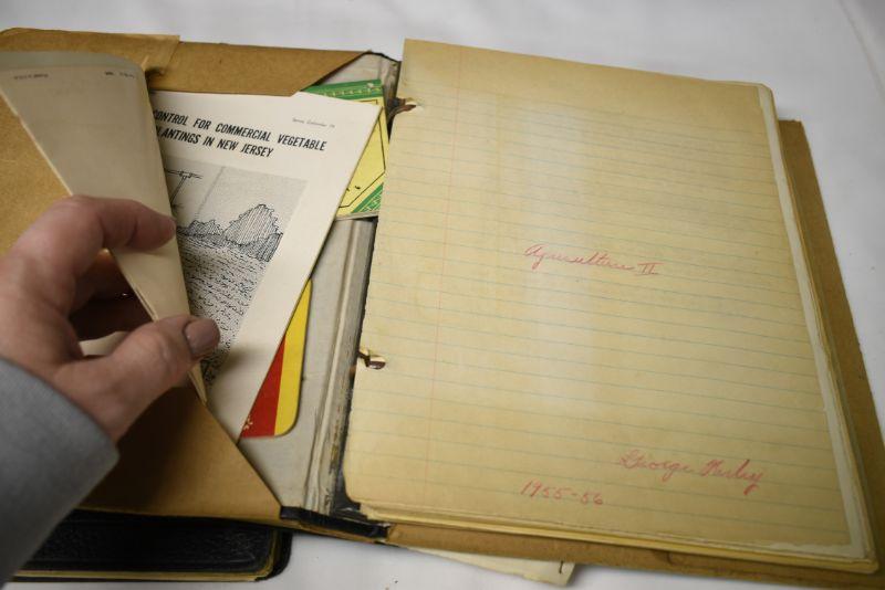 Hand written notebooks on the study of agriculture. Located in basement that has narrow, steep, cement steps, and a sharp turn to right at bottom.