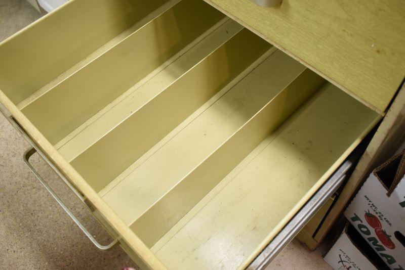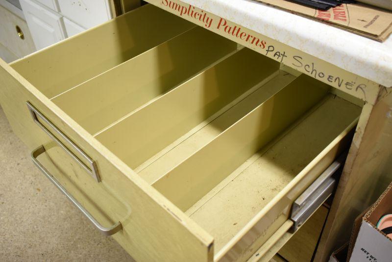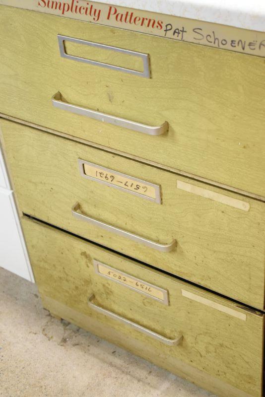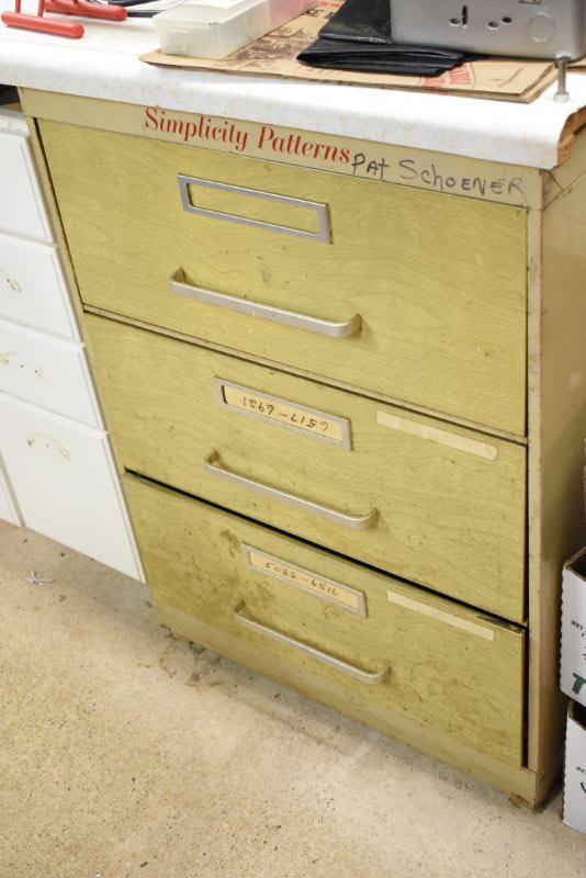 Simplicity Patterns file cabinet. 27x25x37. Well used. Bring help to move. Located in basement, with steep and narrow cement steps going down, with a sharp turn at bottom.