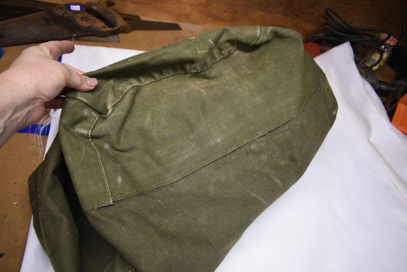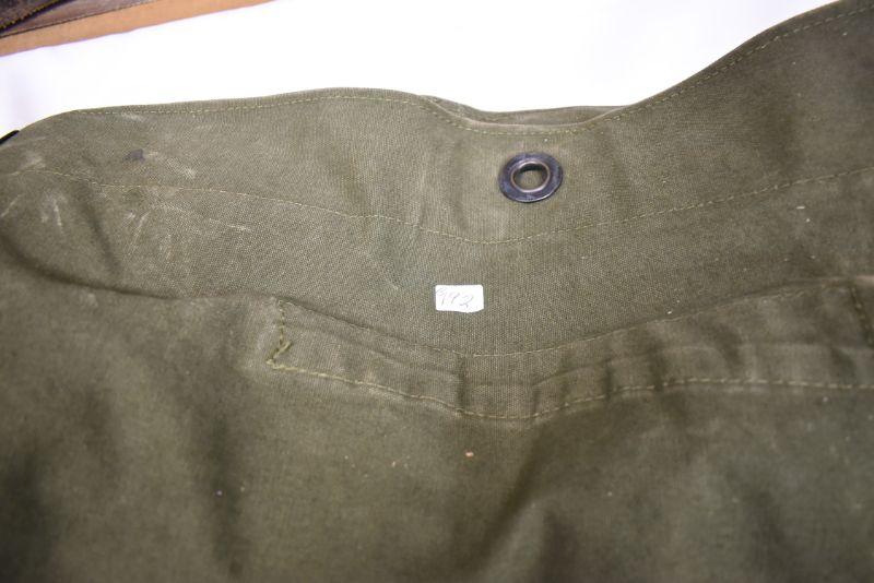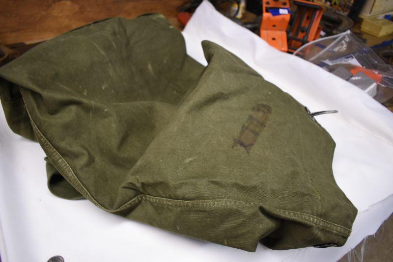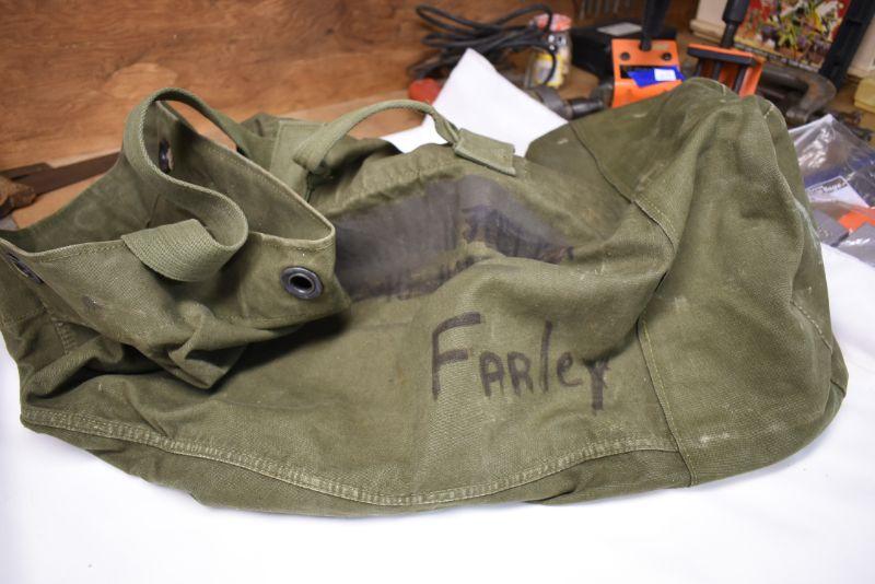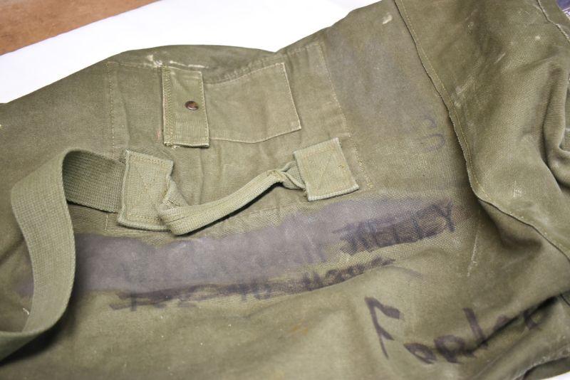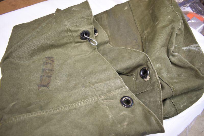 Army green vintage duffle bag. Used condition. Located in basement that has narrow, steep, cement steps, and a sharp turn to right at bottom.