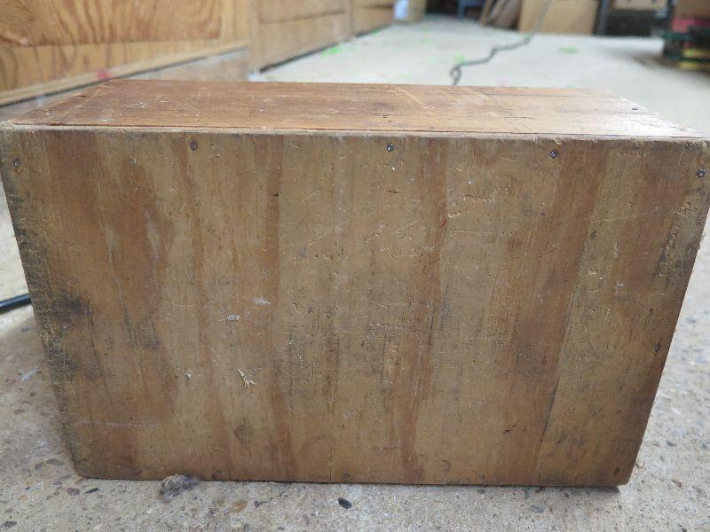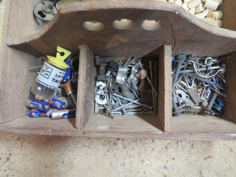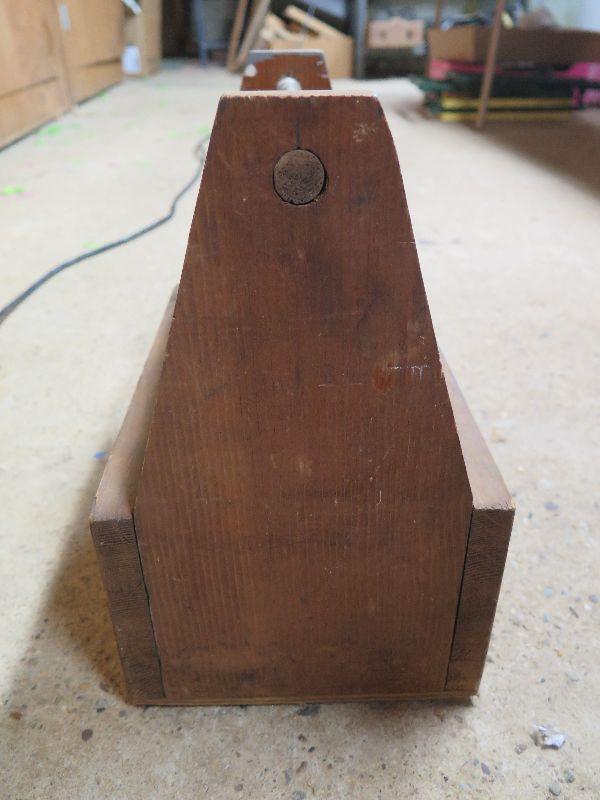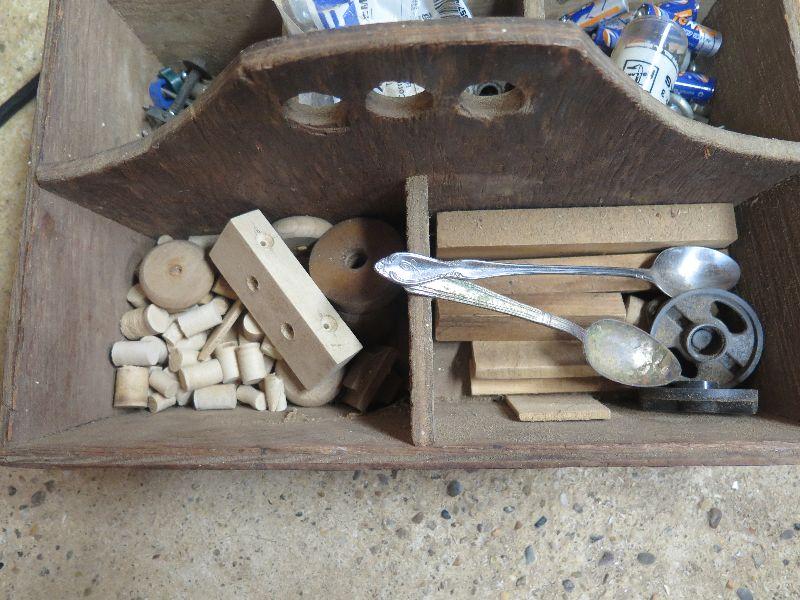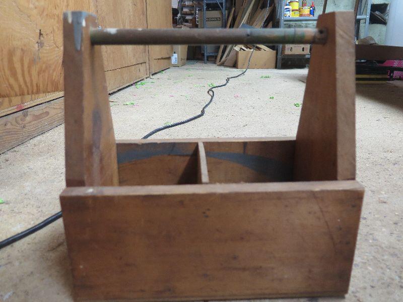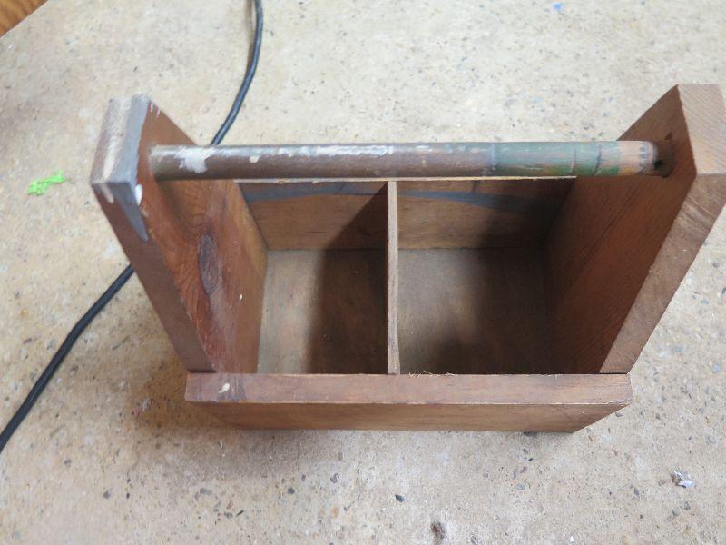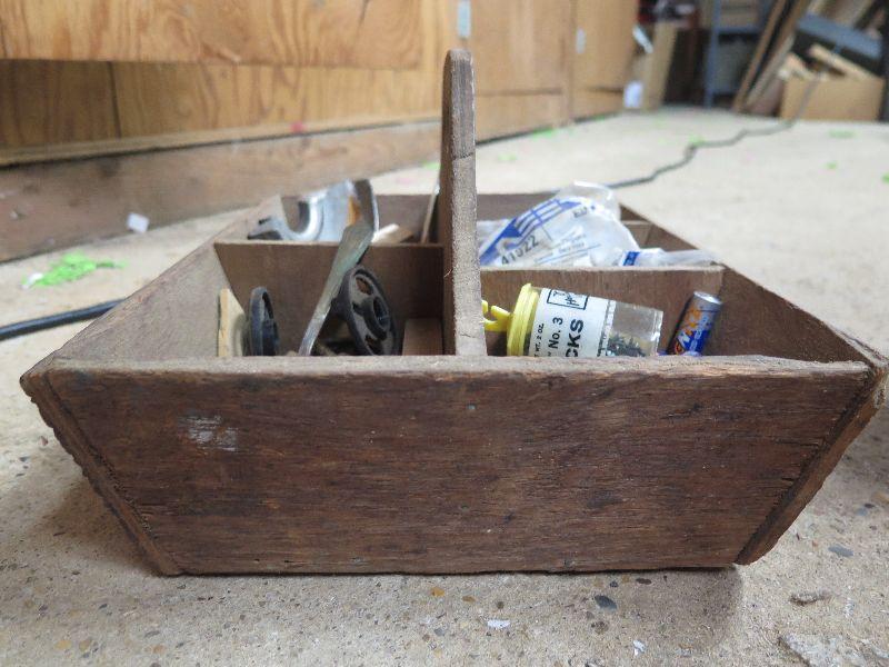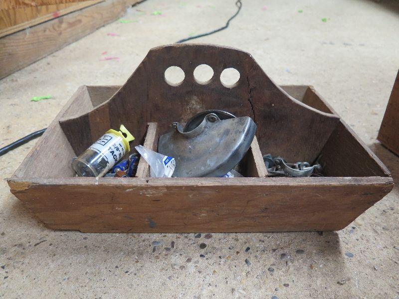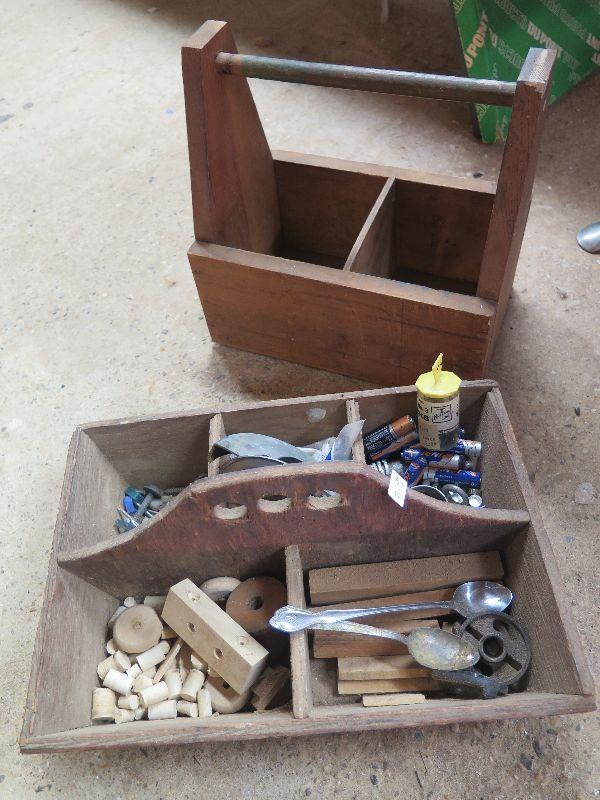 Two handcrafted tool boxes, one with four compartments, contents included, 14.5x10x3. Located in basement that has narrow, steep, cement steps, and a sharp turn to right at bottom.