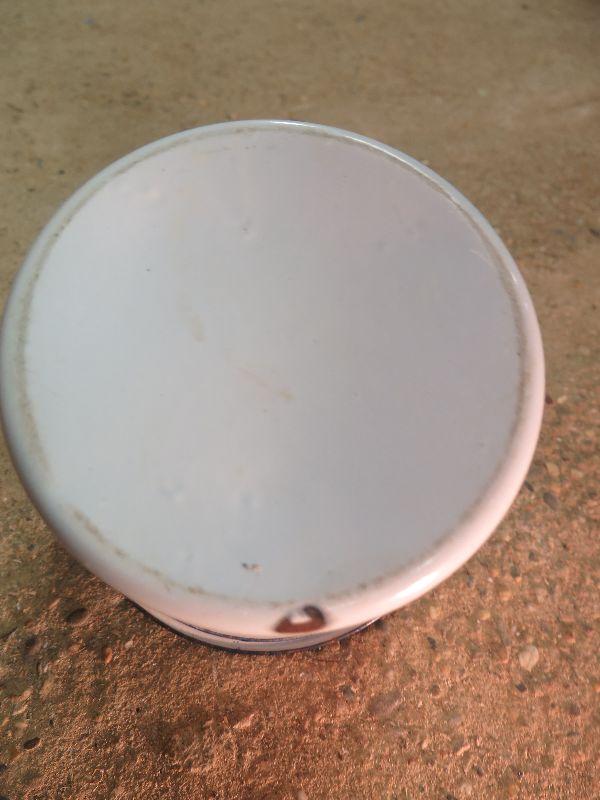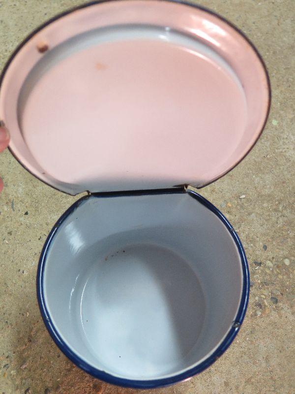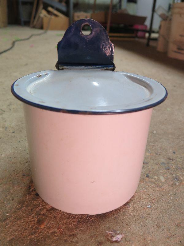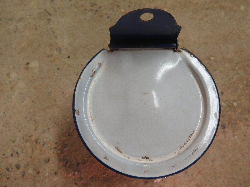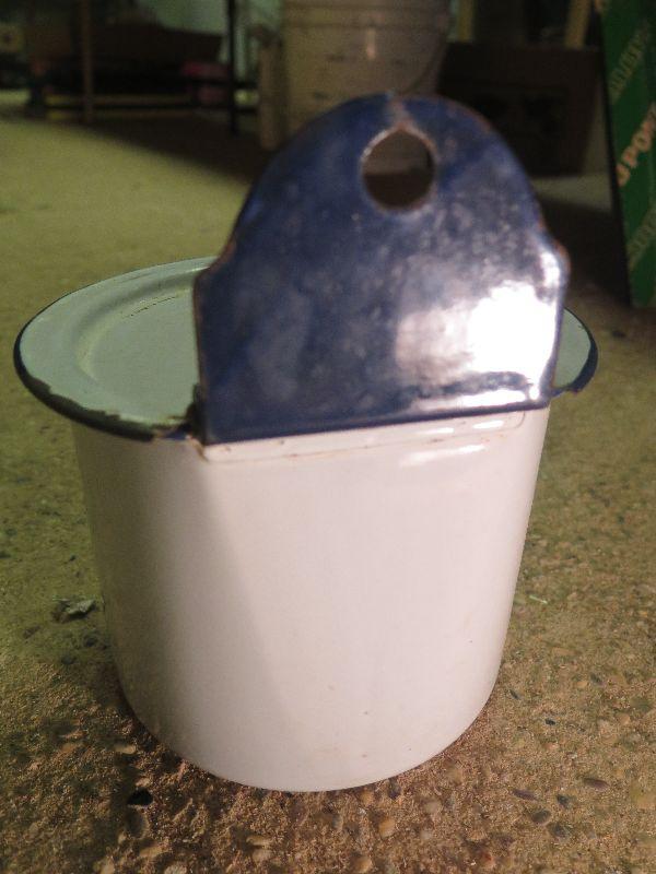 Vintage, enameled salt. 6.5x5, not including hanger. Located in basement that has narrow, steep, cement steps, and a sharp turn to right at bottom.