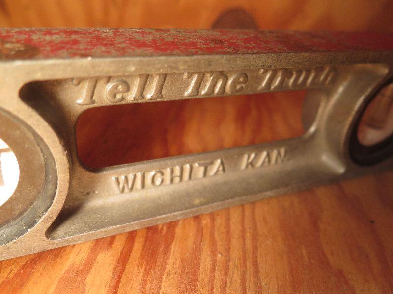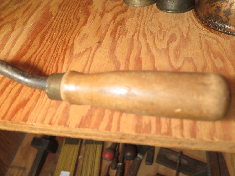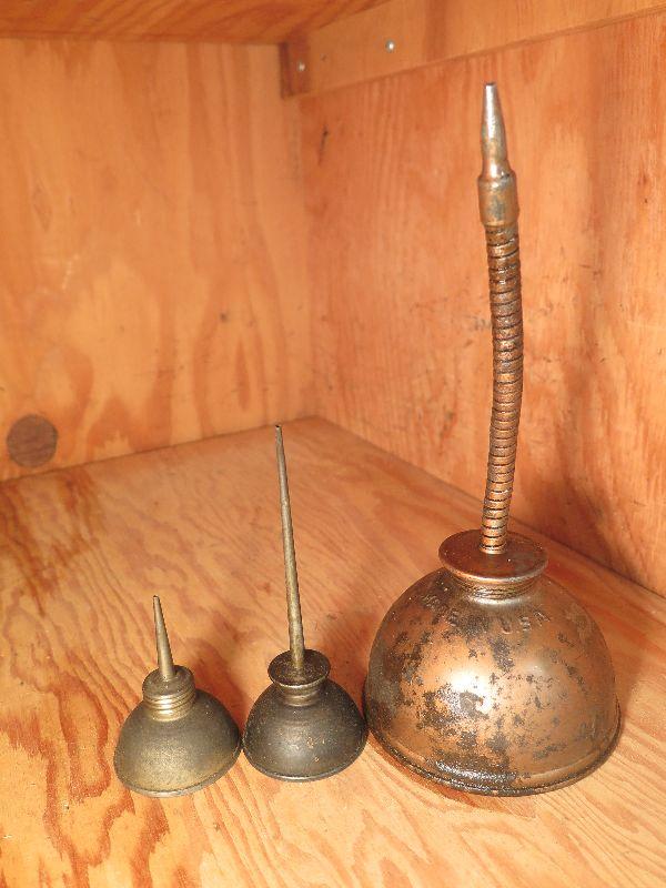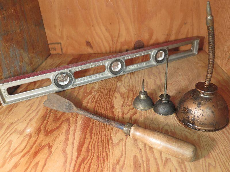 Level, chisel, and 3 oil applicators, tallest is nine inches. Located in basement that has narrow, steep, cement steps, and a sharp turn to right at bottom.