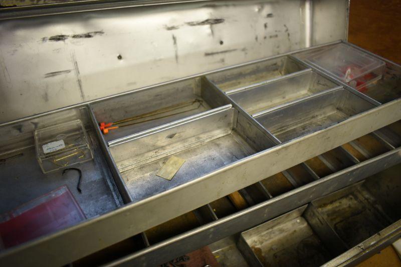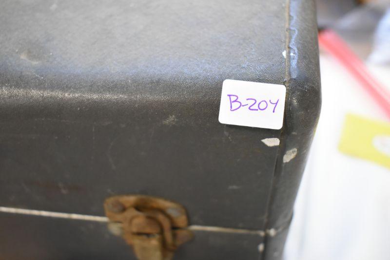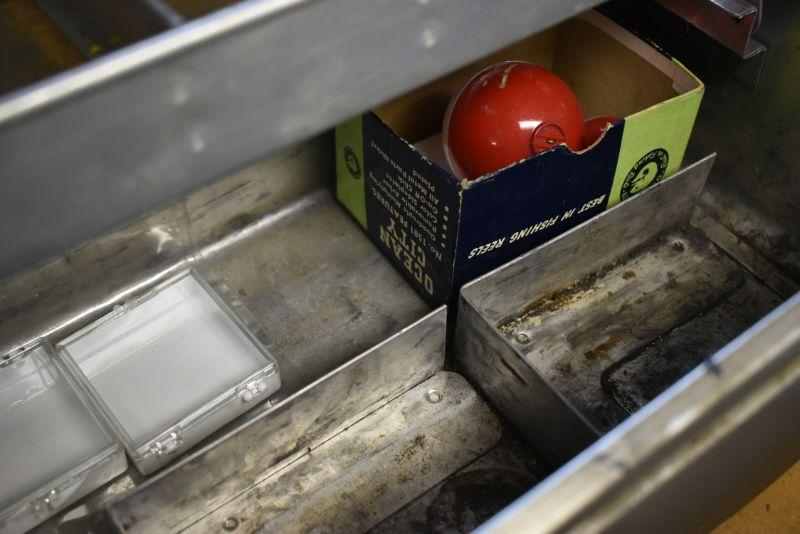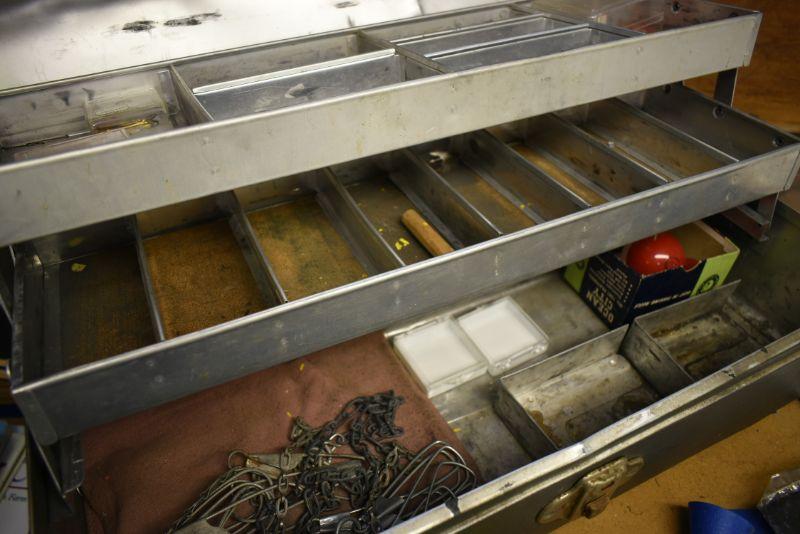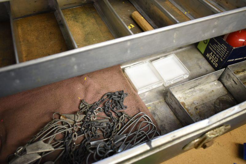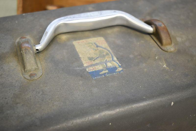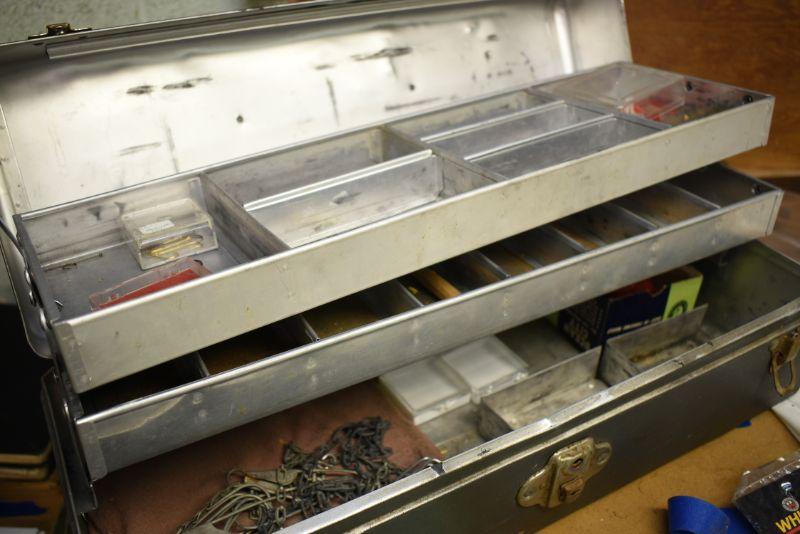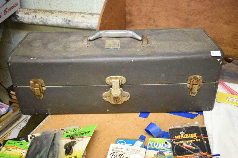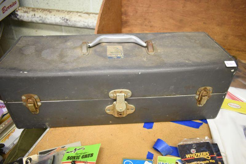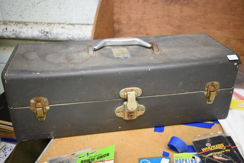 Vintage tackle box, contents included. Located in basement that has narrow, steep, cement steps, and a sharp turn to right at bottom.