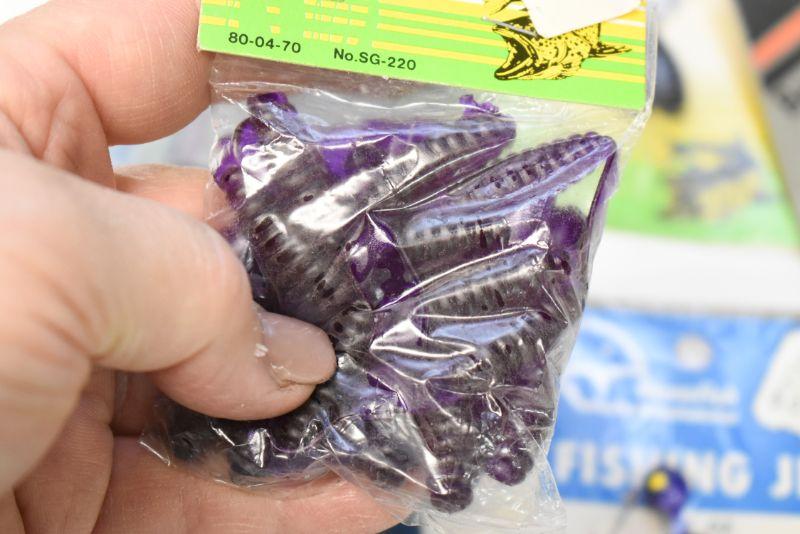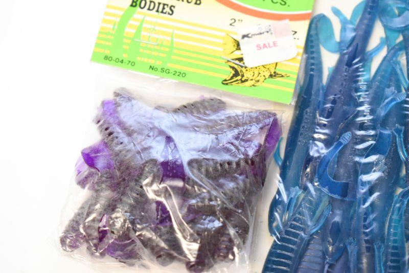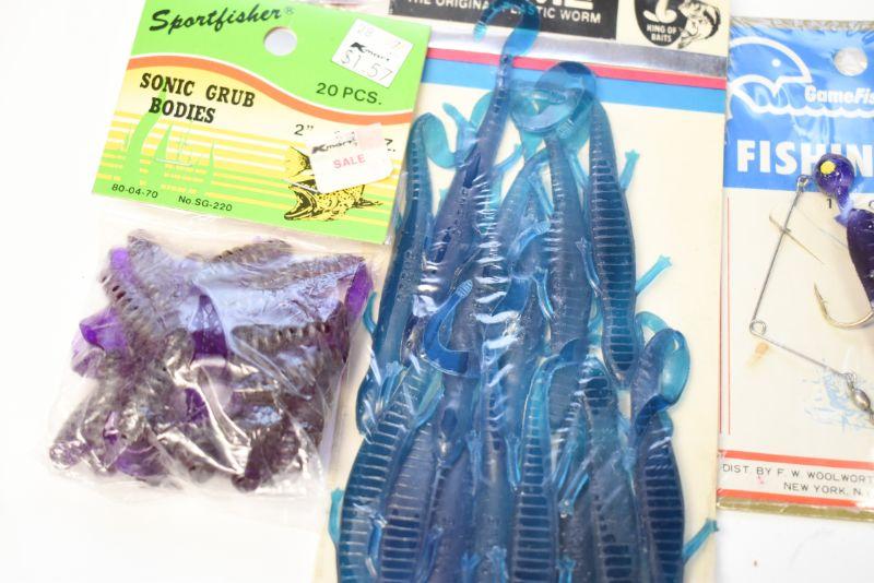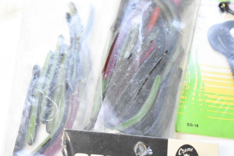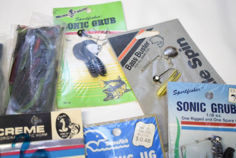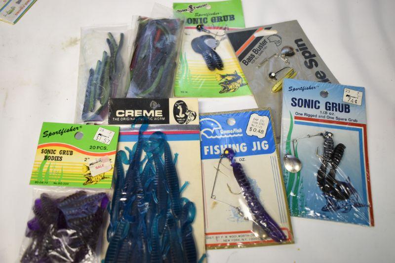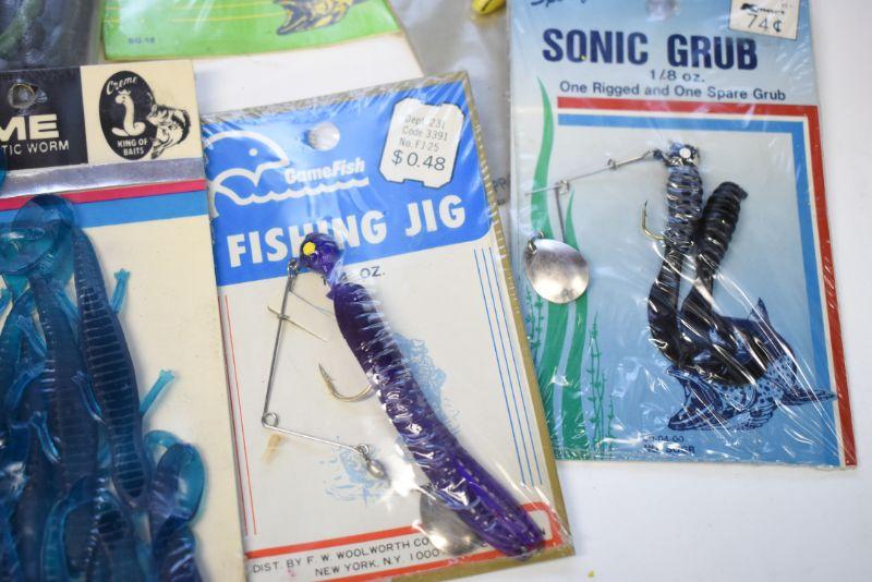 Vintage fishing accessories in original packaging. Located in basement that has narrow, steep, cement steps, and a sharp turn to right at bottom.