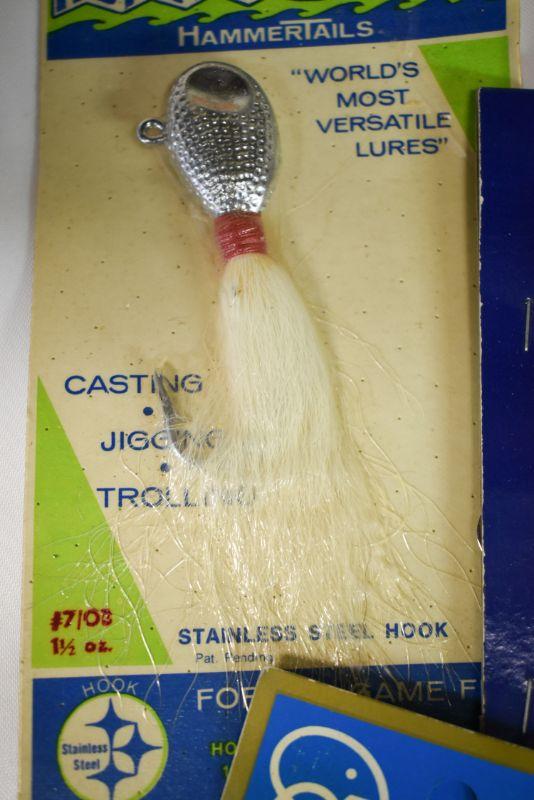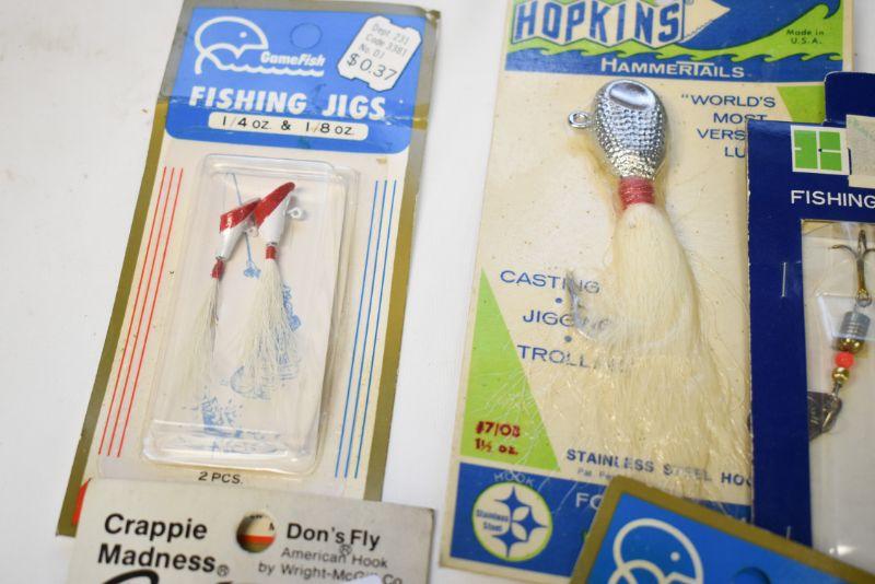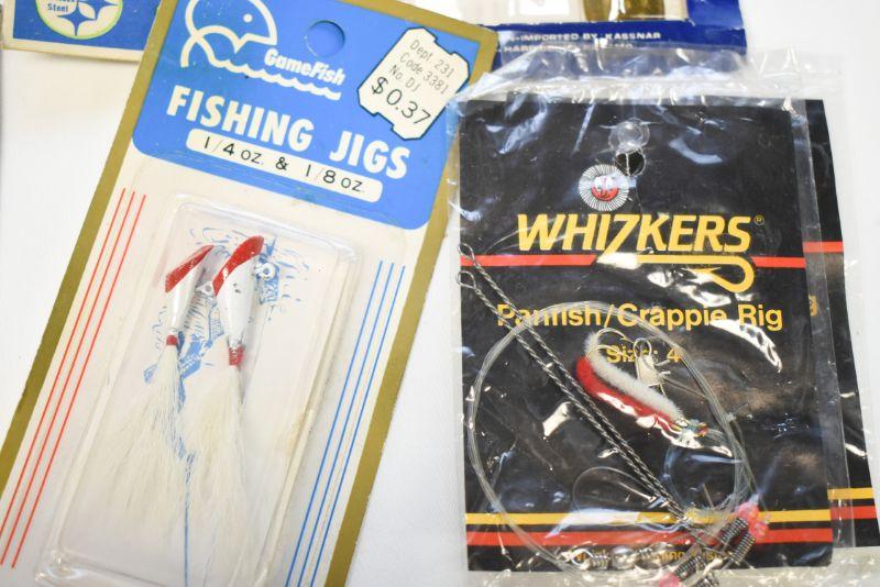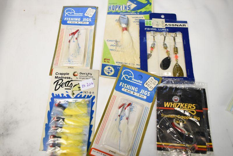 Jigs, rigs, lures and more. Located in basement that has narrow, steep, cement steps, and a sharp turn to right at bottom.
