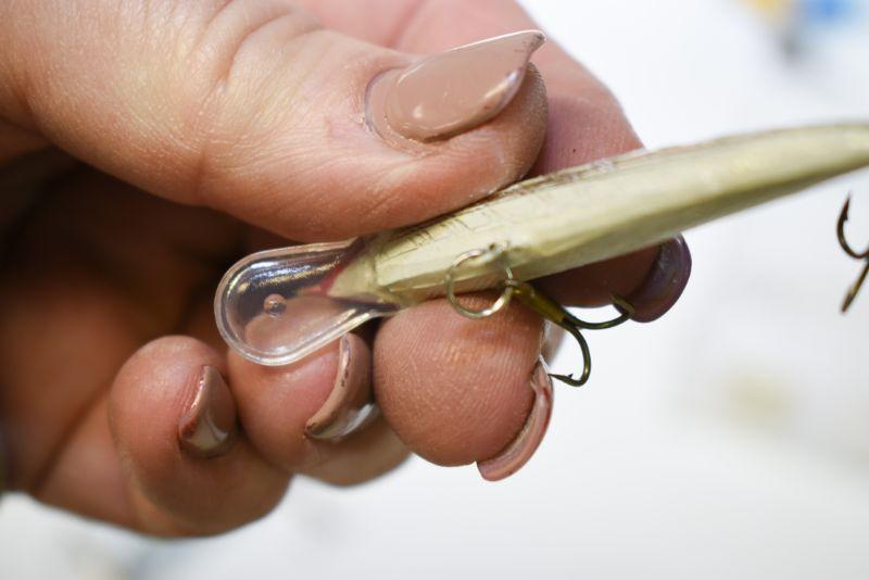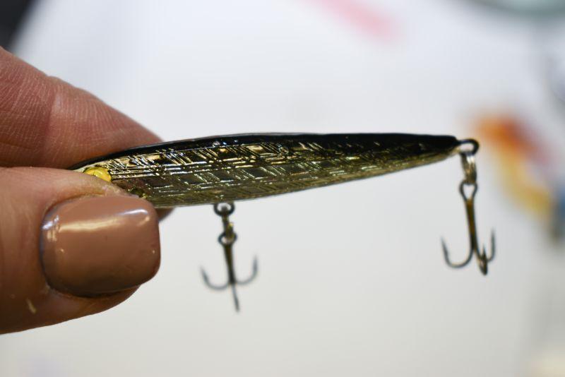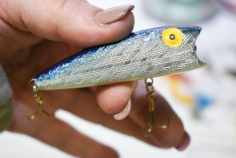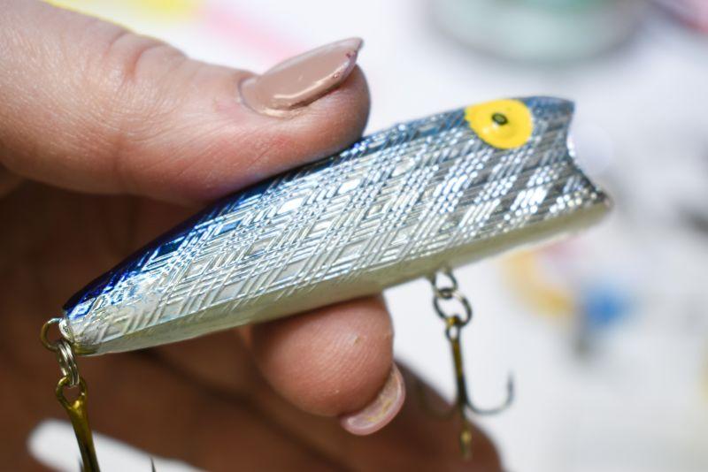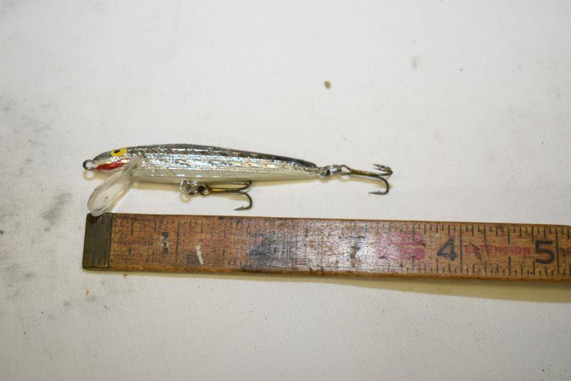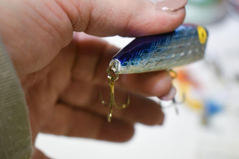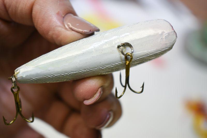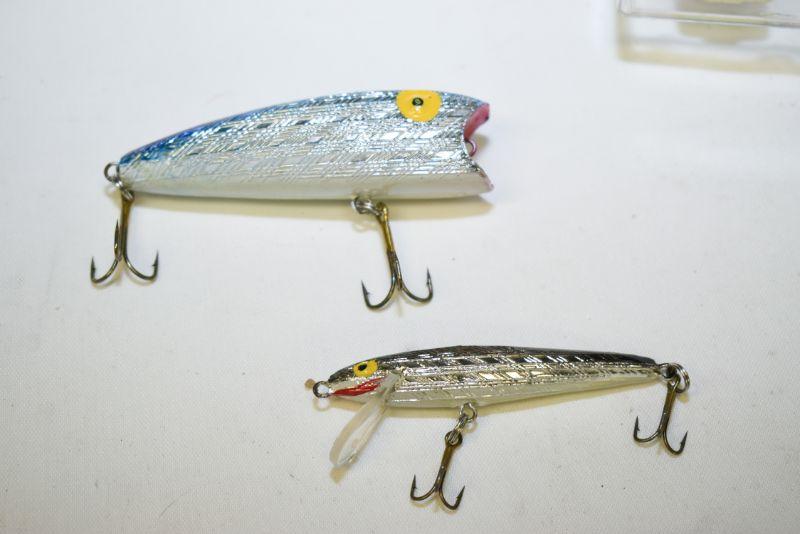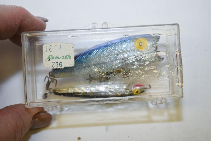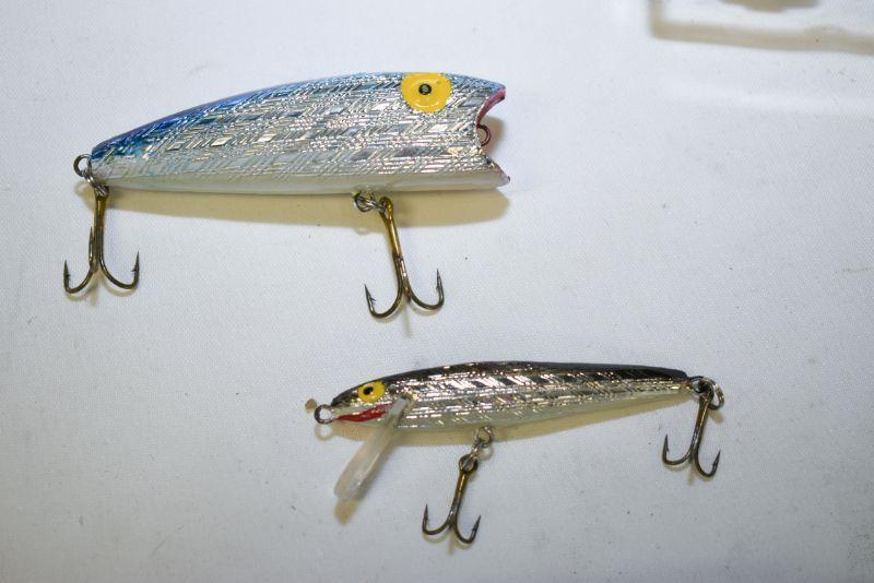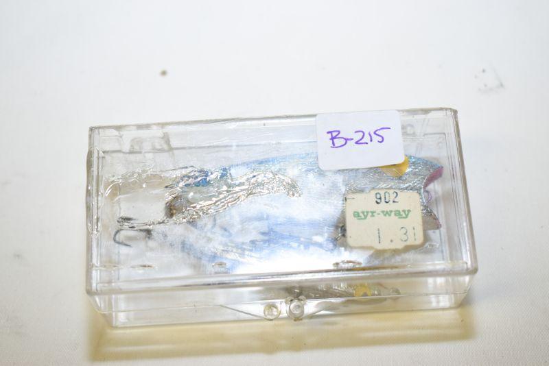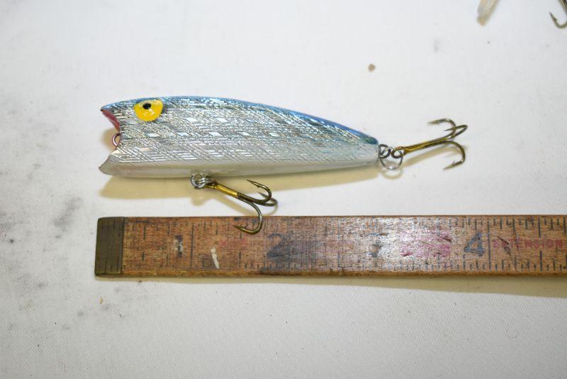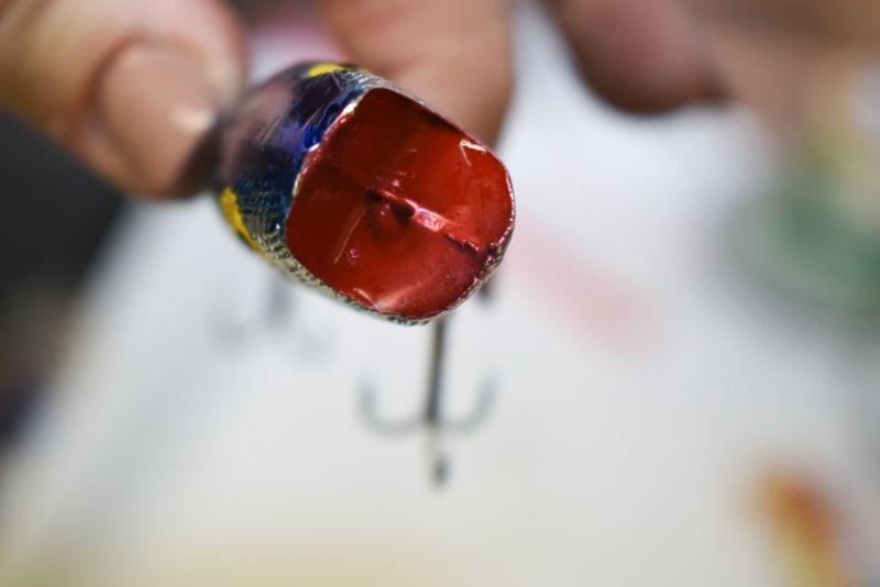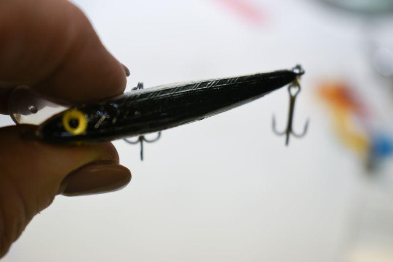 Two vintage fishing lures. Located in basement that has narrow, steep, cement steps, and a sharp turn to right at bottom.