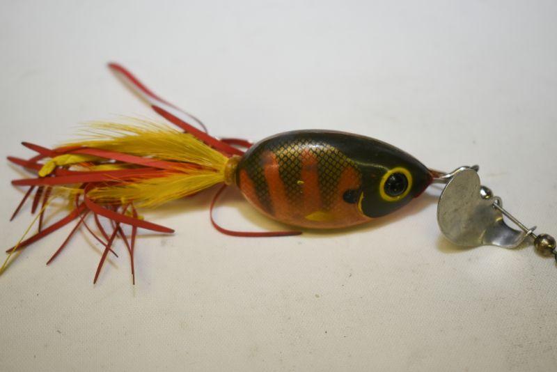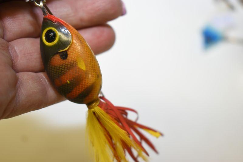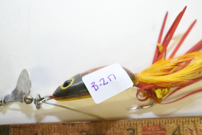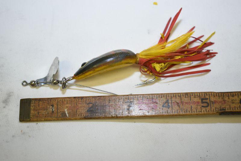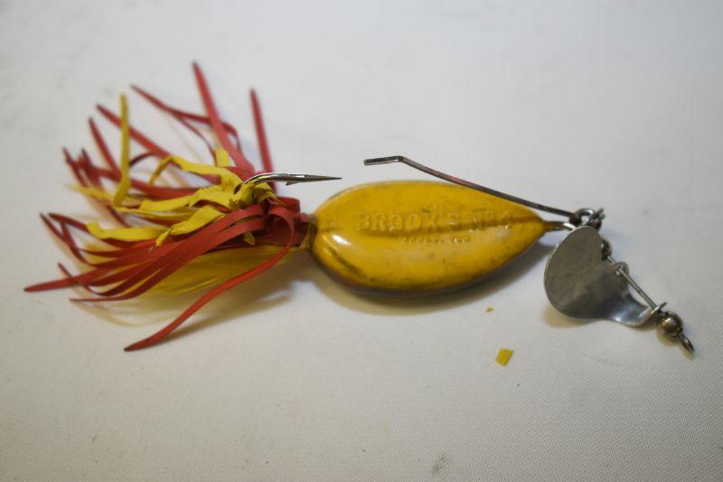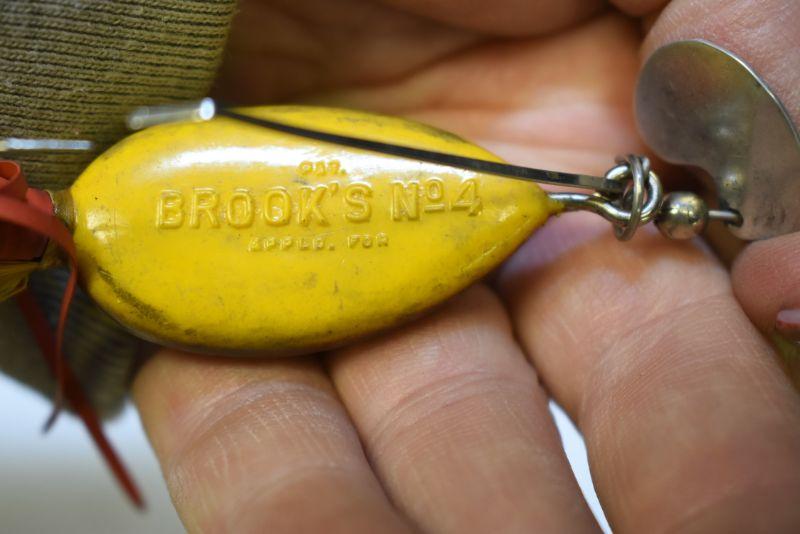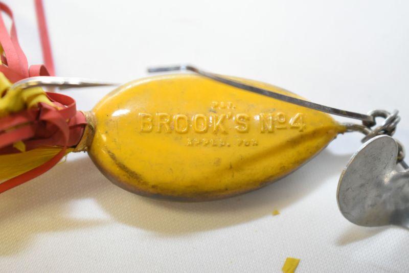 Vintage Brook's No. 4 fishing lure. Located in basement that has narrow, steep, cement steps, and a sharp turn to right at bottom.