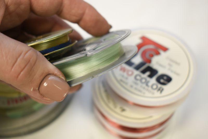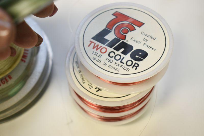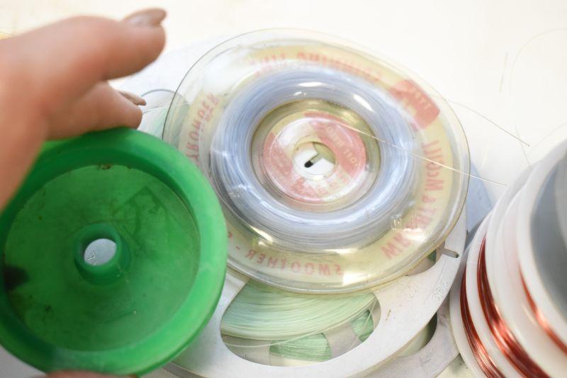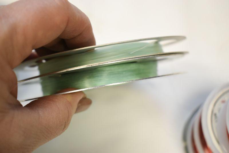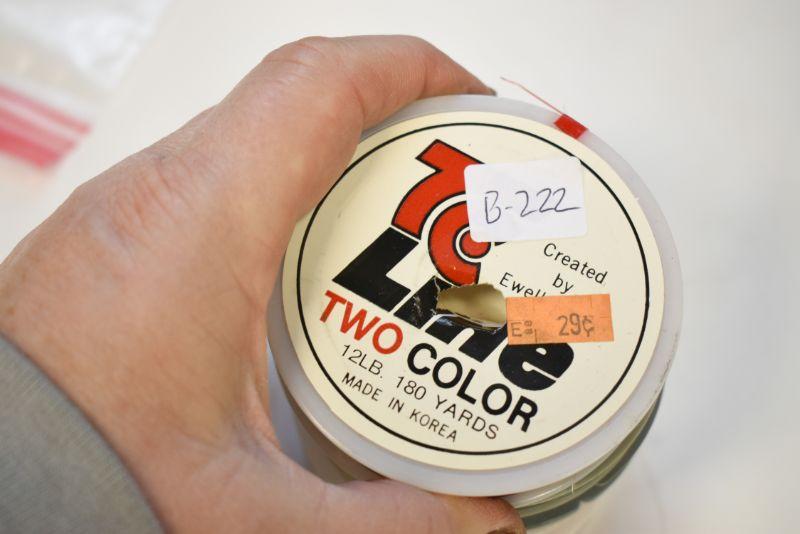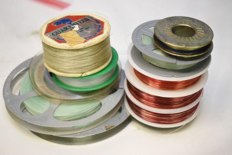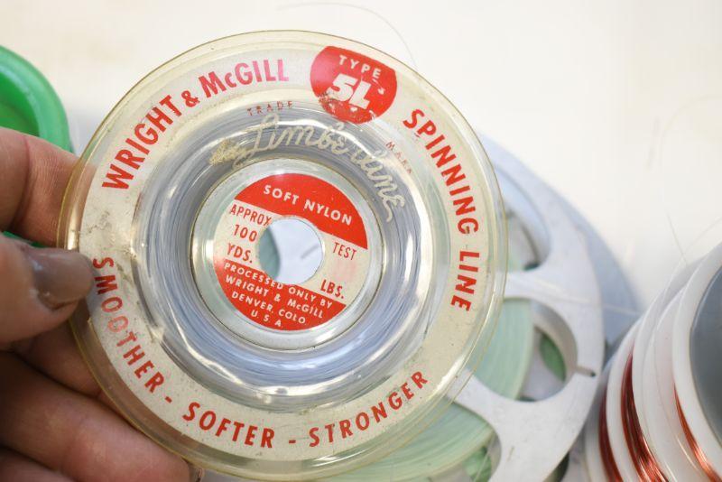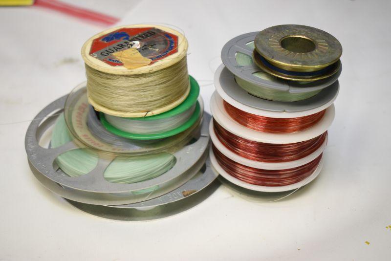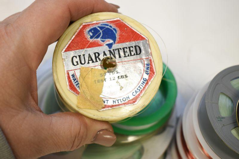 Several reels of fishing line, different weights. Located in basement that has narrow, steep, cement steps, and a sharp turn to right at bottom.