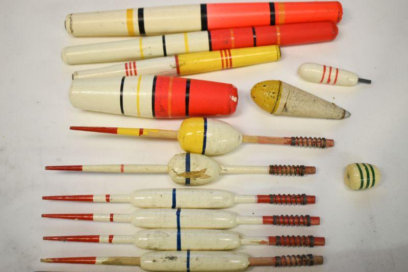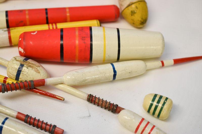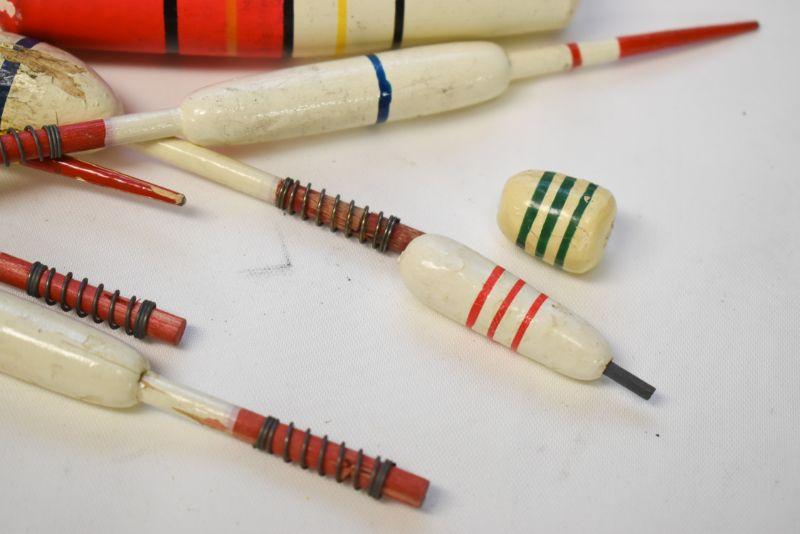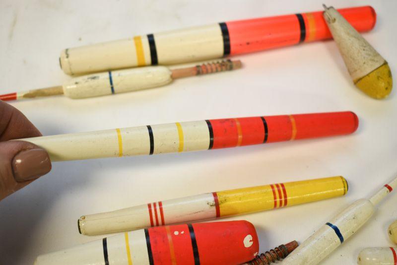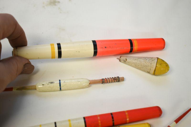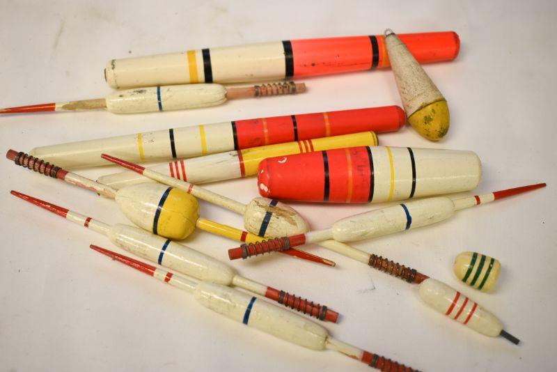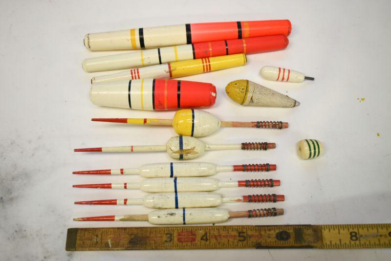 Used, vintage floats. Assortment of sizes. Located in basement that has narrow, steep, cement steps, and a sharp turn to right at bottom.