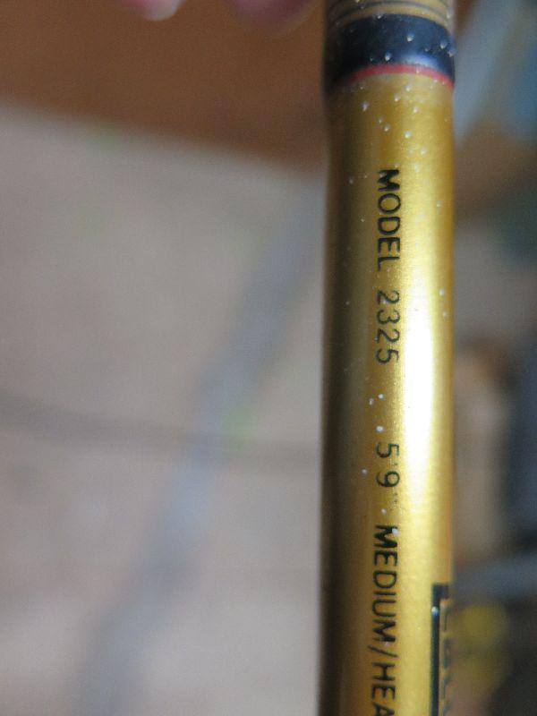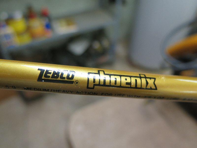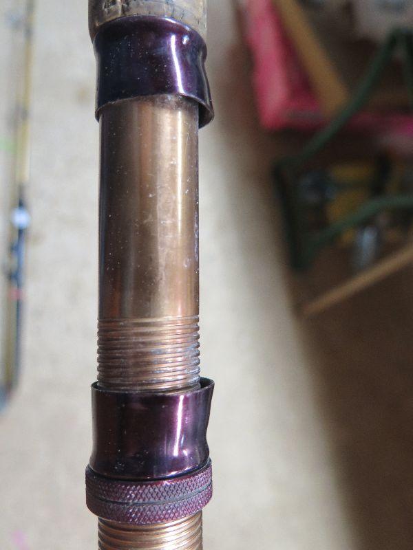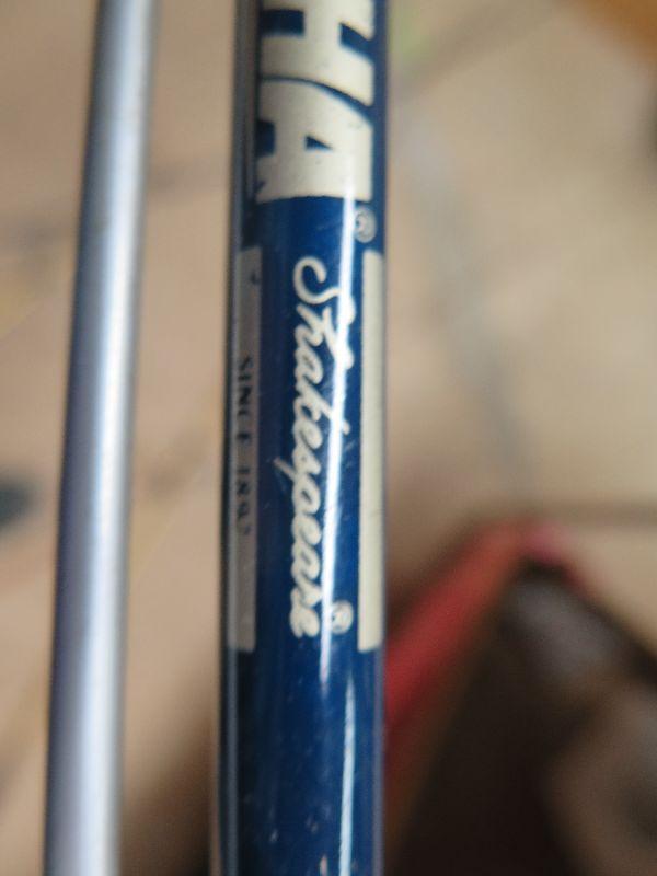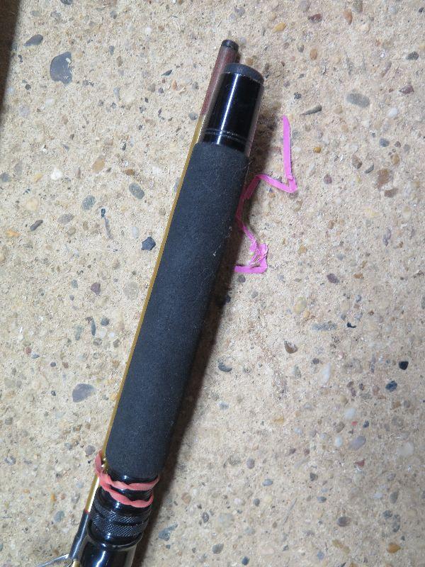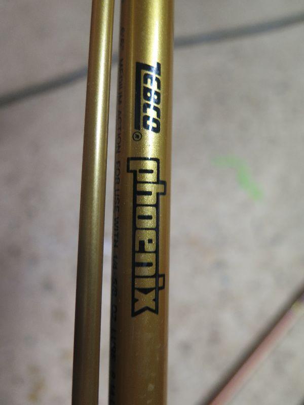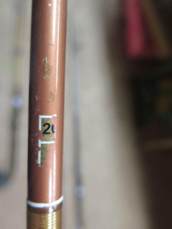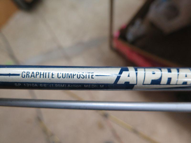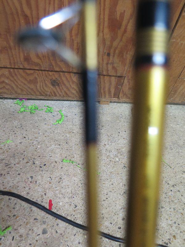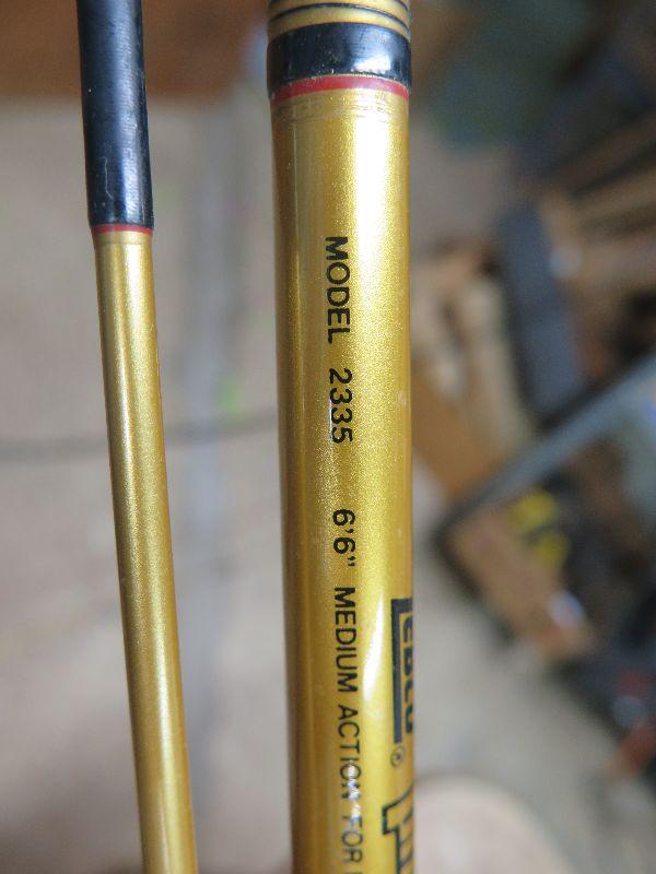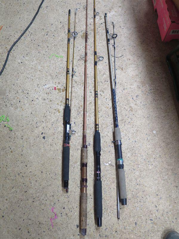 Four used fishing poles. Located in basement that has narrow, steep, cement steps, and a sharp turn to right at bottom.