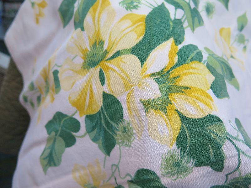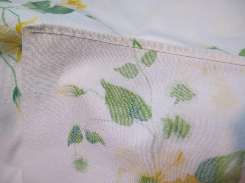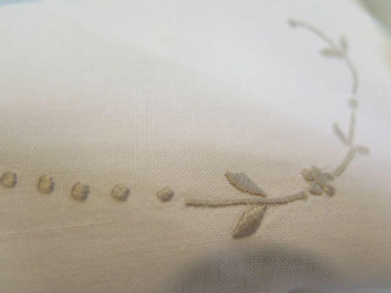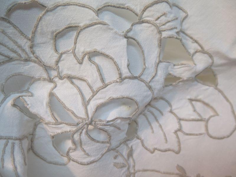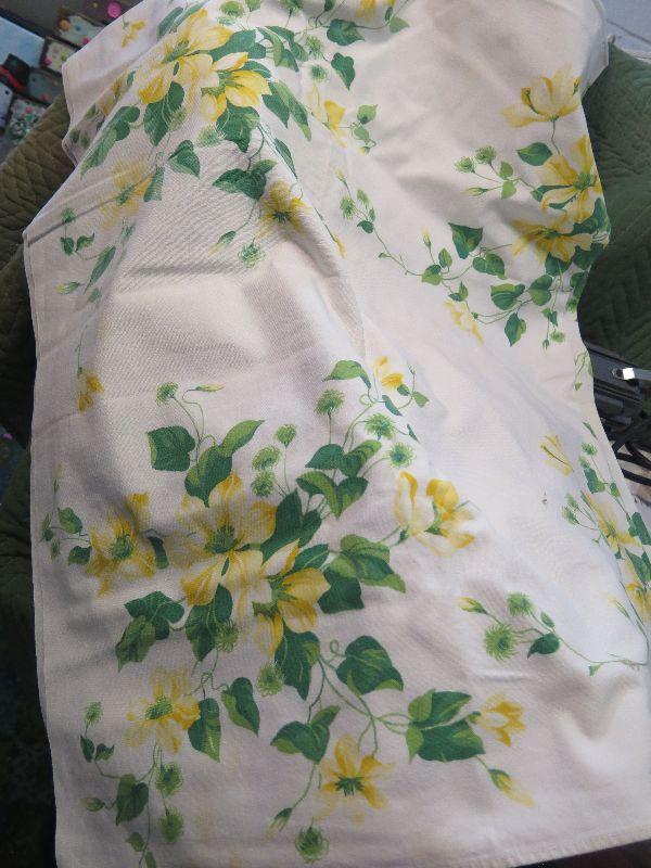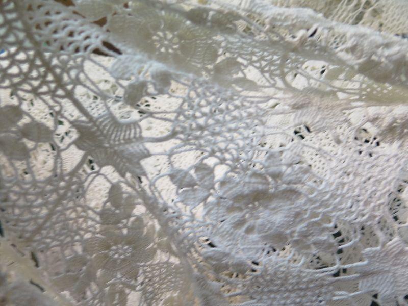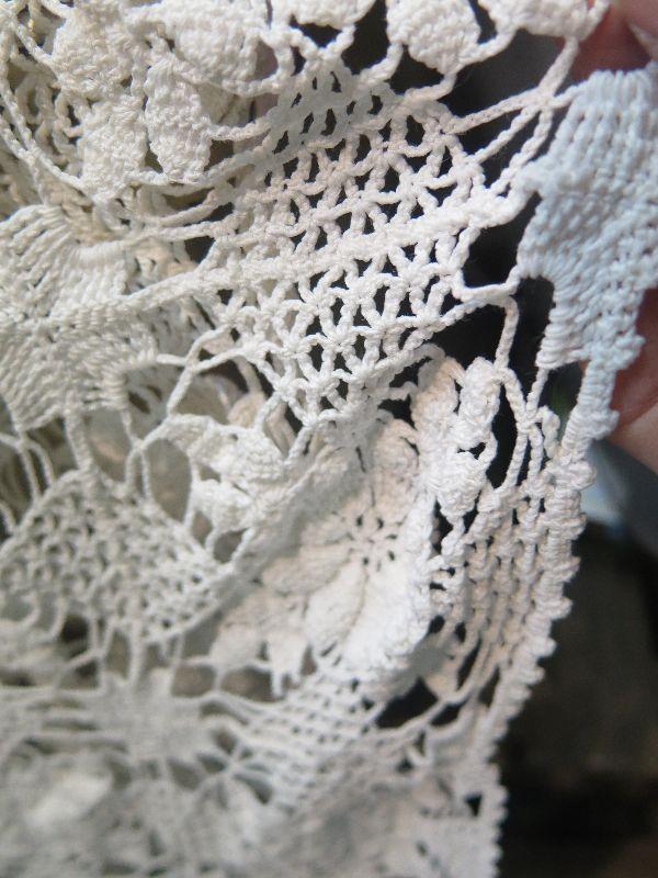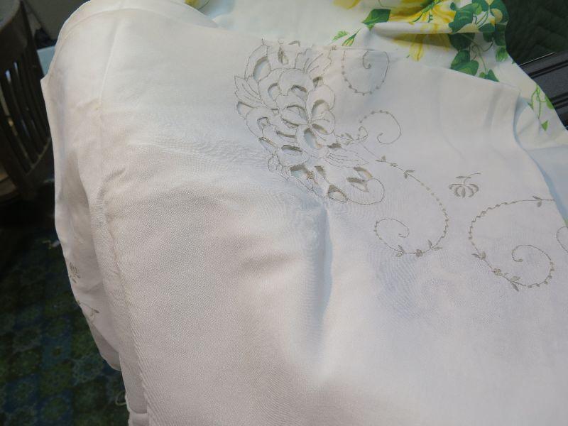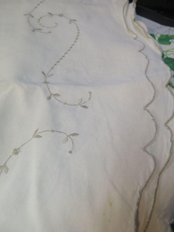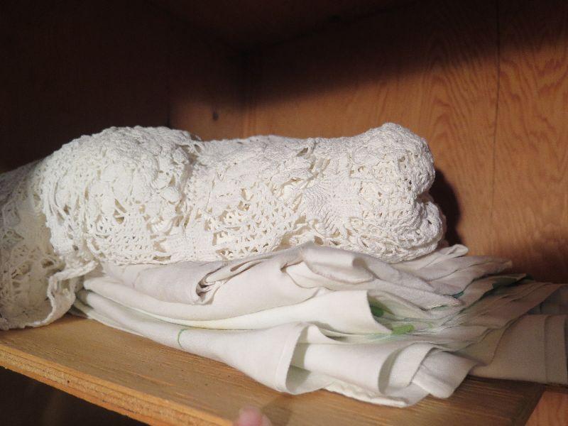 Crochet table cloth, 80x60, embroidered table cloth is round. Some staining. Located in basement that has narrow, steep, cement steps, and a sharp turn to right at bottom.