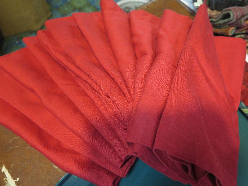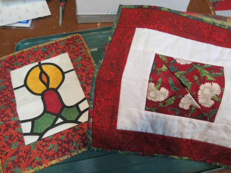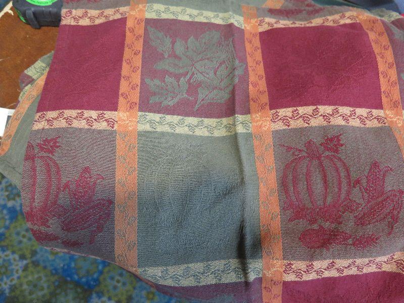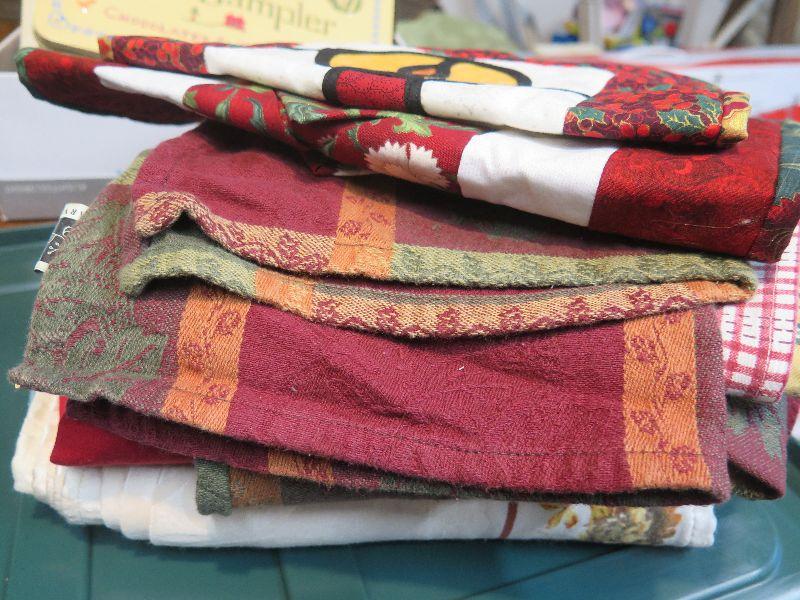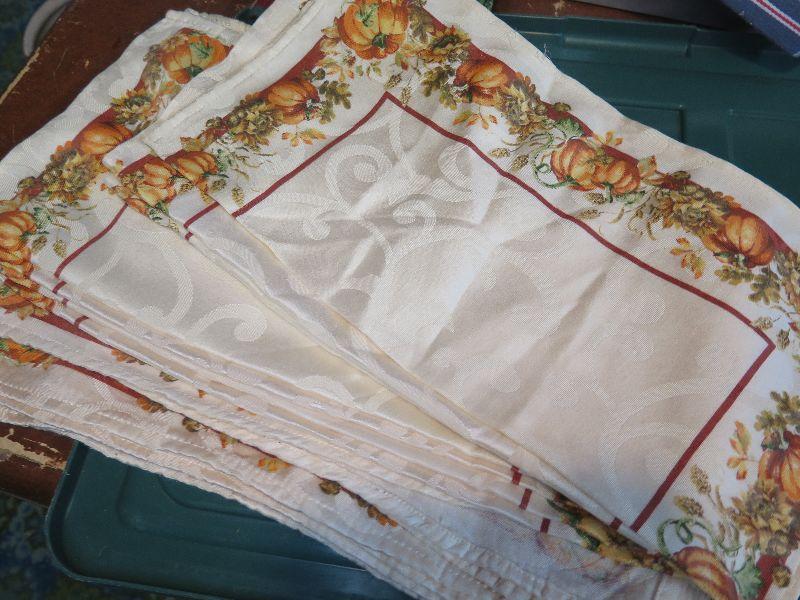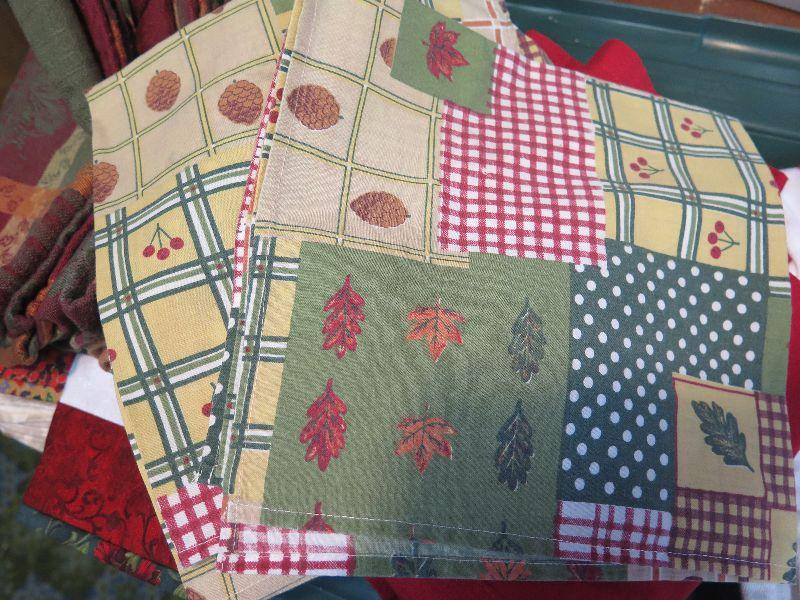 Place mats, napkins, and quilted holiday decor. Bring box to remove. Located in basement that has narrow, steep, cement steps, and a sharp turn to right at bottom.