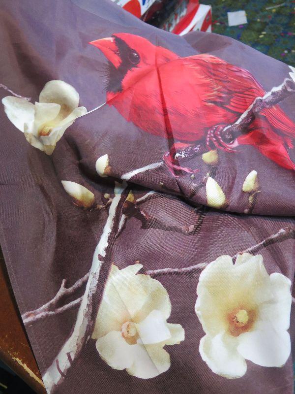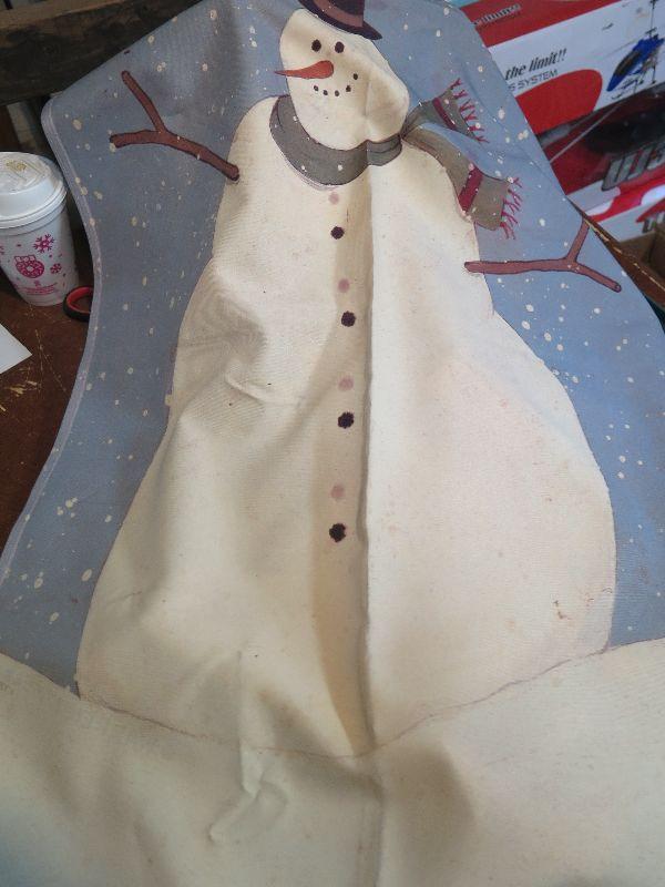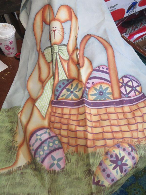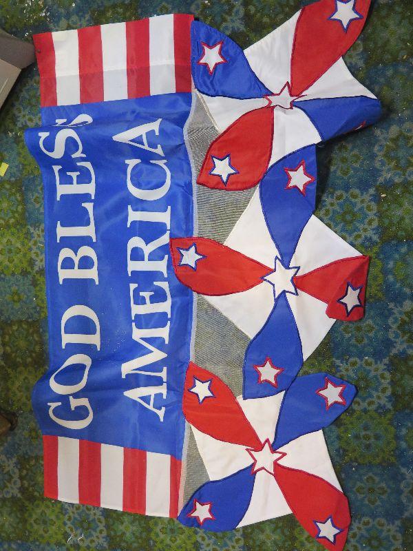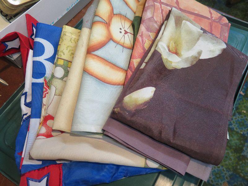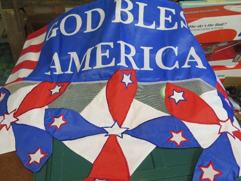 Easter Bunny, cardinals, snowman, American flag and more. All in good condition. God Bless America flag is 42x29. Located in basement that has narrow, steep, cement steps, and a sharp turn to right at bottom.