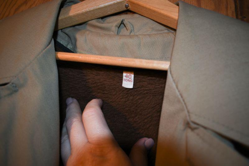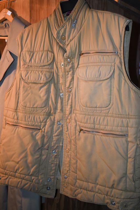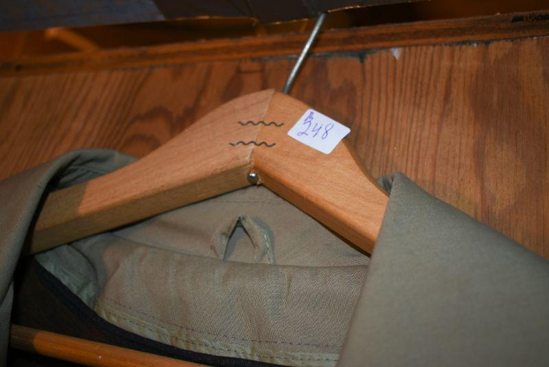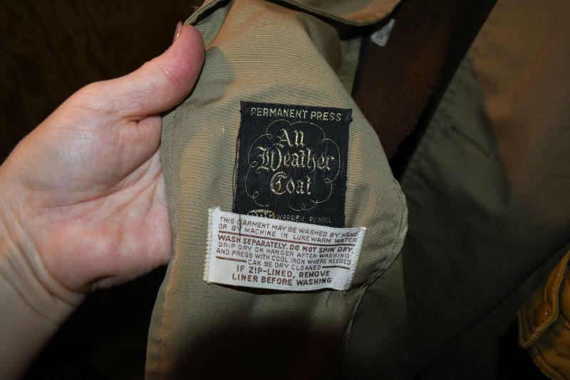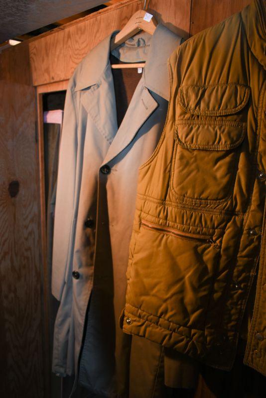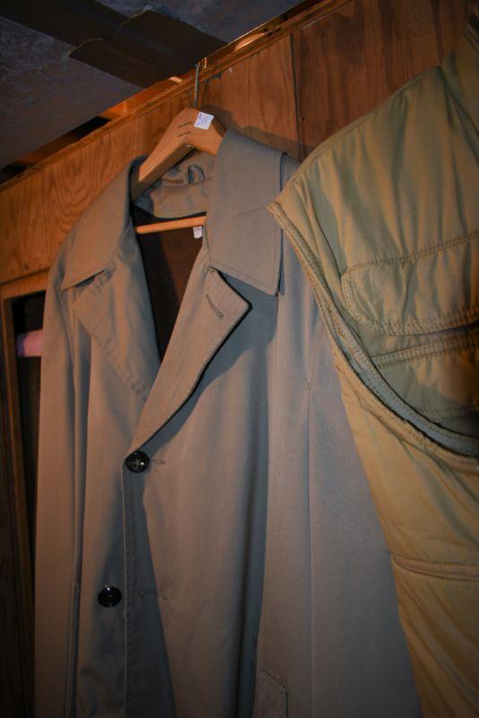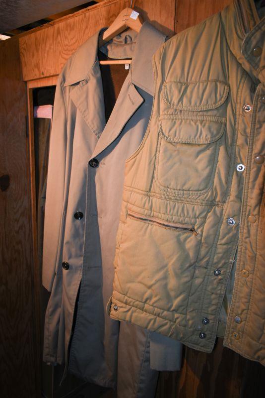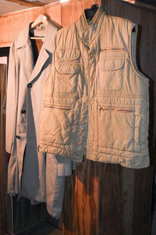 The Weather Coat trench coat with removable liner, size 9, and a Private Club vest, size large. Both used, but in good condition. Located in basement that has narrow, steep, cement steps, and a sharp turn to right at bottom.