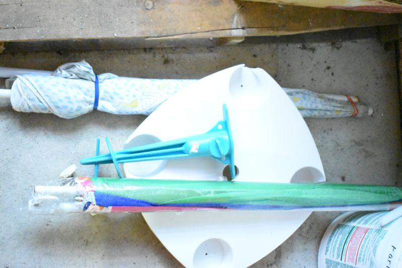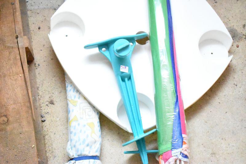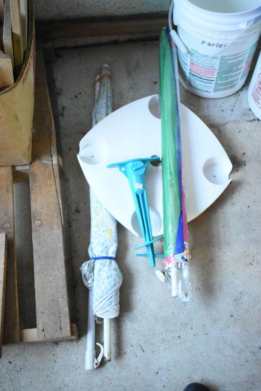 Two beach umbrellas, a sand screw, and a beach table. Like new.