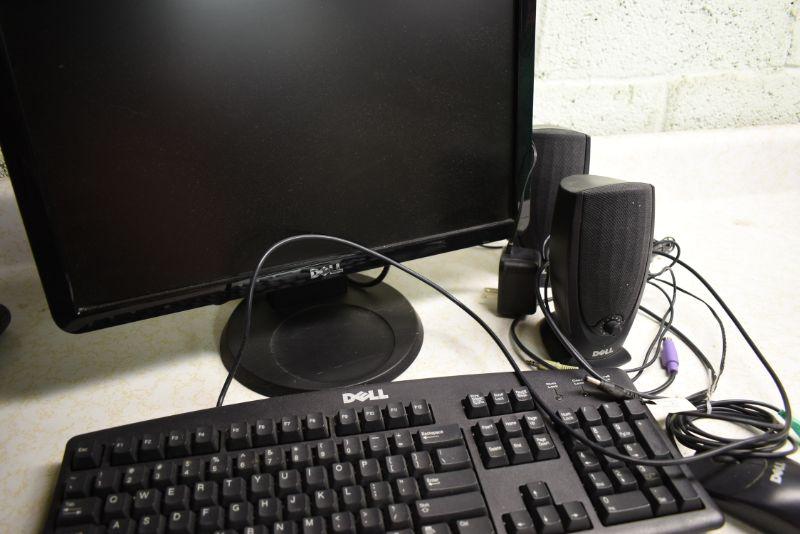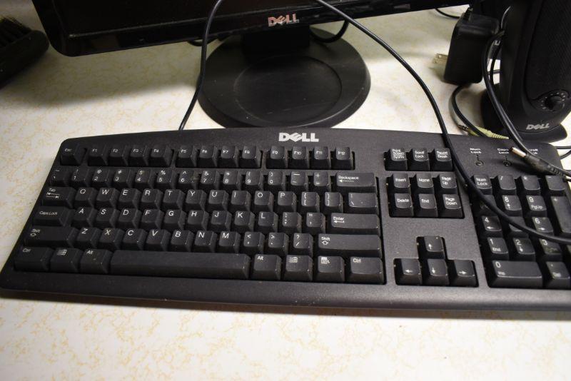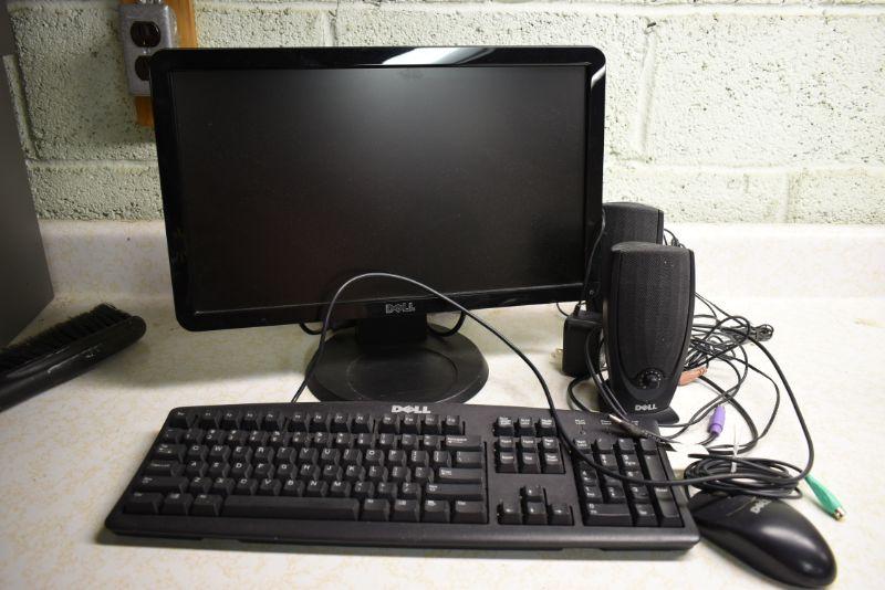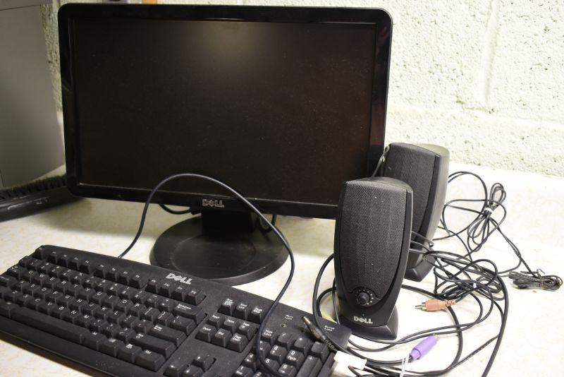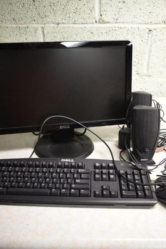 Dell keyboard, speakers, and monitor. Untested. Located in basement, with steep and narrow cement steps going down, with a sharp turn at bottom.