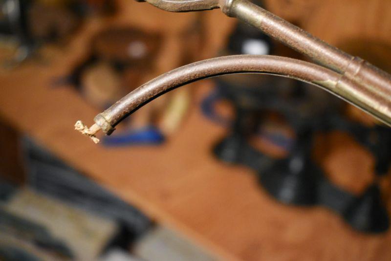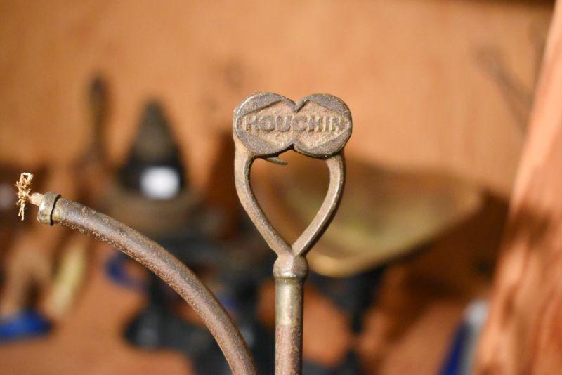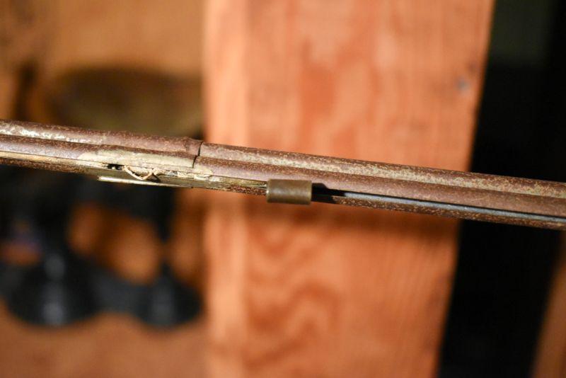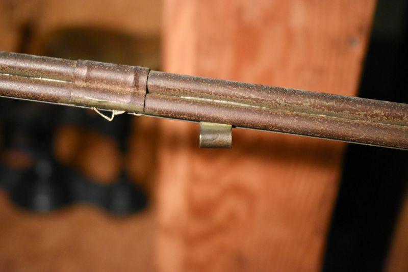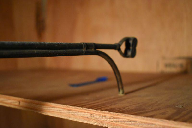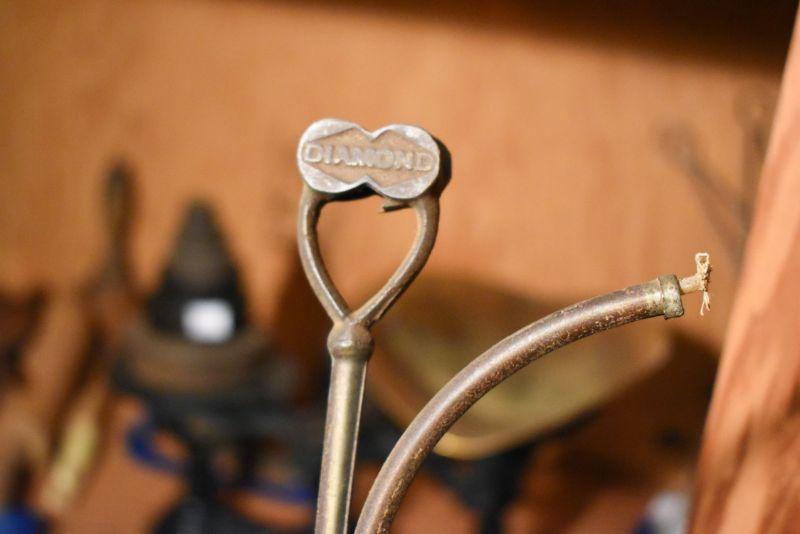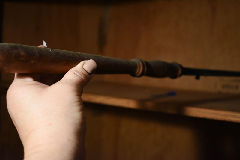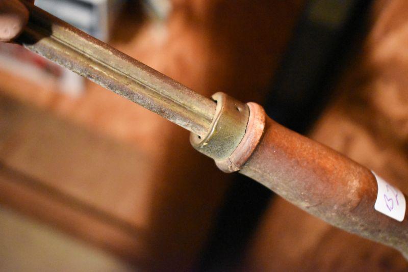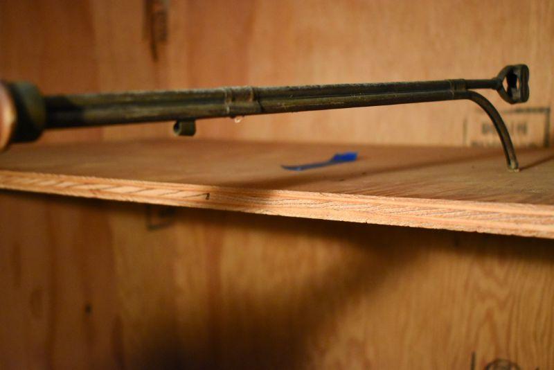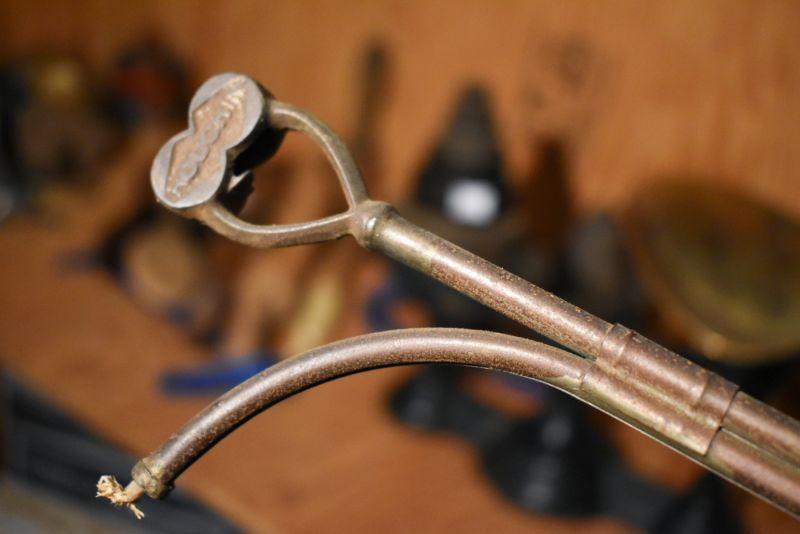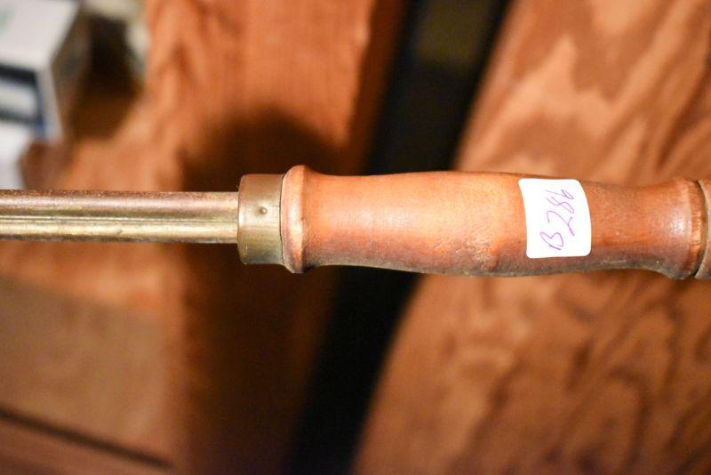 Vintage brass and wood street gas lamp lighter. 29 inches long. Located in basement that has narrow, steep, cement steps, and a sharp turn to right at bottom.