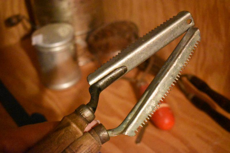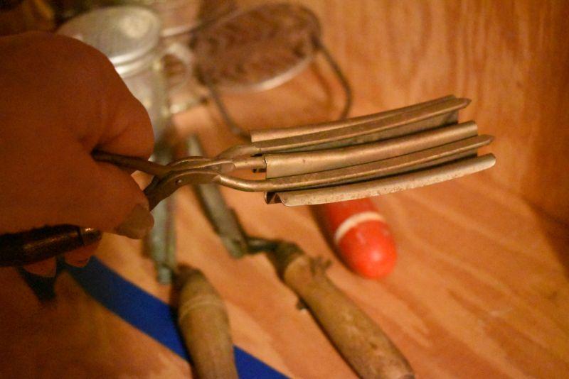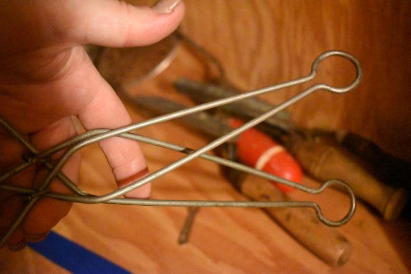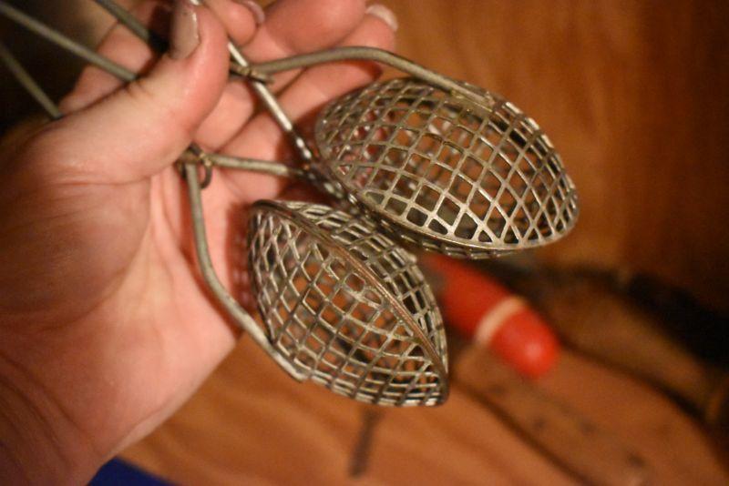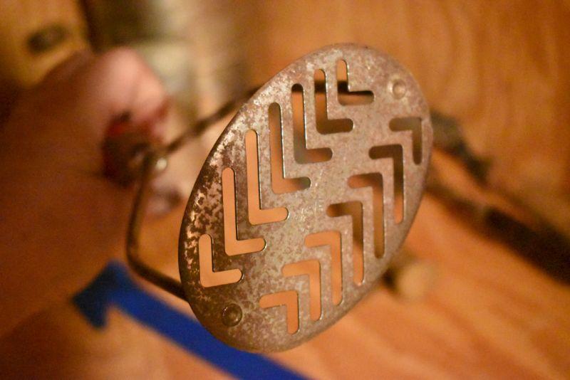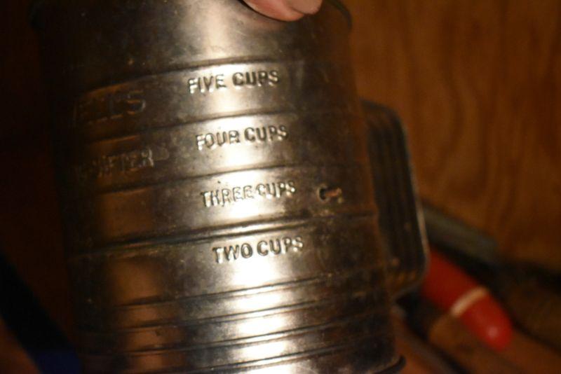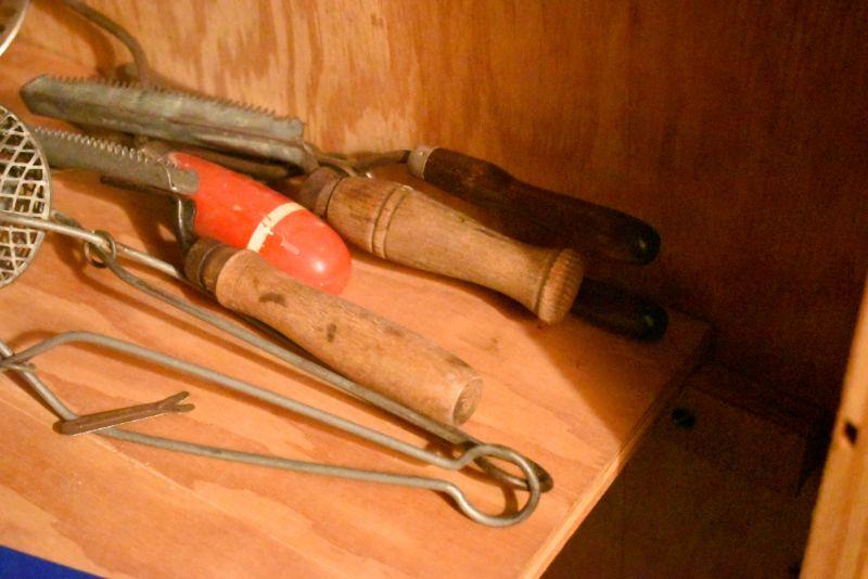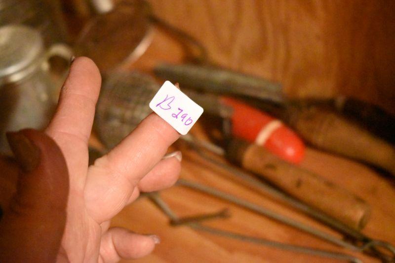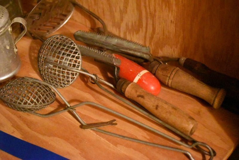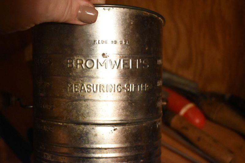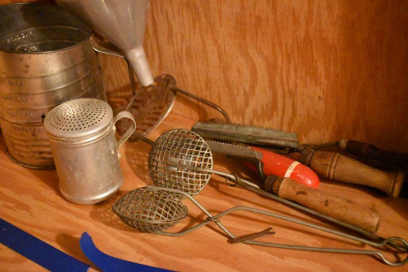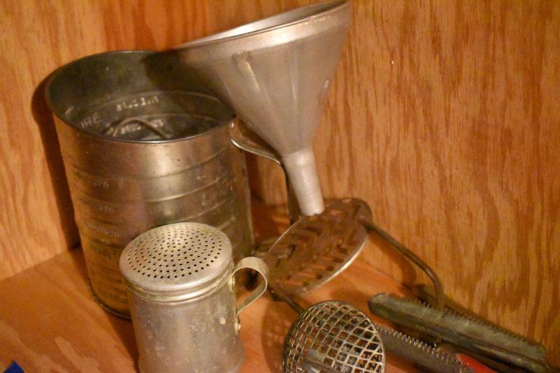 Sifter, shaker, funnel, masher and more. Bring box to remove. Located in basement that has narrow, steep, cement steps, and a sharp turn to right at bottom.