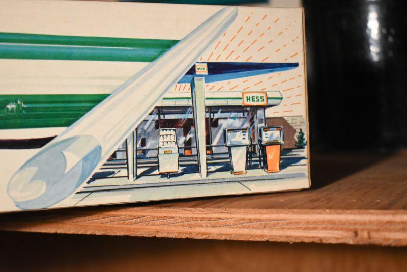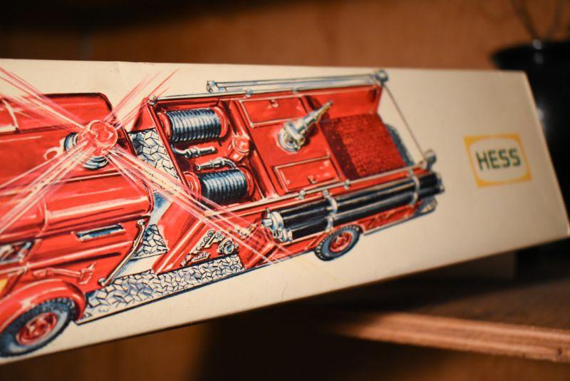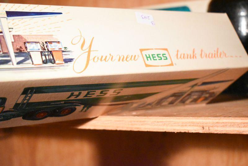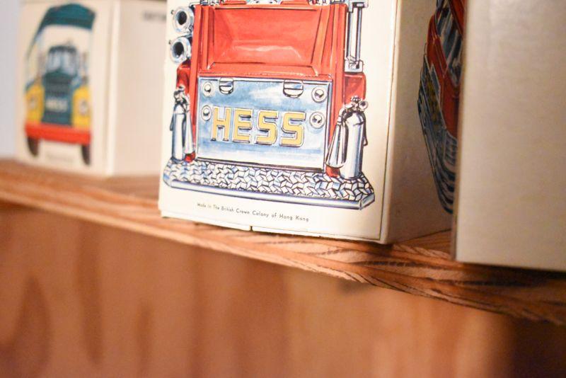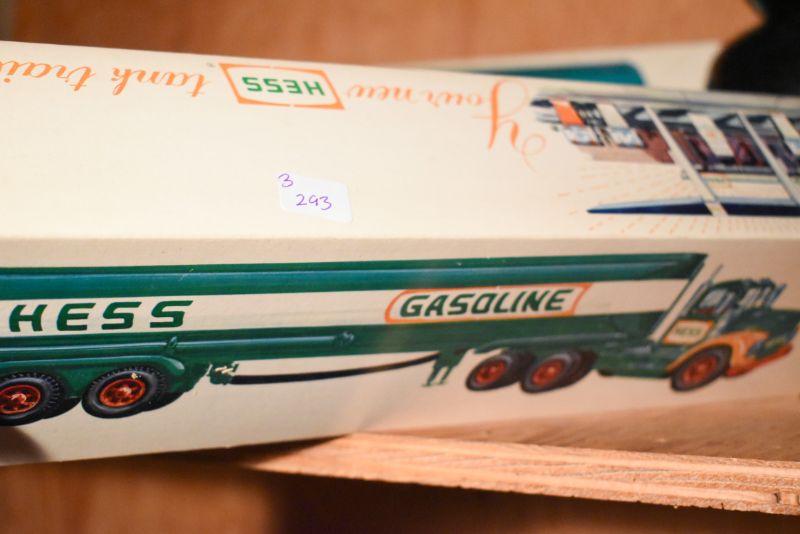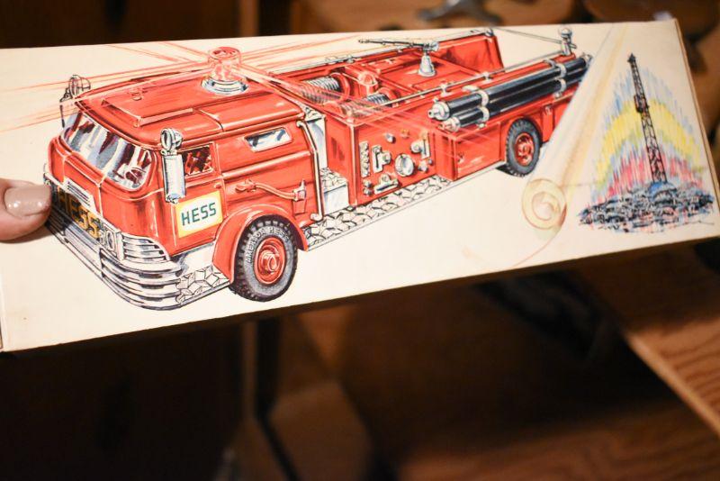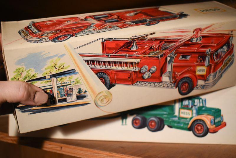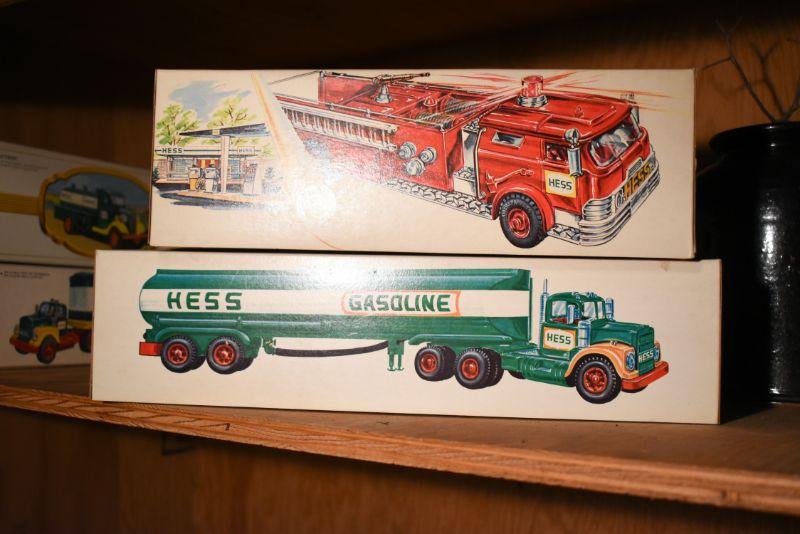 Fire truck and a tractor and trailer tanker. Located in basement that has narrow, steep, cement steps, and a sharp turn to right at bottom.