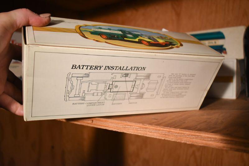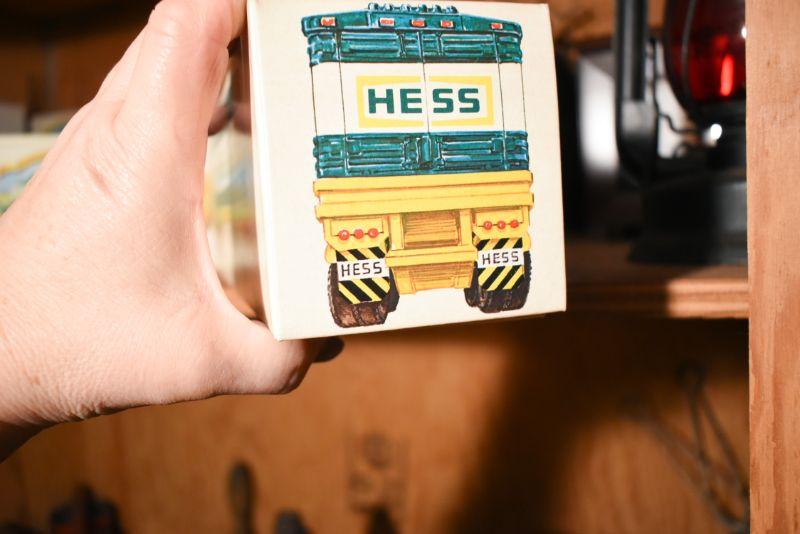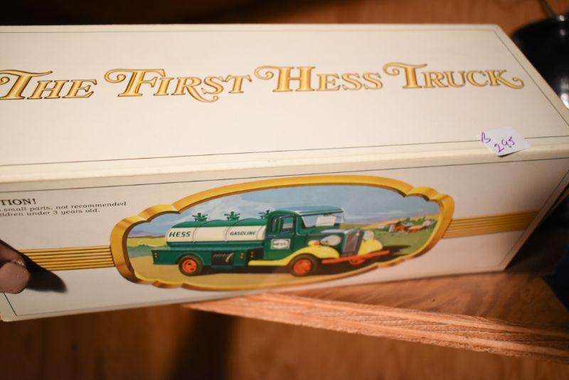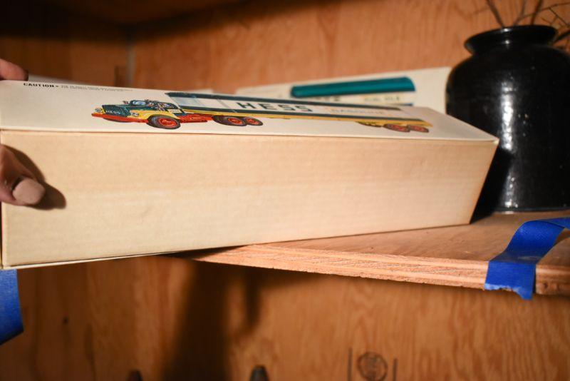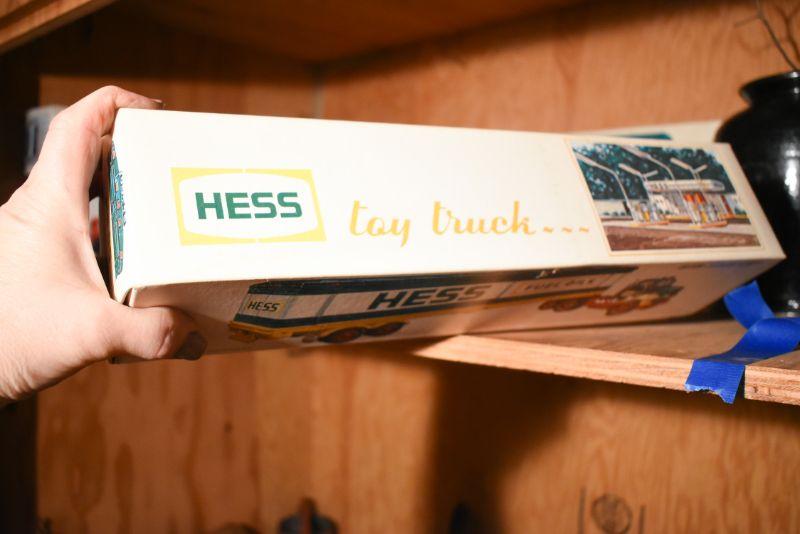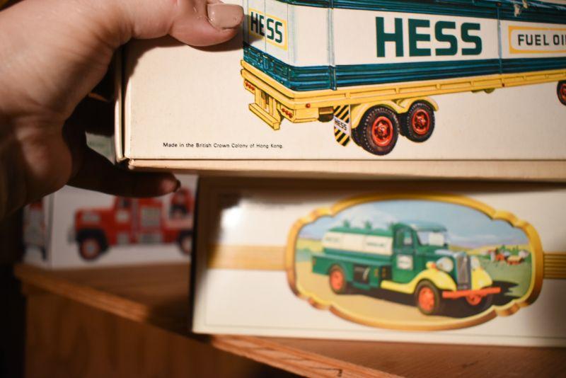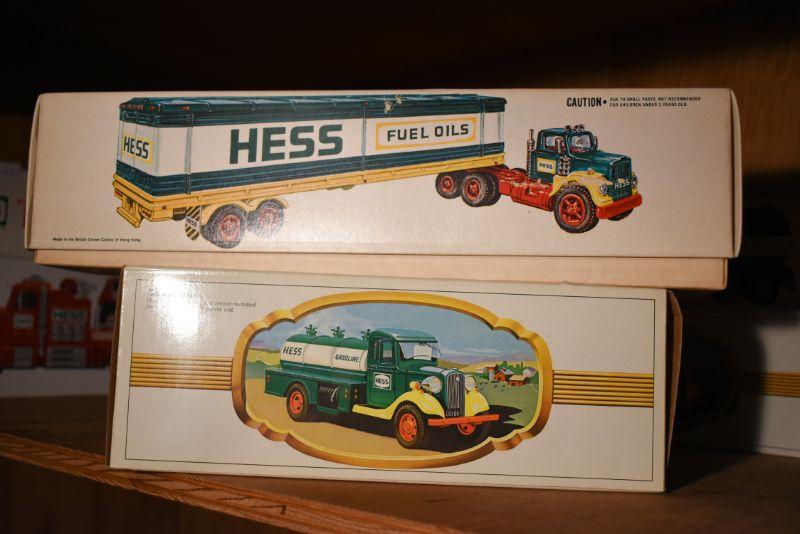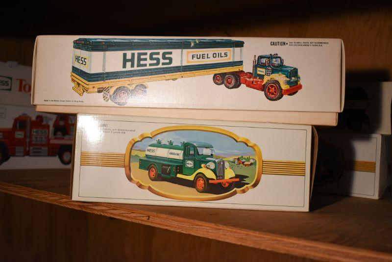 Hess tractor and trailer, and a Hess tanker. Located in basement that has narrow, steep, cement steps, and a sharp turn to right at bottom.