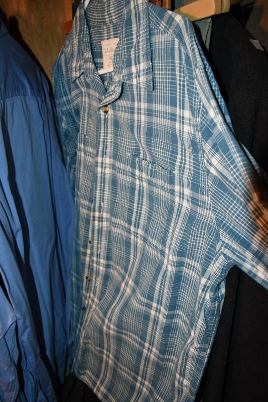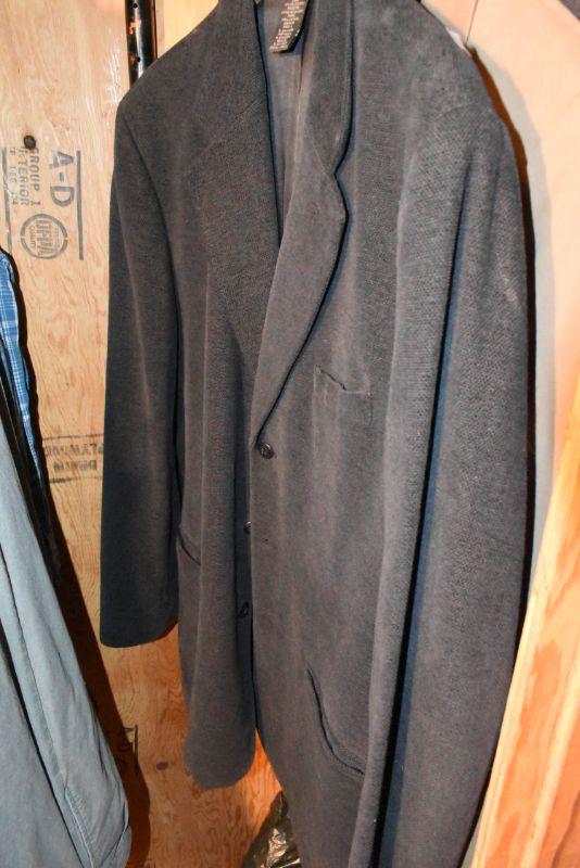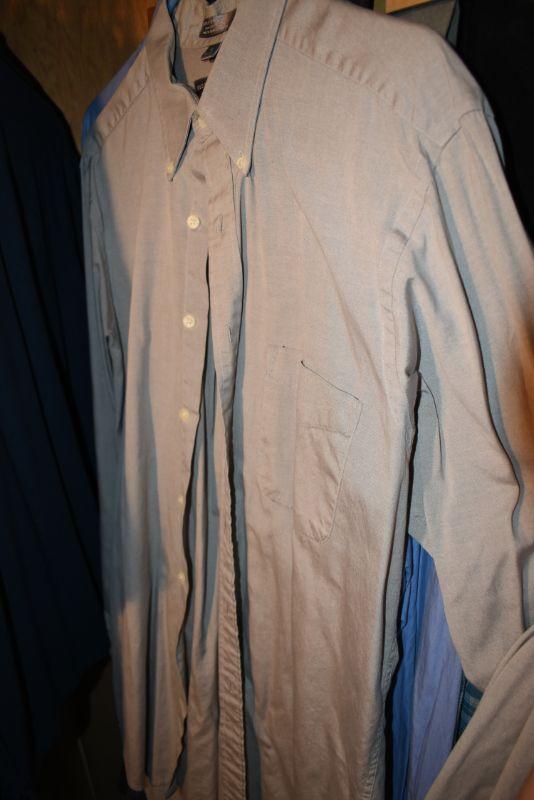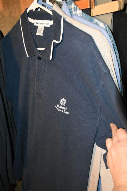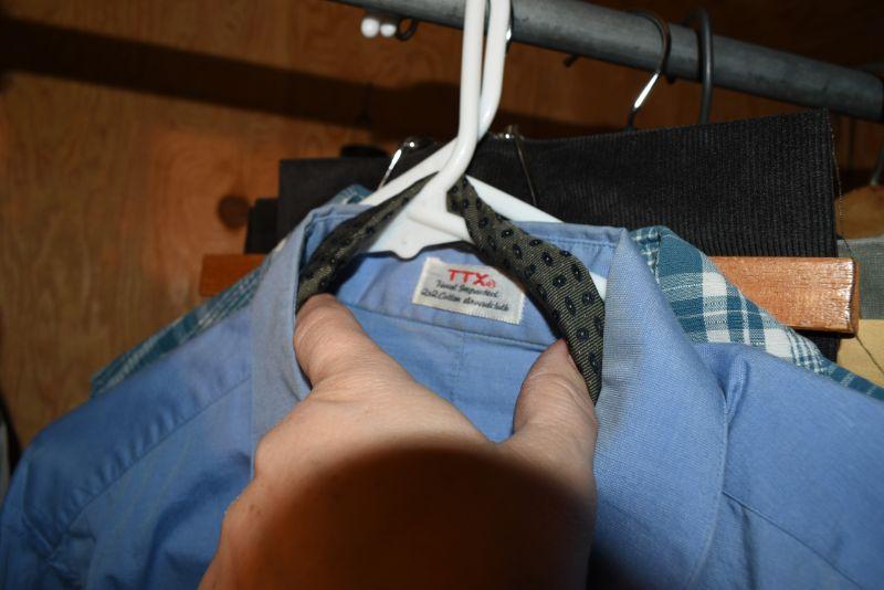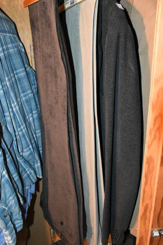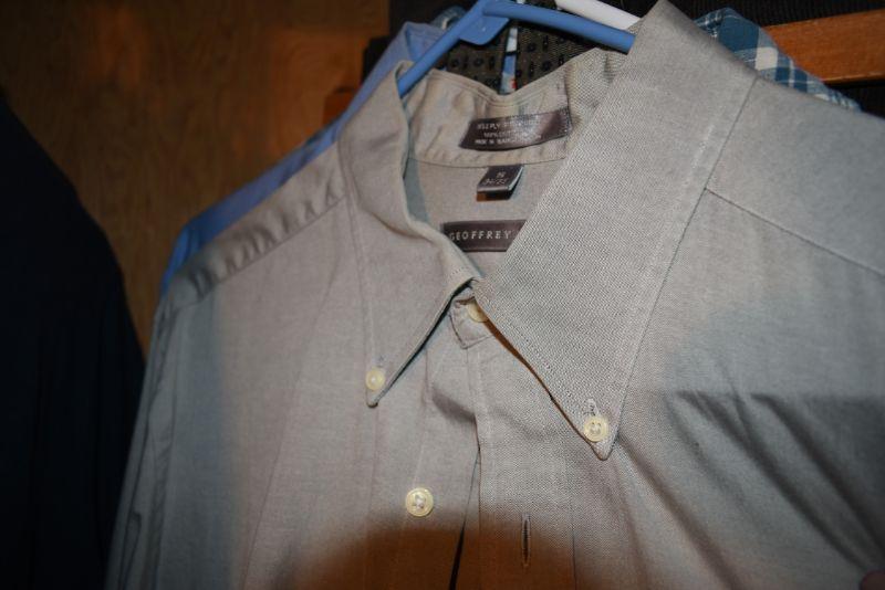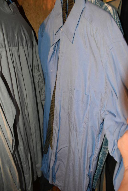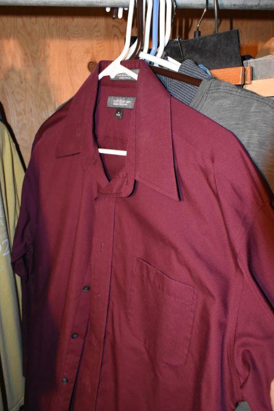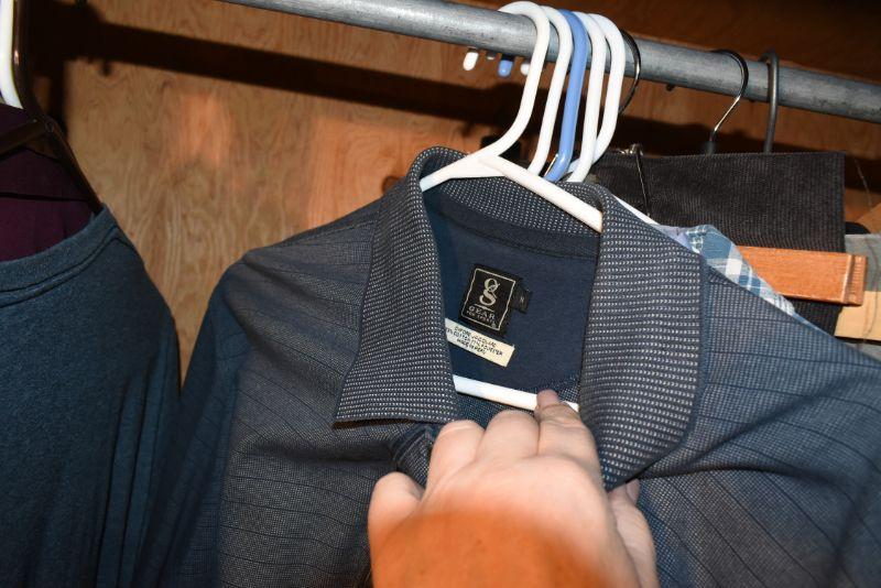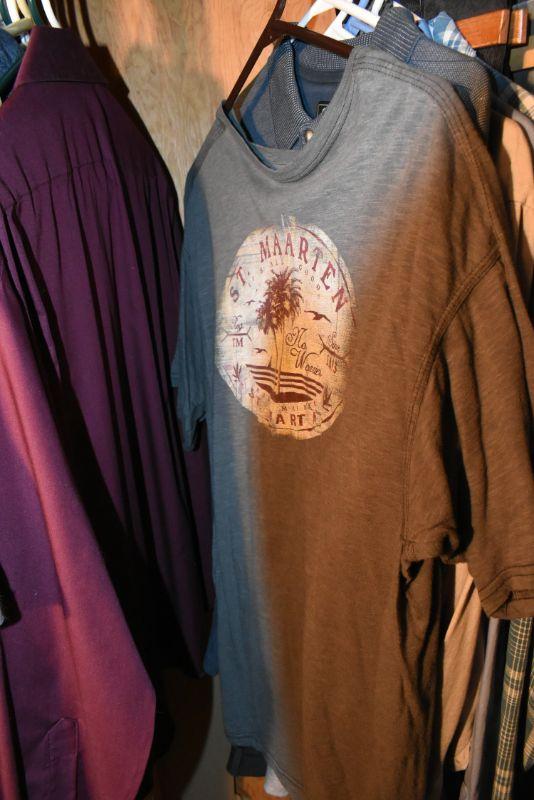 Men's shirts and suits in good condition. T shirts show wear. Bring bags to remove. Located in basement that has narrow, steep, cement steps, and a sharp turn to right at bottom.