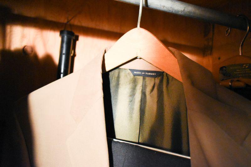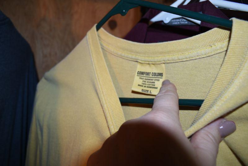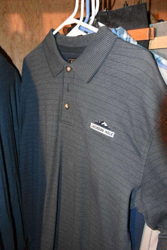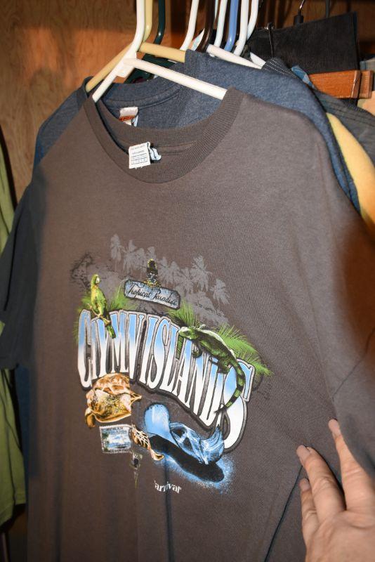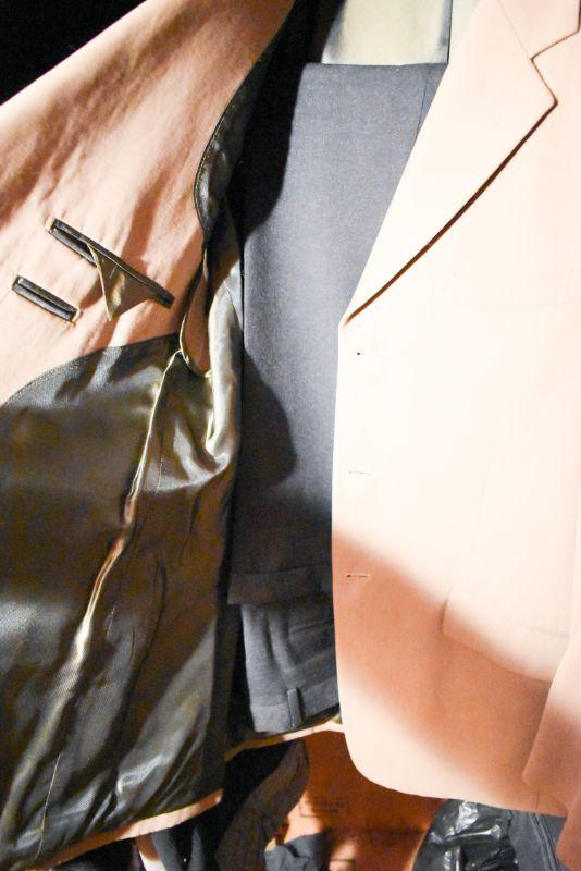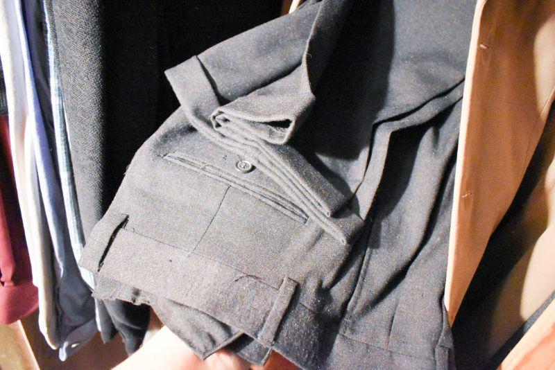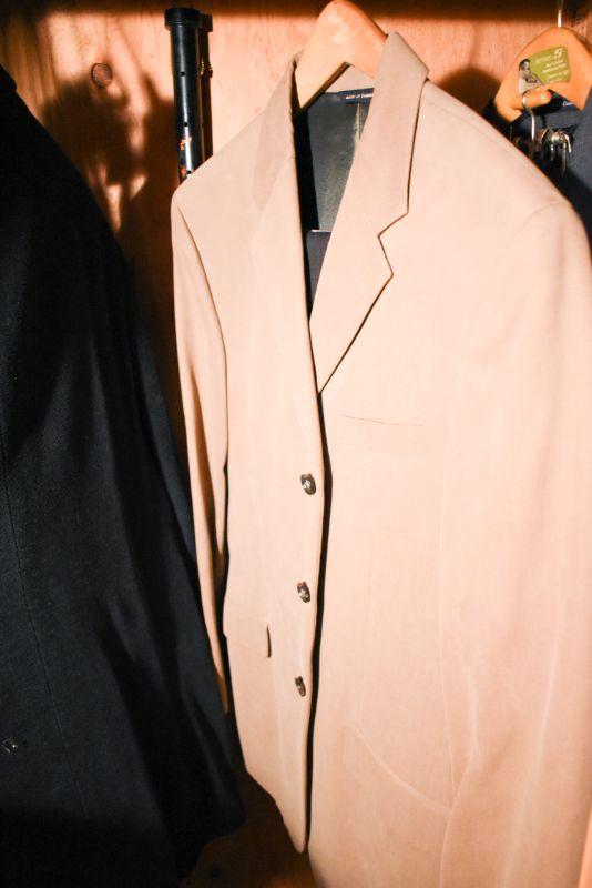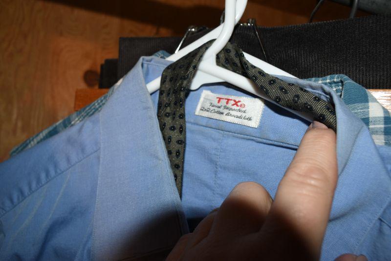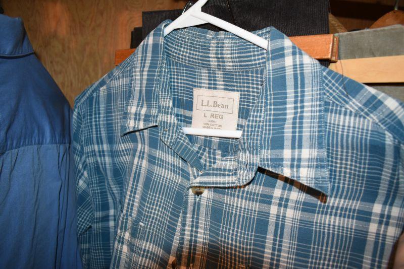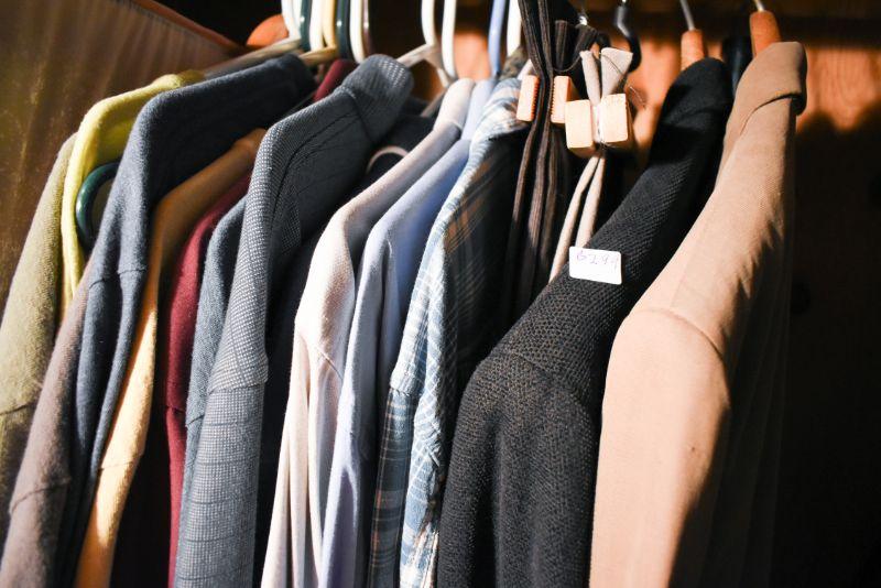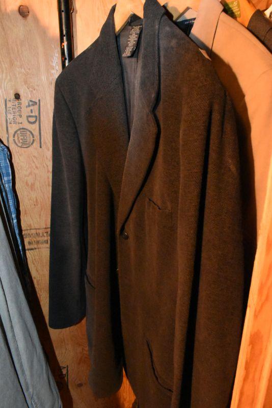 Men's shirts and suits in good condition. T shirts show wear. Bring bags to remove. Located in basement that has narrow, steep, cement steps, and a sharp turn to right at bottom.