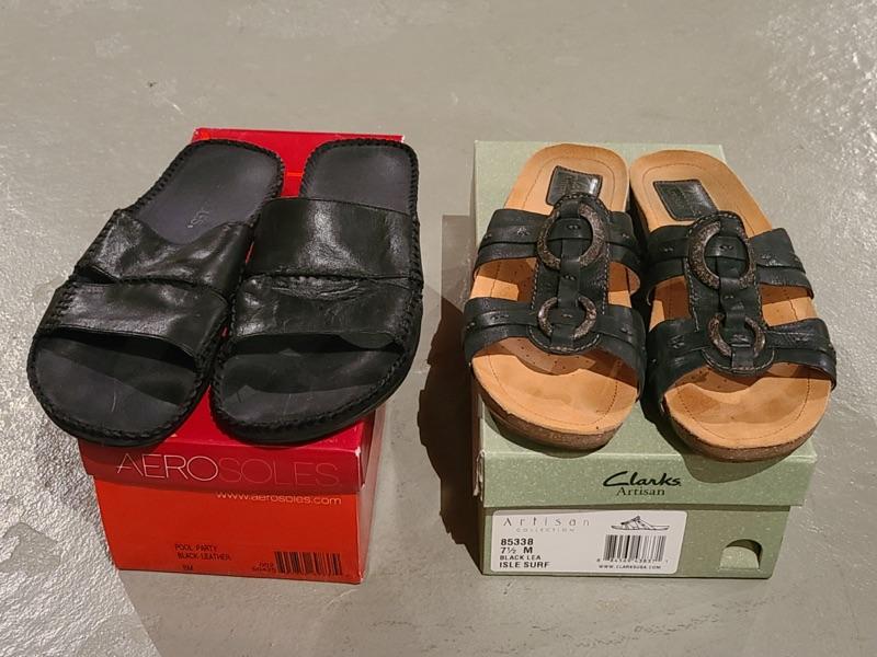 This is for a lot of two excellent pre-owned sandals! Two great brands, Clarks and Aerosoles! Please see pics for condition and sizing.