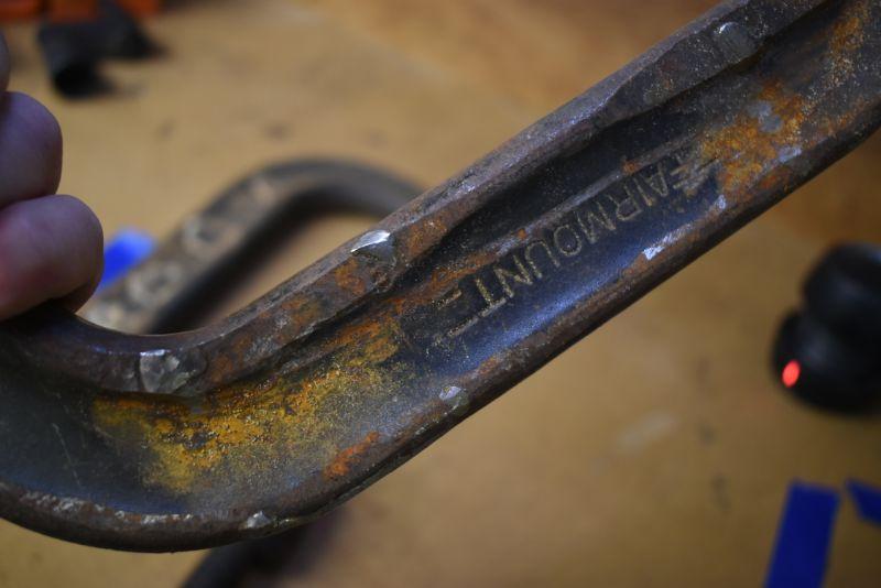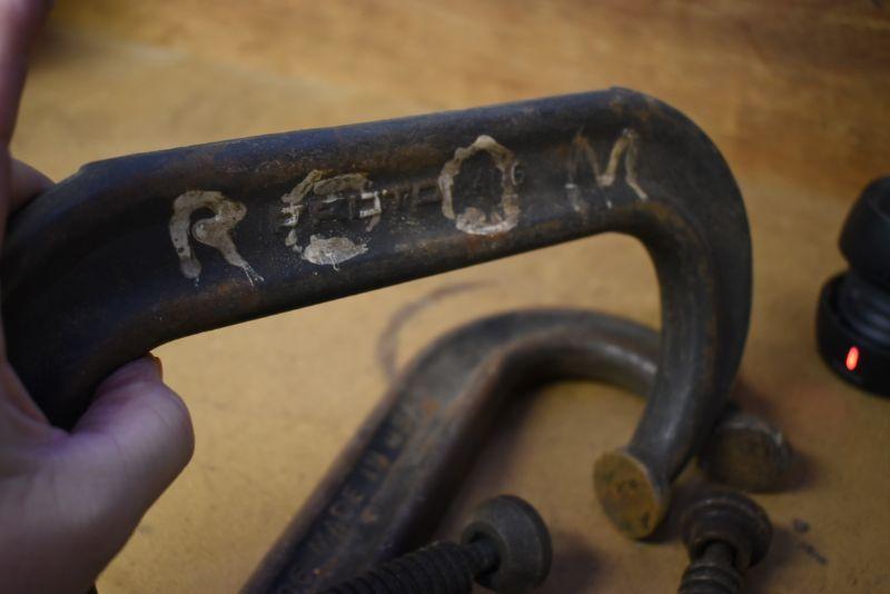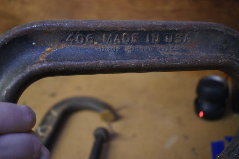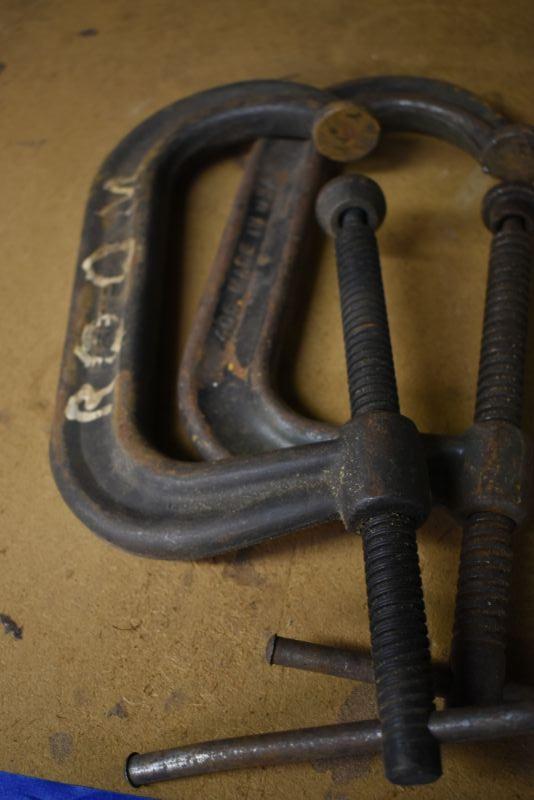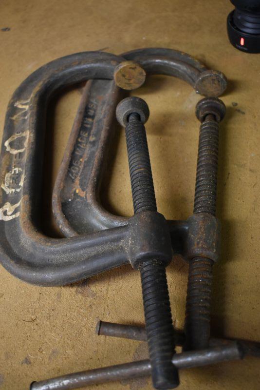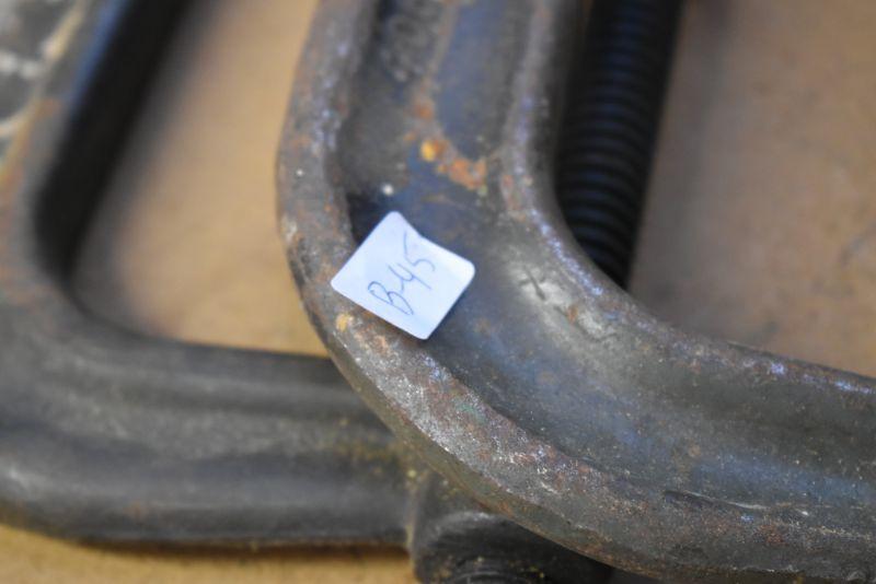 Two C clamps, eleven inches. Located in basement that has narrow, steep, cement steps, and a sharp turn to right at bottom.