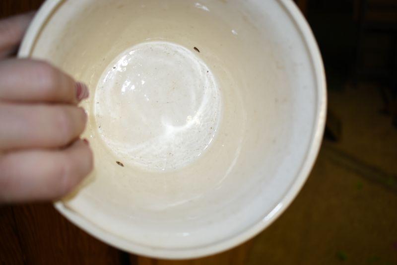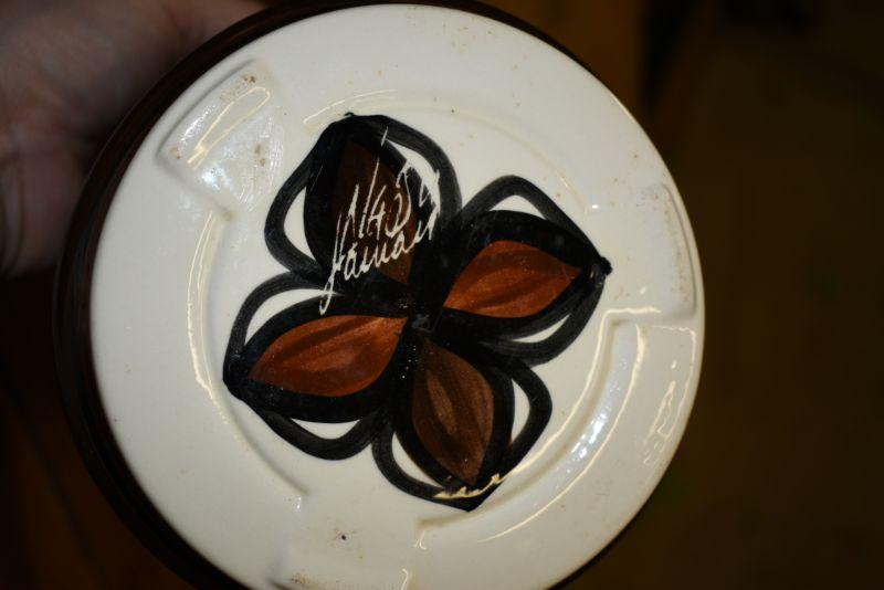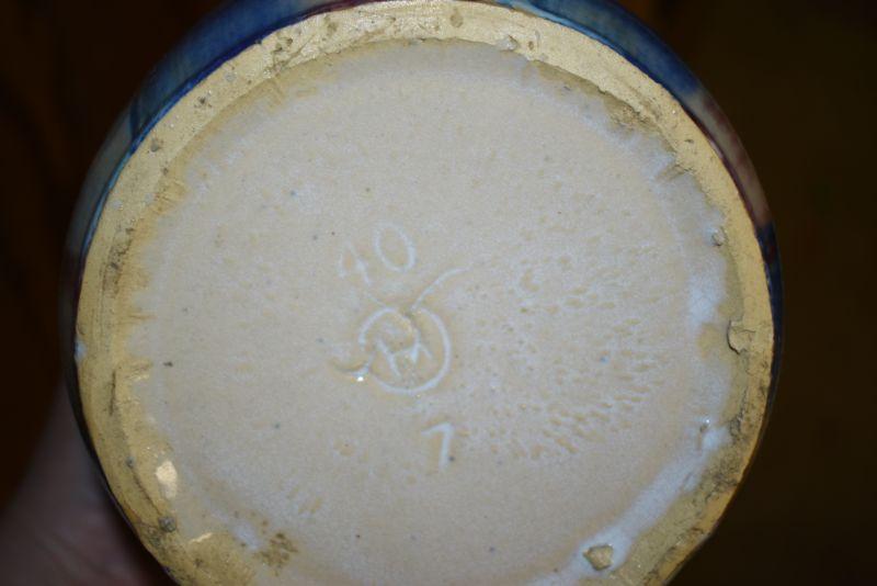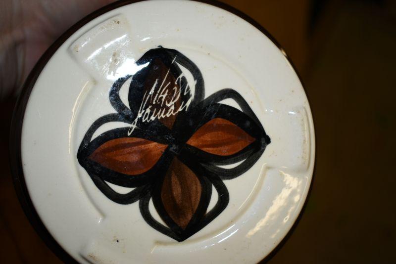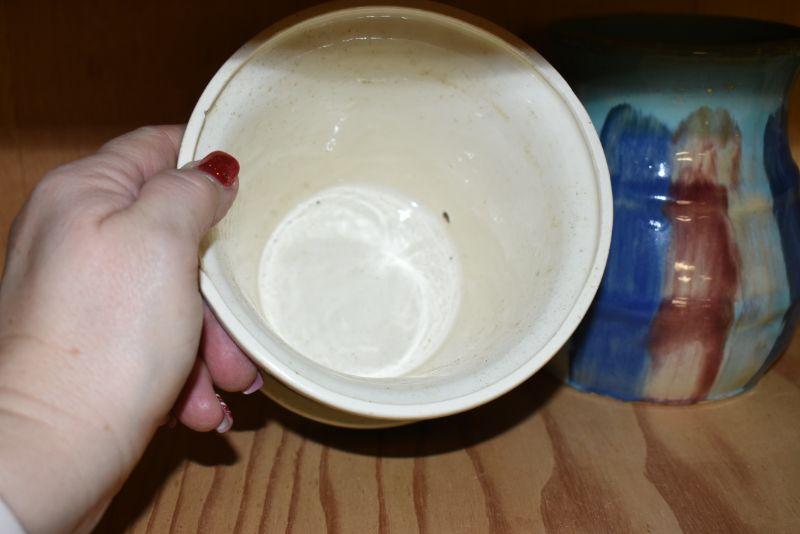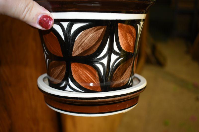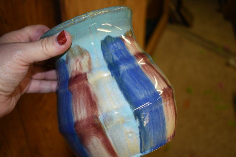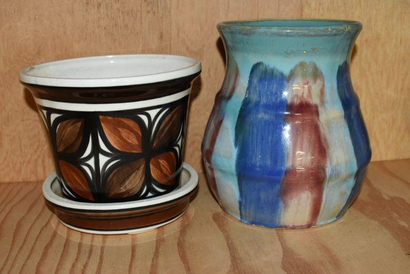A handpainted and signed flower pot with attached saucer, and multicolored vase. Located in basement, with steep and narrow cement steps going down, with a sharp turn at bottom.