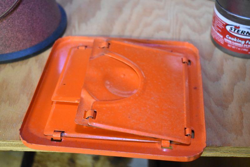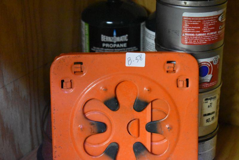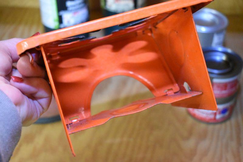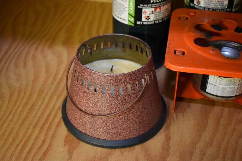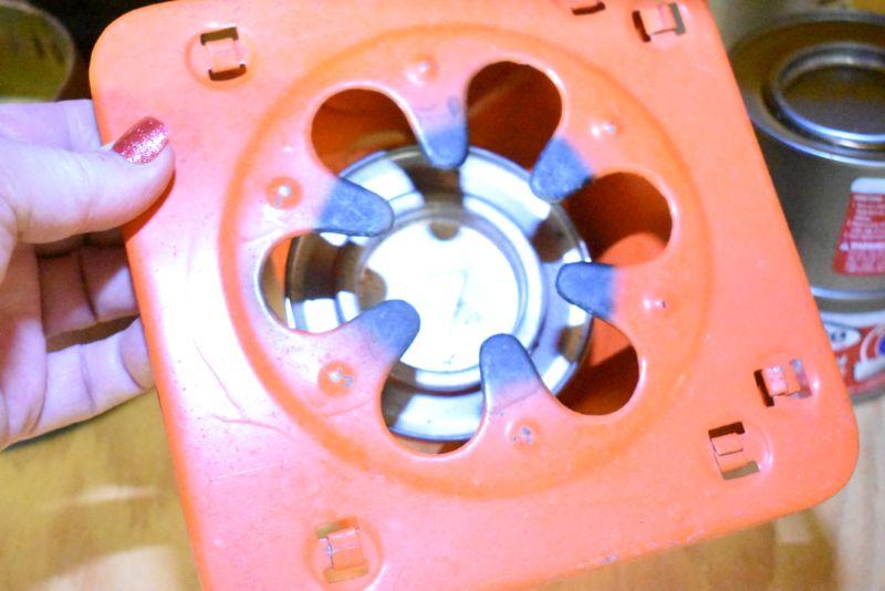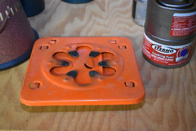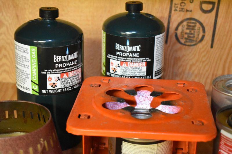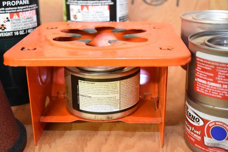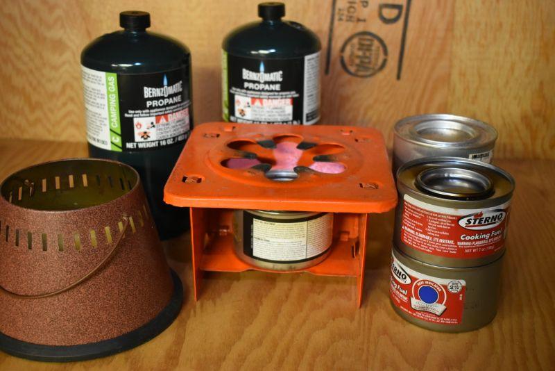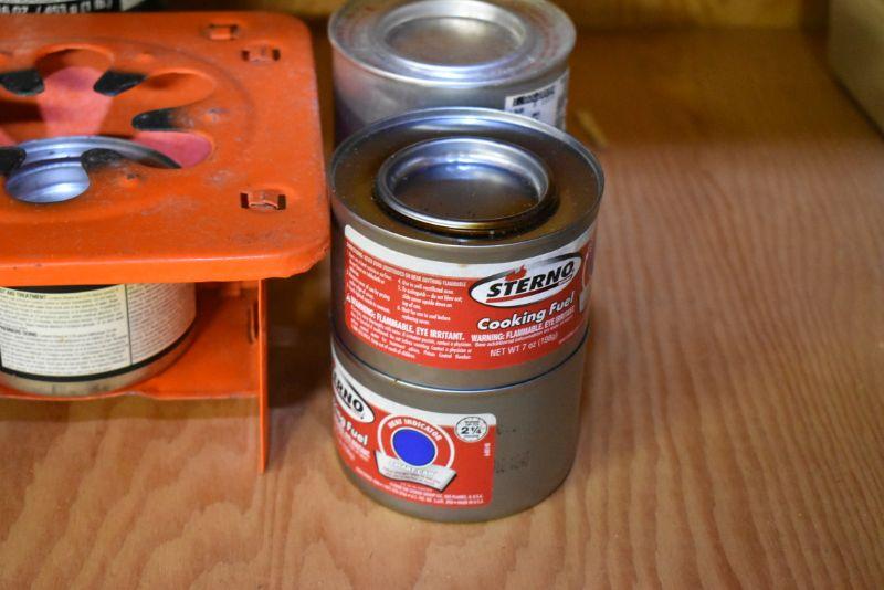 Portable stove comes with cooking fuel. Also a citrine candle. Bring container to remove. Located in basement that has narrow, steep, cement steps, and a sharp turn to right at bottom.