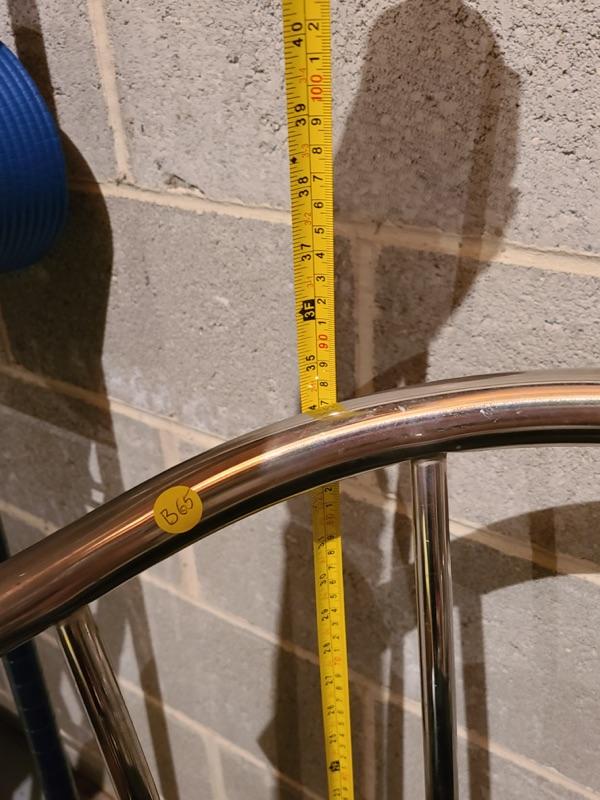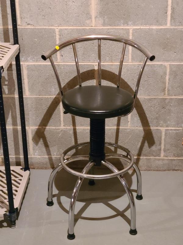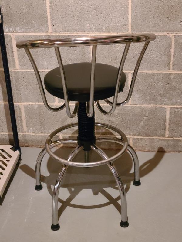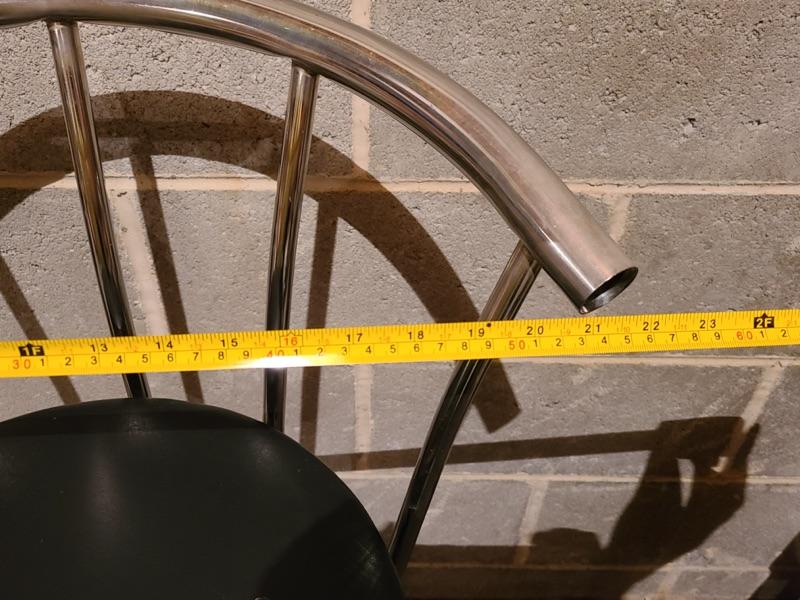 This chair measures about 3 feet tall. Sturdy, excellent pre-owned. Please see pictures for condition and sizing. Chrome and black pleather seat.