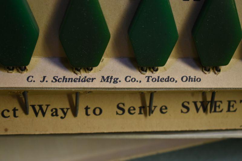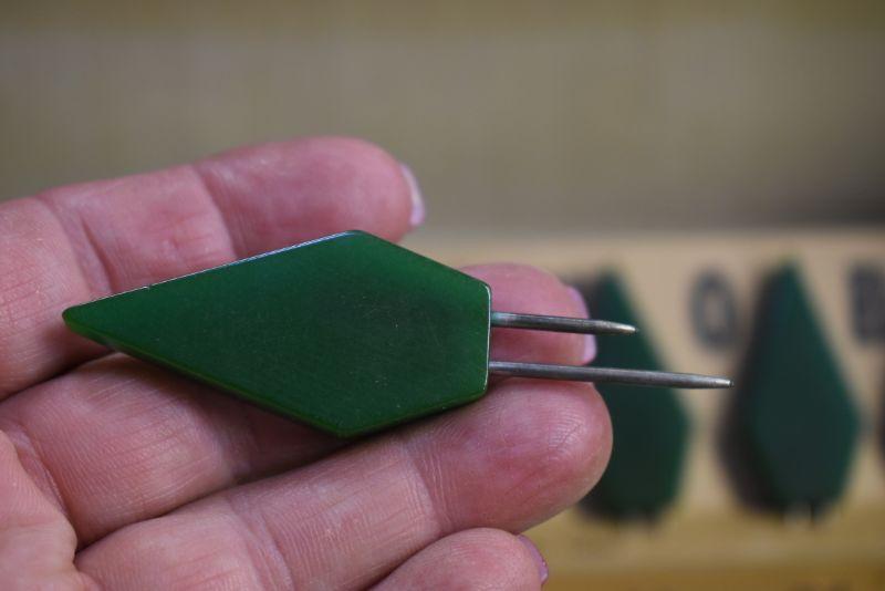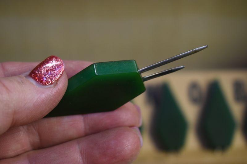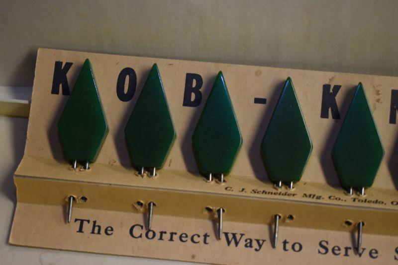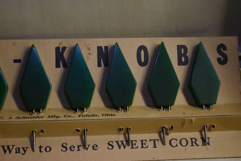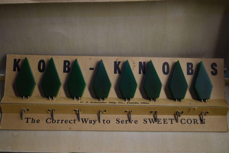 New Bakelite Cob Knobs corn holders. Located in basement that has narrow, steep, cement steps, and a sharp turn to right at bottom.