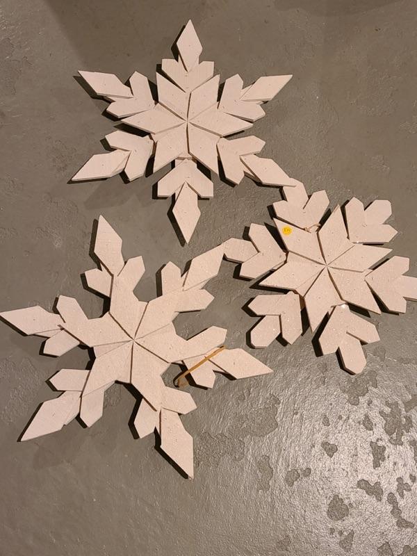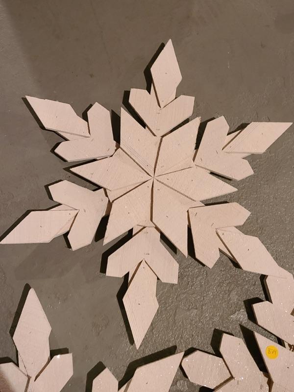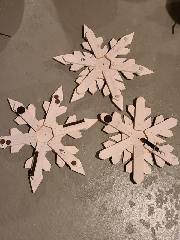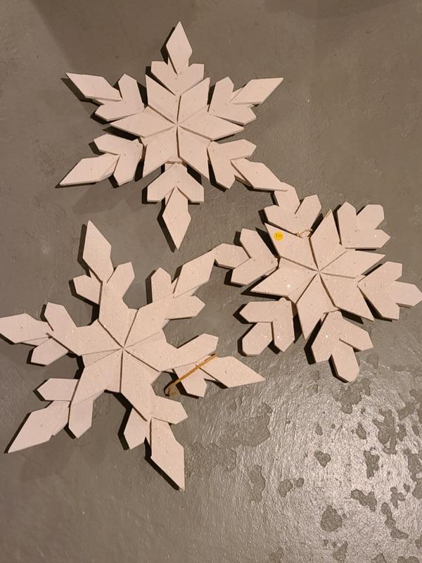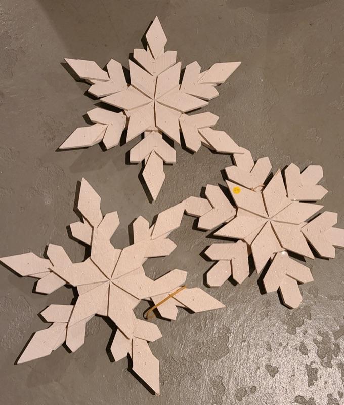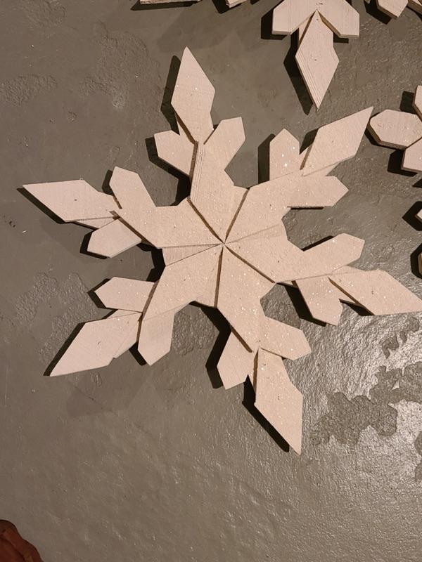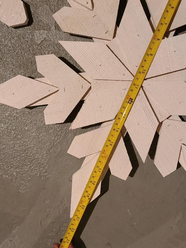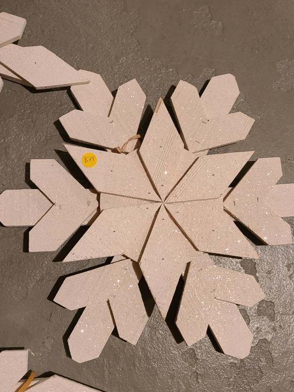 This is a fun lot of wood snowflakes that can hang inside or out! Each measures about a foot and a half long. Please see pics for condition and sizing.