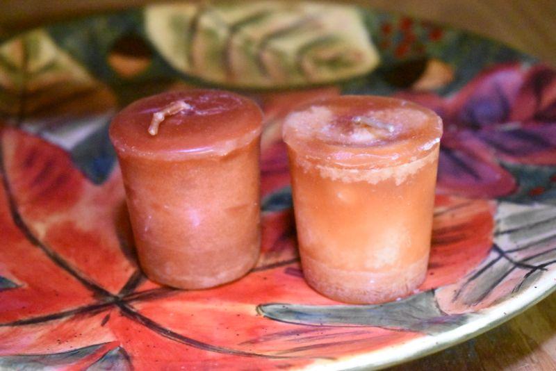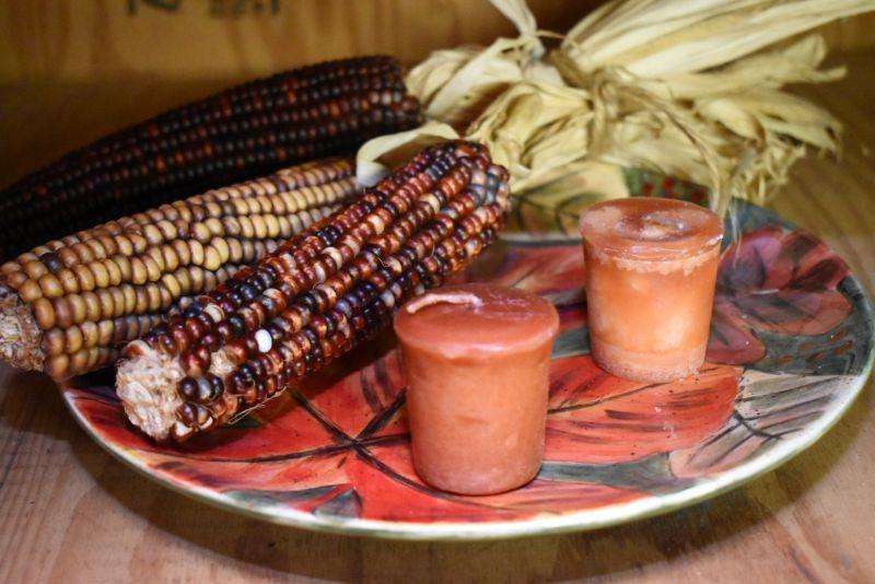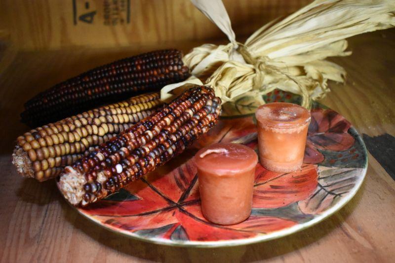 Indian corn, candles and a serving platter. No chips. Located in basement that has narrow, steep, cement steps, and a sharp turn to right at bottom.