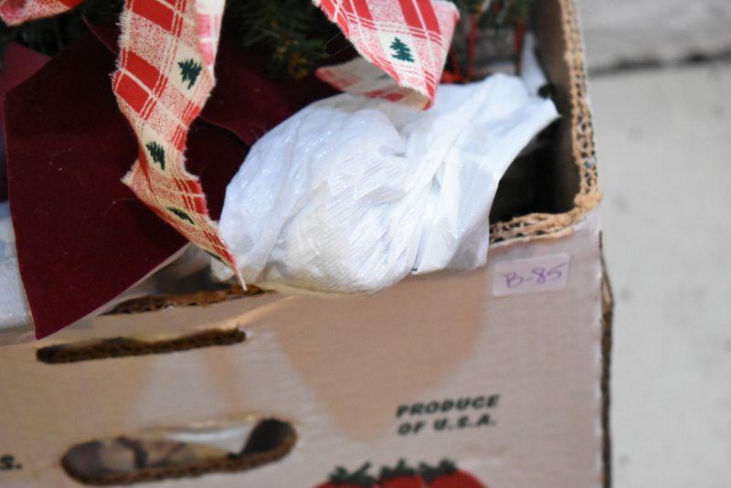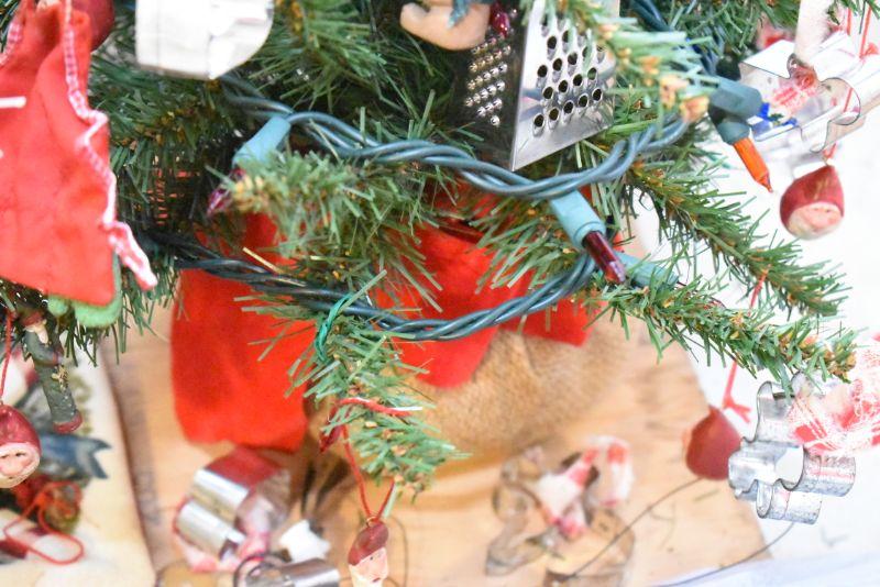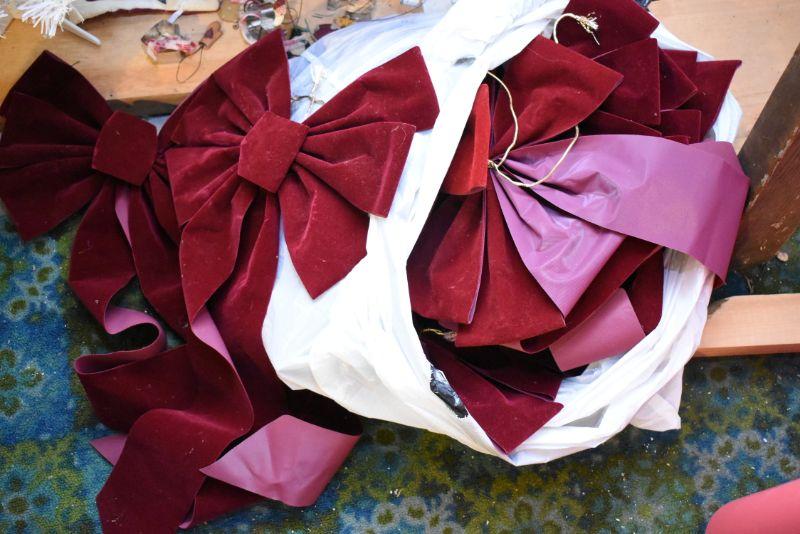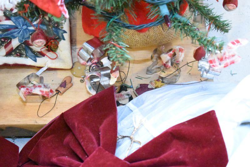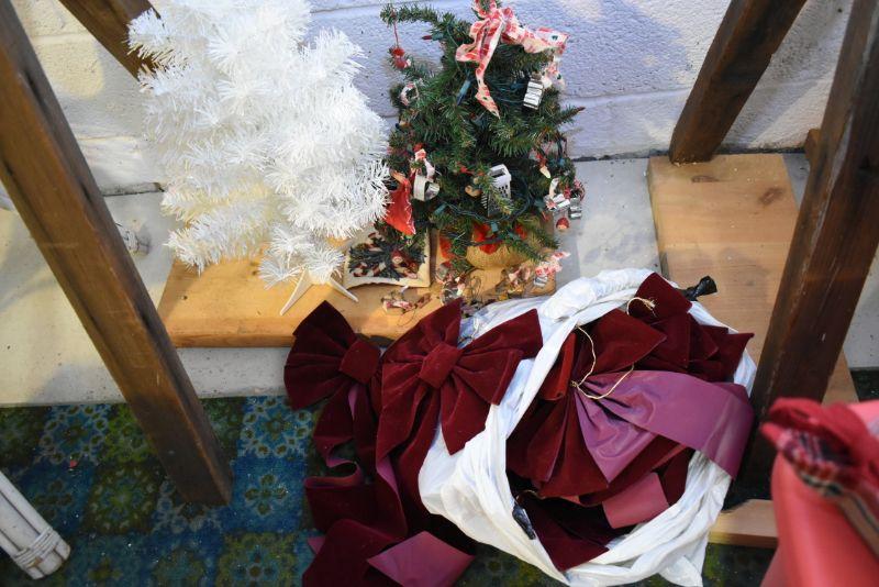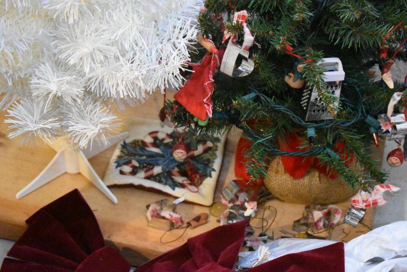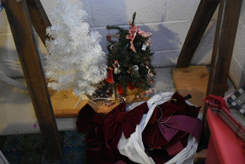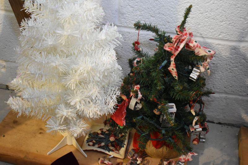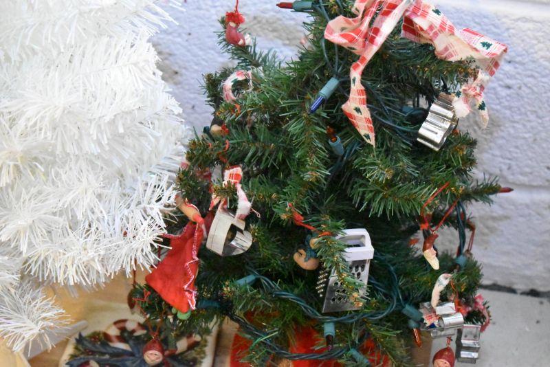 Table top Christmas trees, one is decorated with miniature cookie cutters and more. Also a bag of bows.