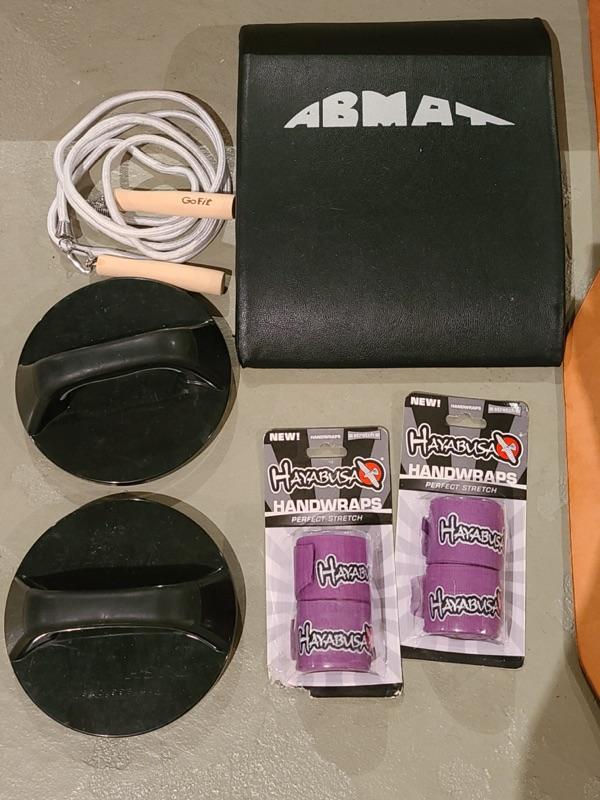 Lot of exercise equipment. Please see pics for condition and sizing.