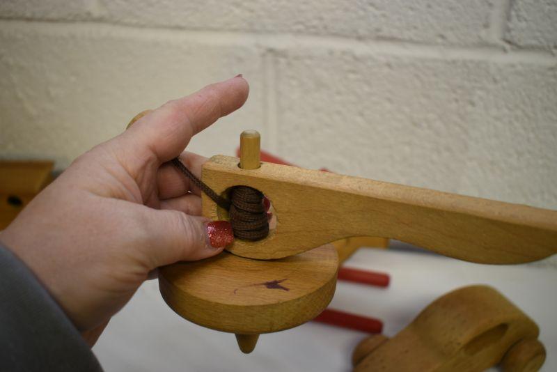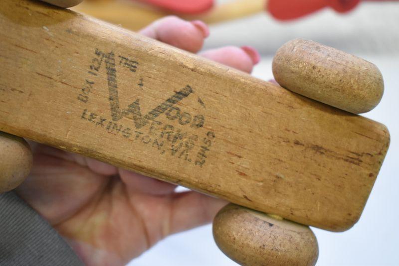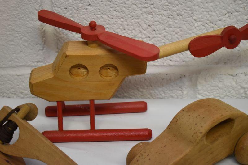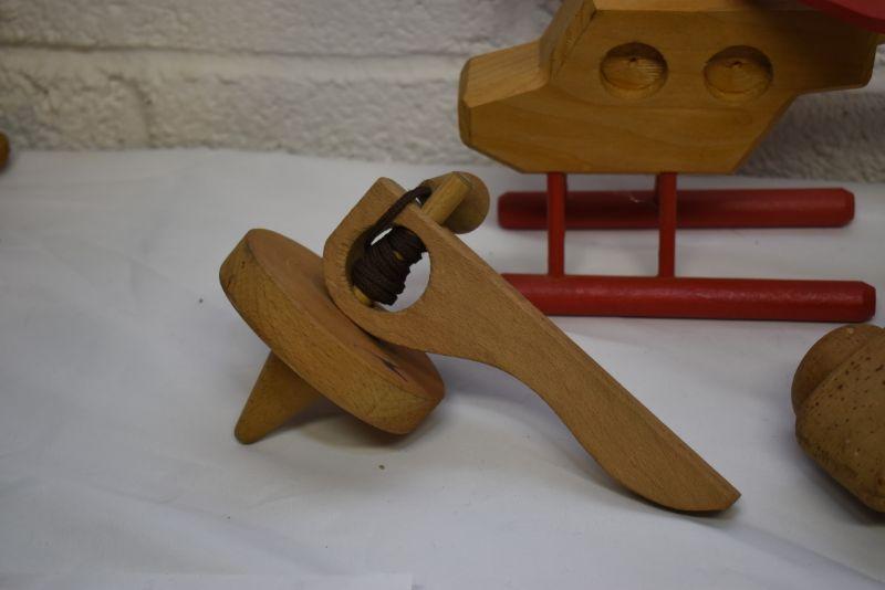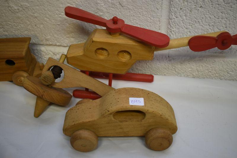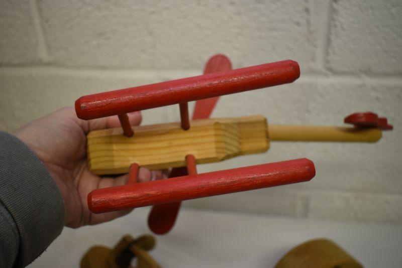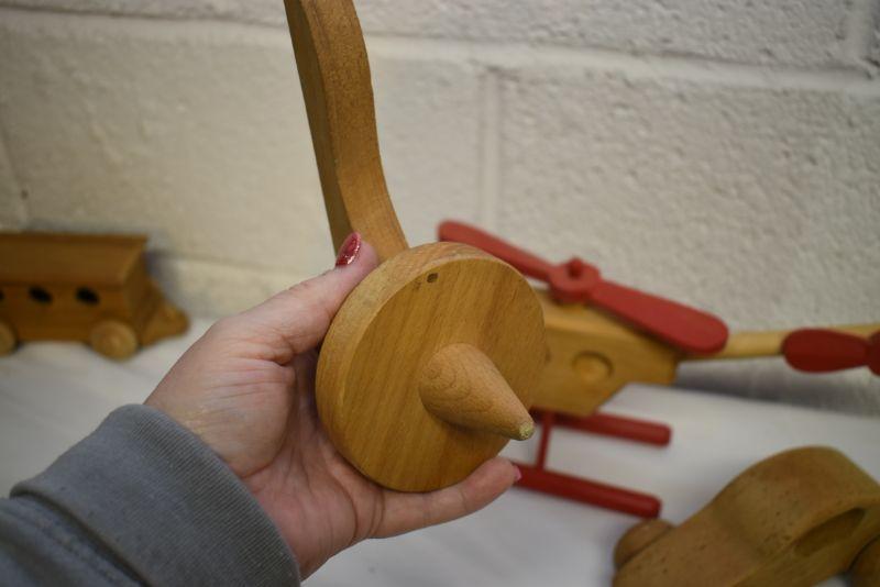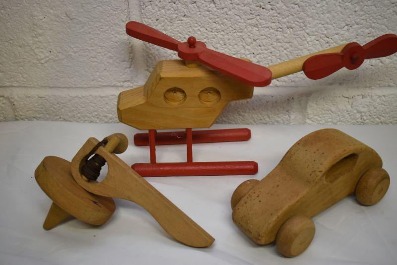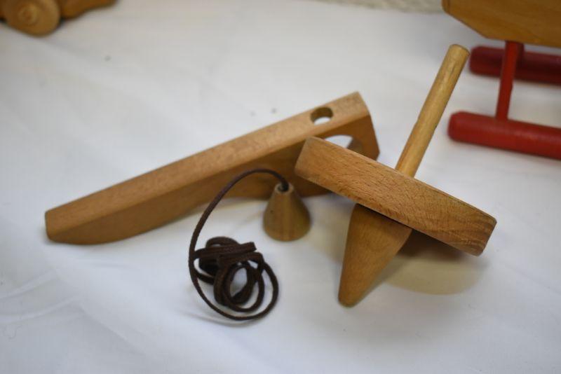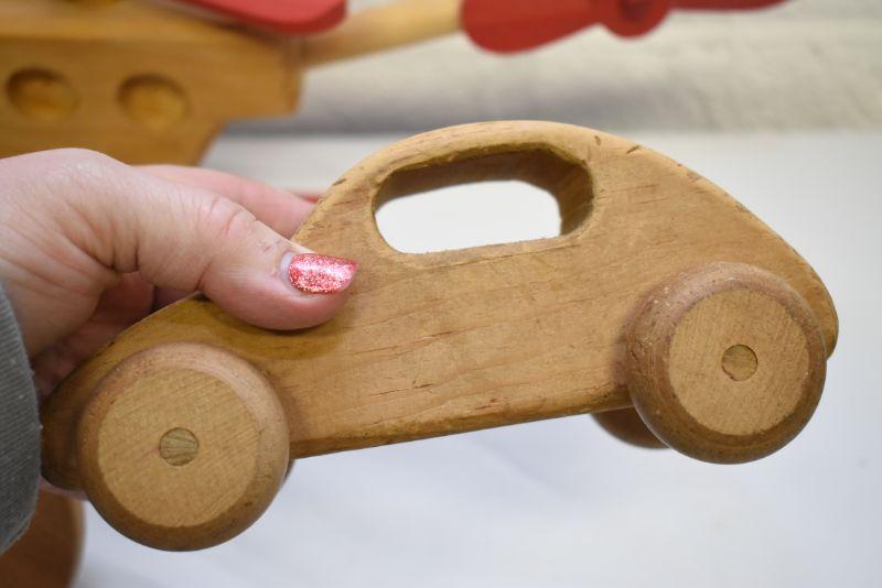 Wooden top, airplane and car. Located in basement that has narrow, steep, cement steps, and a sharp turn to right at bottom.
