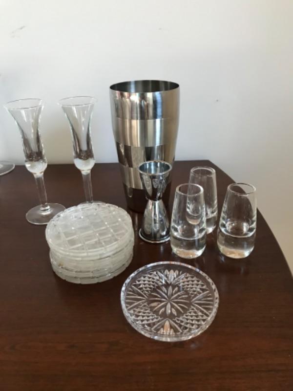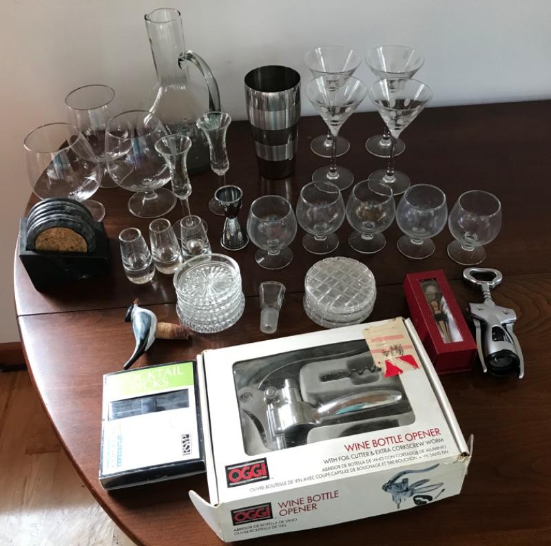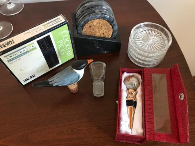 Assorted stemware, coasters, wine bottle openers, wine bottle stoppers and more