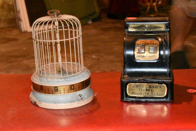 Singing bird in a cage music box. Switch is missing to turn it on. Uncle Sam's Dime Bank. Has a dent in front. Untested.