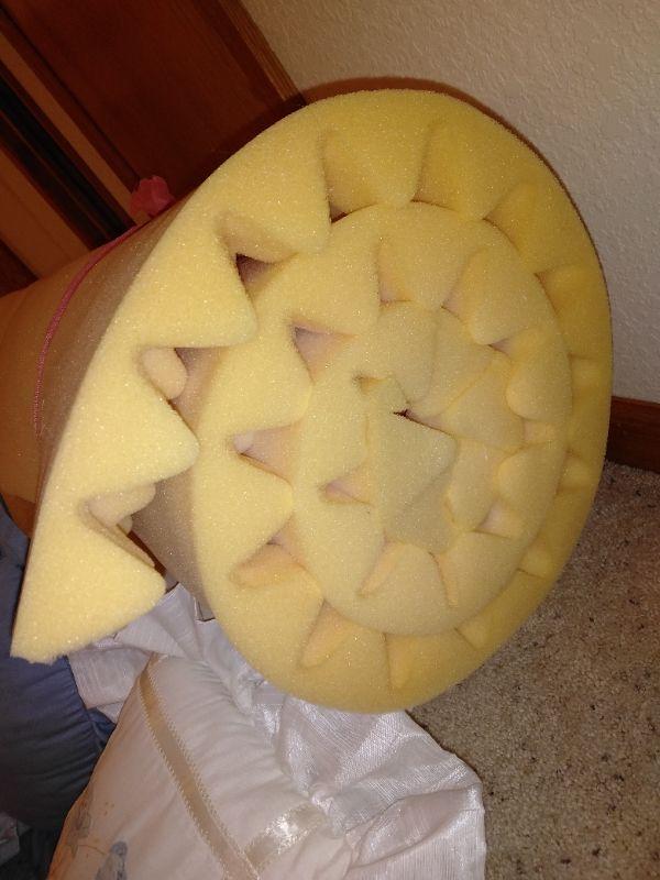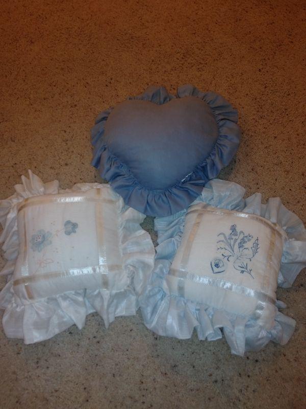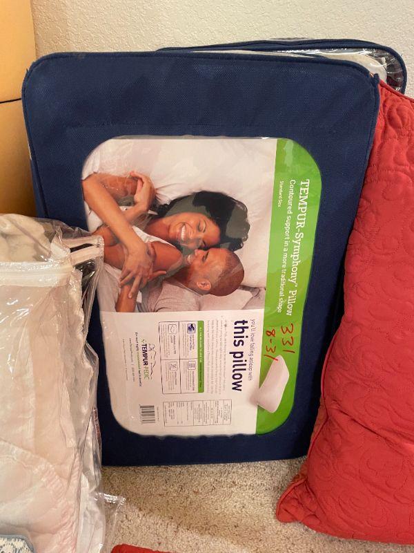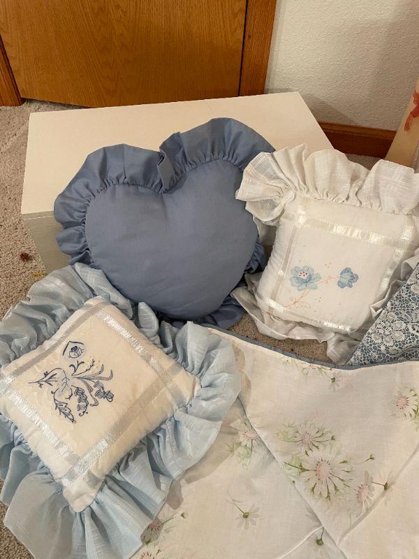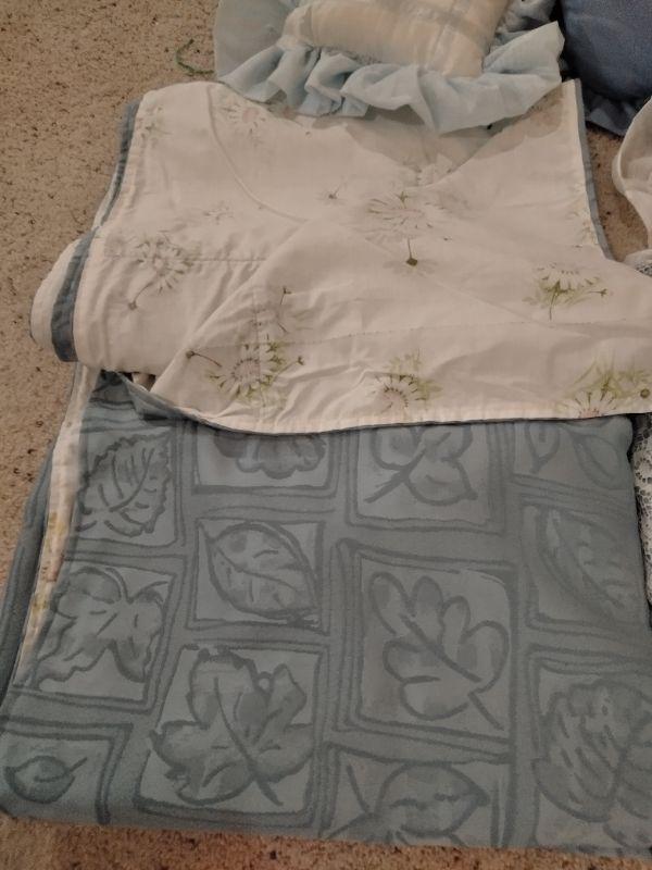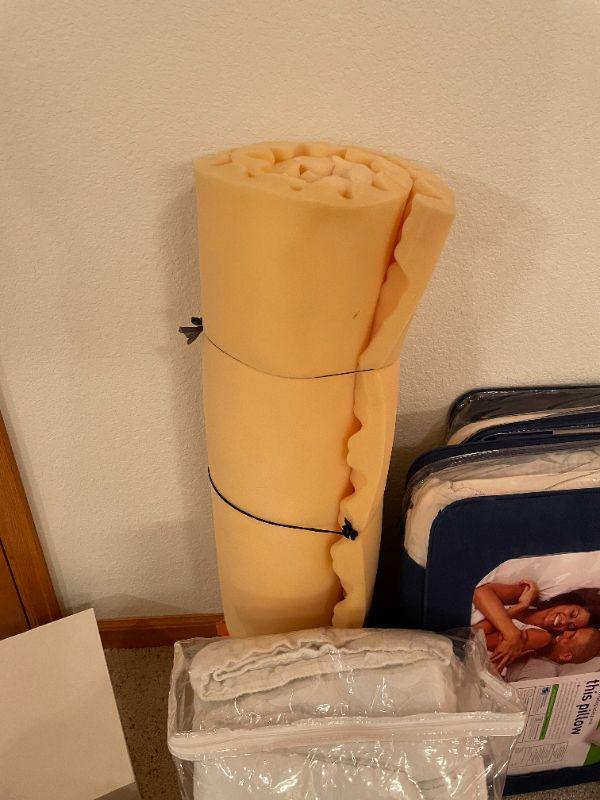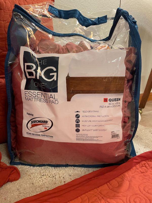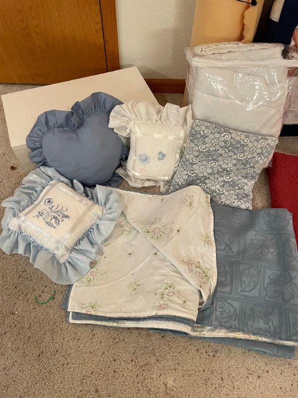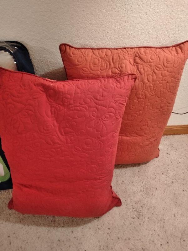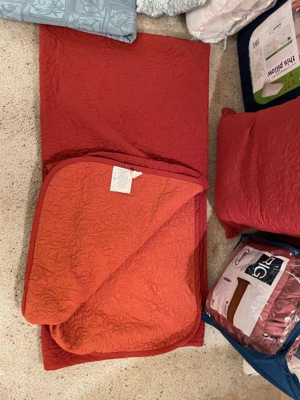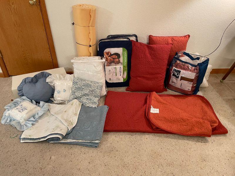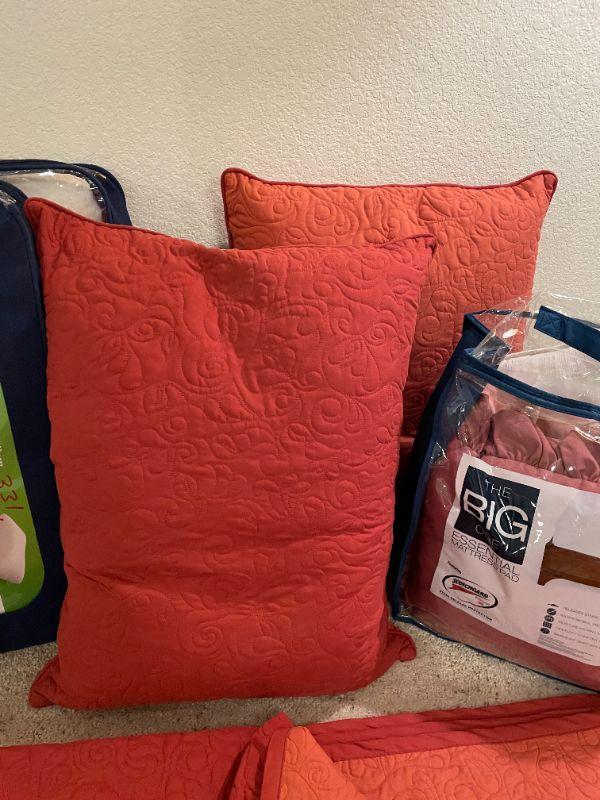 BEDDING INCLUDING FOUR PILLOWS, TWO BEADSPREADS, ONE ORANGE AND RED 92" X 92", AND ONE BLUE WITH SHEET SEWN INSIDE. SMALL THROW PILLOWS, EGG CRATE MATTRESS PAD, AND MATTRESS PROTECTOR.